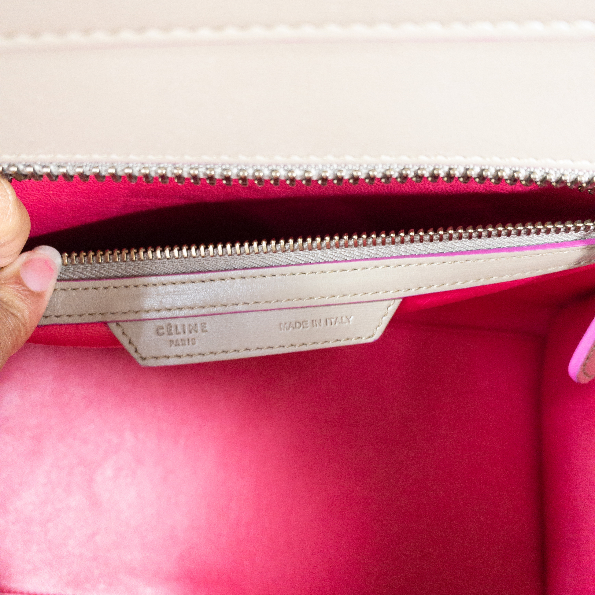 This is an authentic Celine Mini Luggage in the smooth leather. Taupe exterior with hot pink trim and interior. Double rolled top handles with front zipped pocket. Zip top closure with microfiber interior lining. Large interior cavity with zipped pocket inside. Hot pink interior