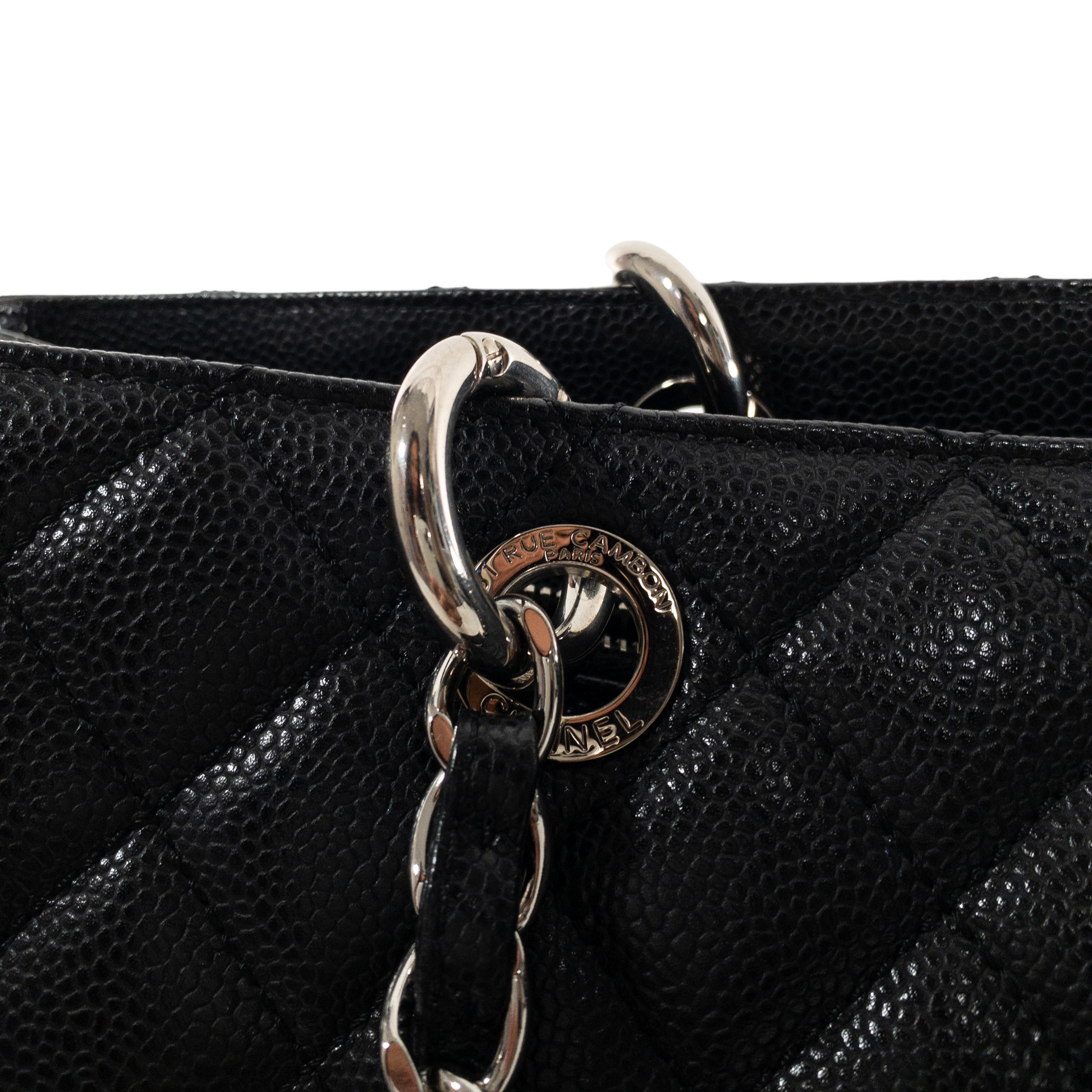 This is an Authentic Chanel XL Grand Shopping Tote or GST. Black quilted Caviar leather exterior with two woven leather chain handles. Interior lined with gray satin, with two interior compartments. One zipped compartment in the middle