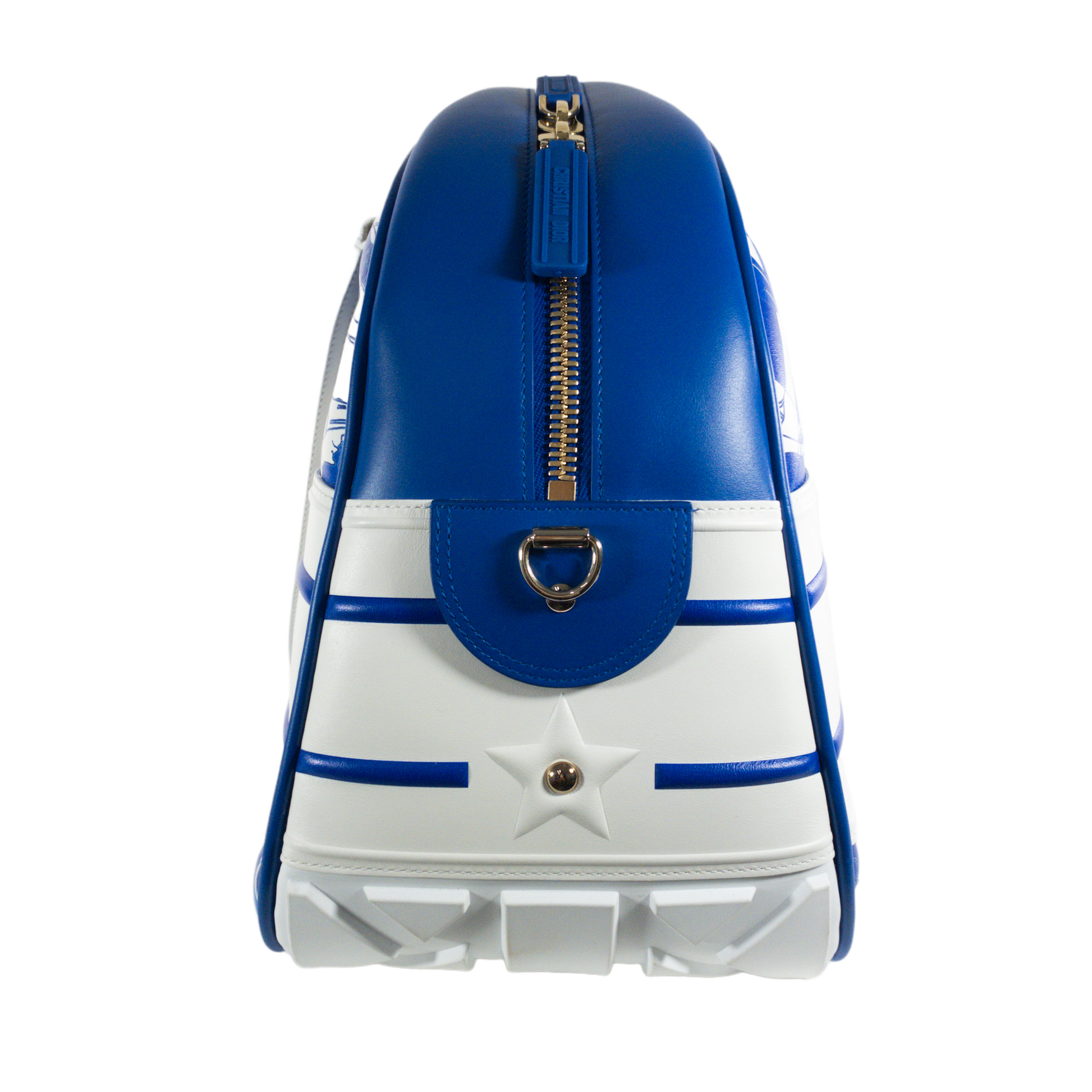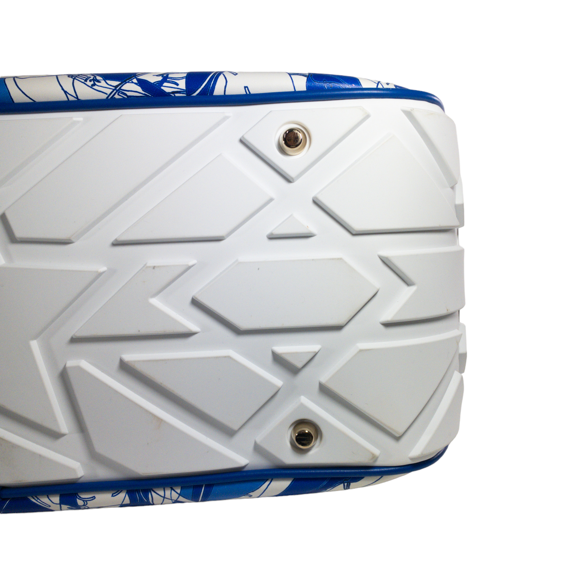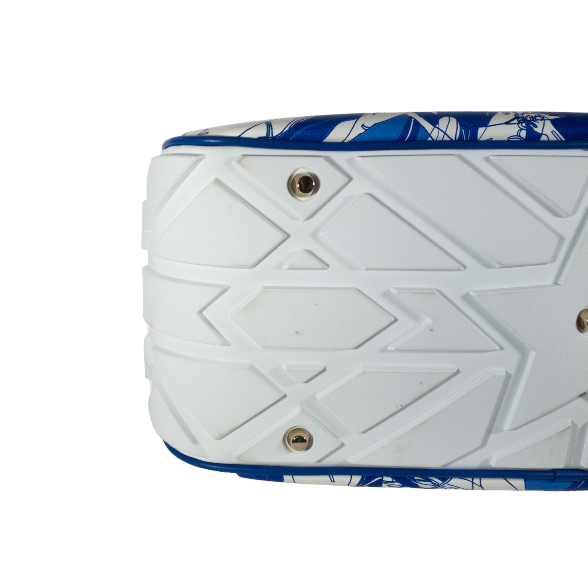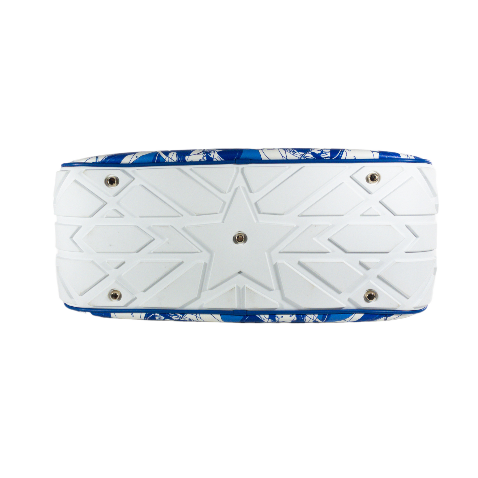 This is an authentic Dior Vibe Bowling Bag in size Large. Blue and white printed leather with rubber treaded base. Zip top opening. Two wrapped leather handles. Lined with beige fabric.