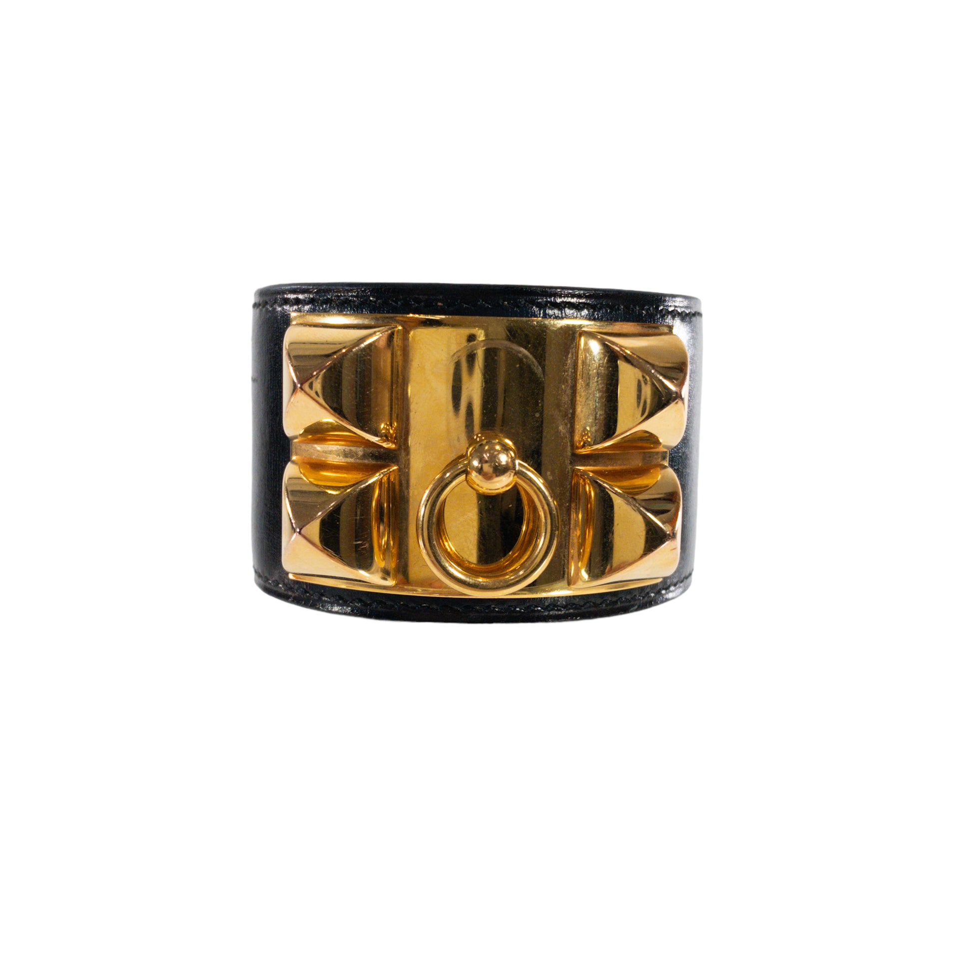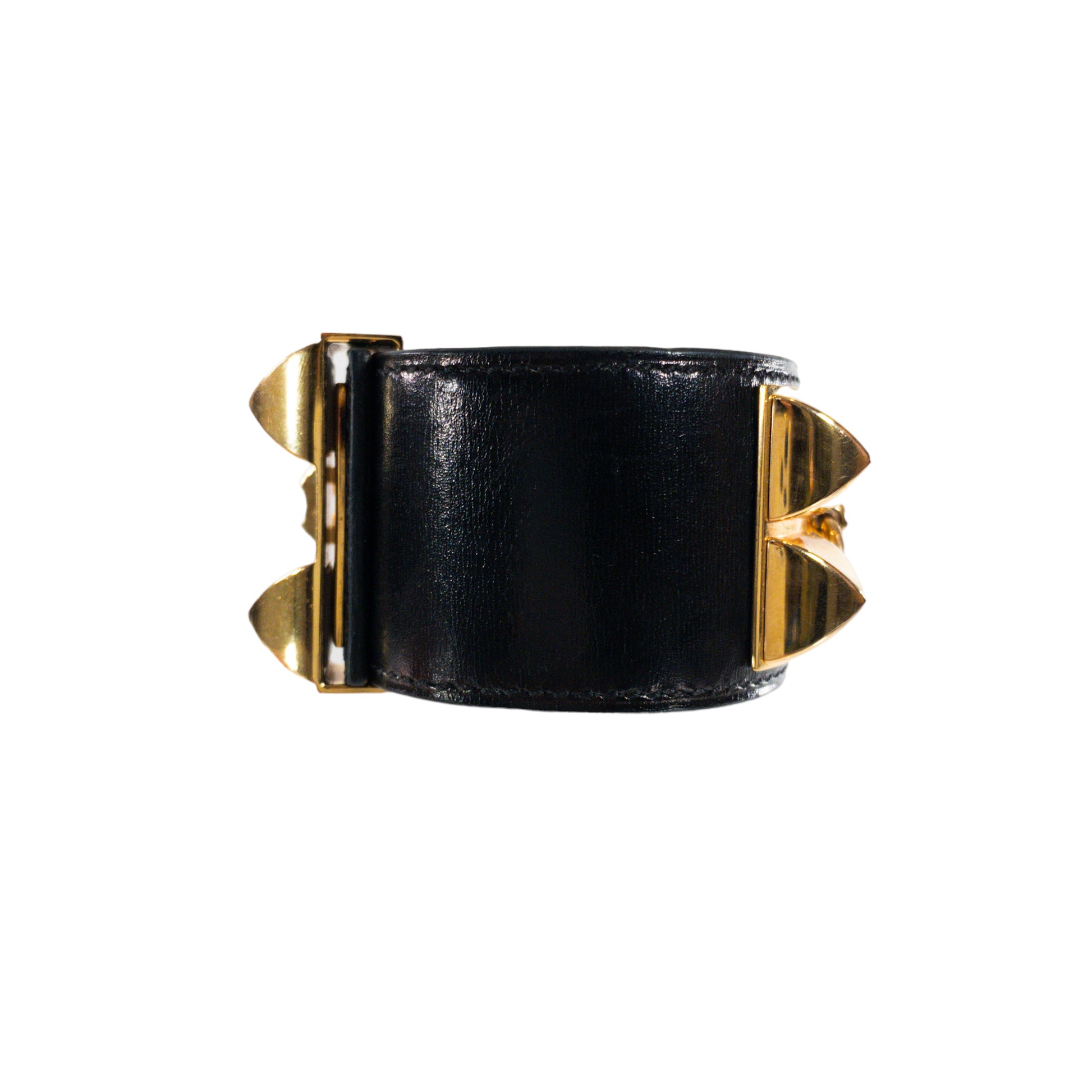 This is an authentic Hermès Collier de Chien or 'CDC' bracelet. This cuff features black leather and gold hardware with classic Hermes stud detail.