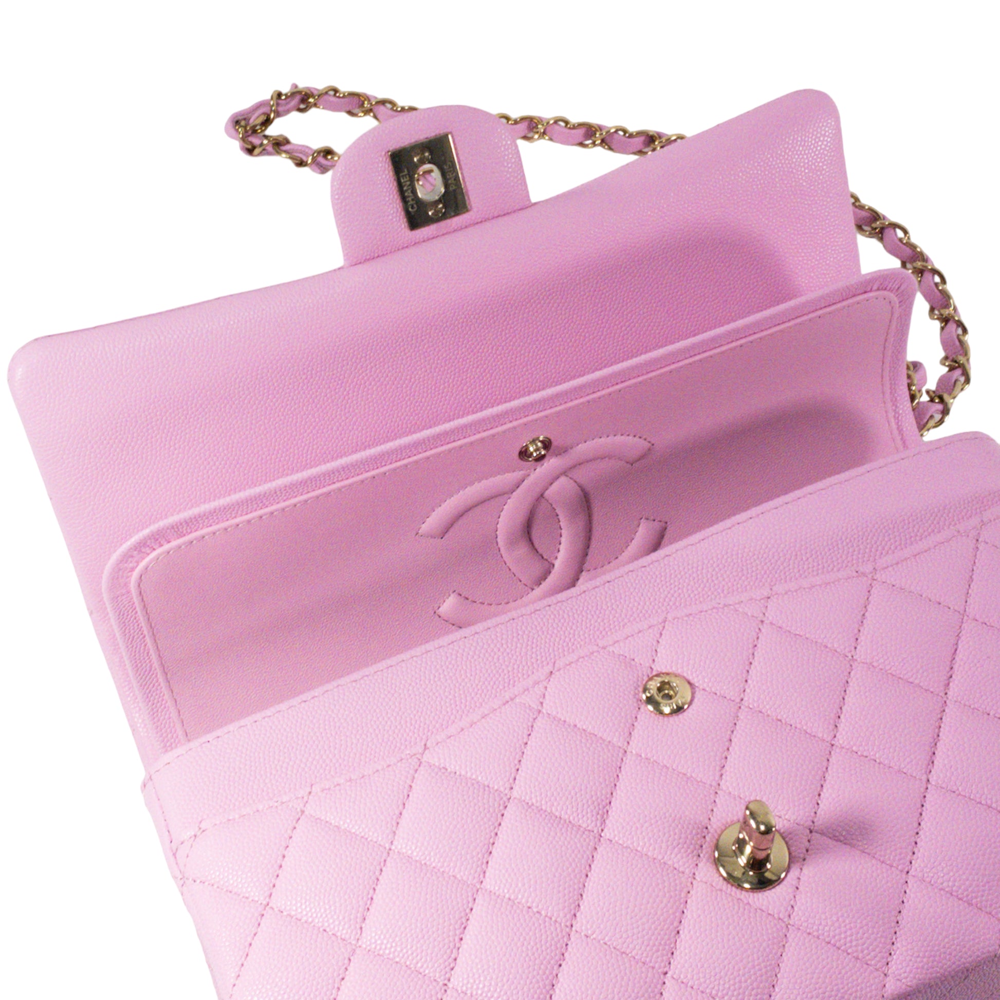 This is an authentic Chanel Medium Classic Flap. The bag has a flap closure with a Double C logo turn lock. The interior is leather and includes one slip pocket and one zip pocket, it also has one exterior pocket on the back side. The strap is woven leather and metal and allows for shoulder carry.