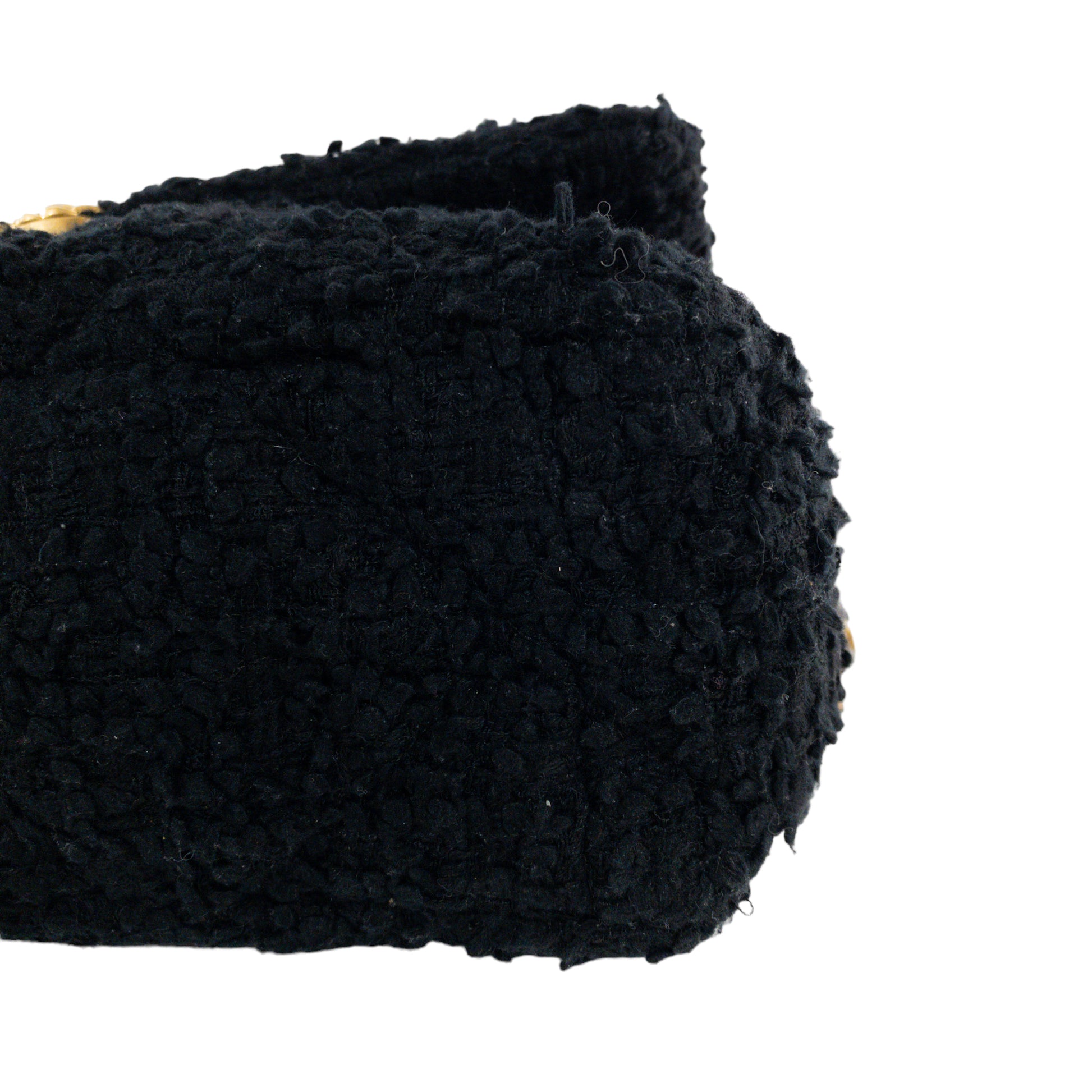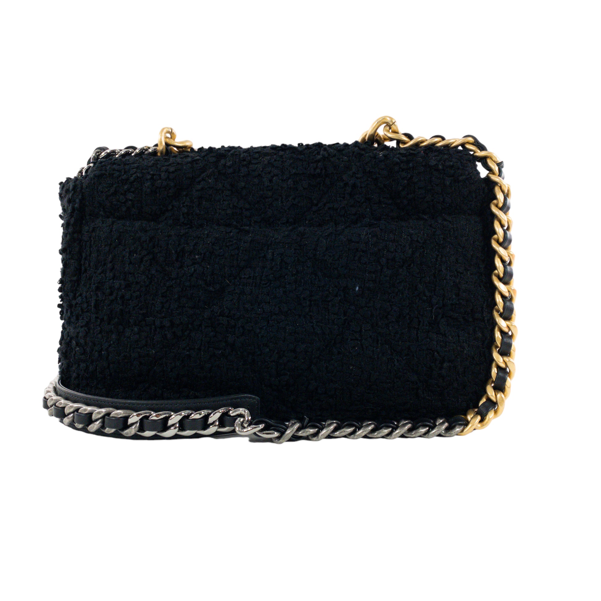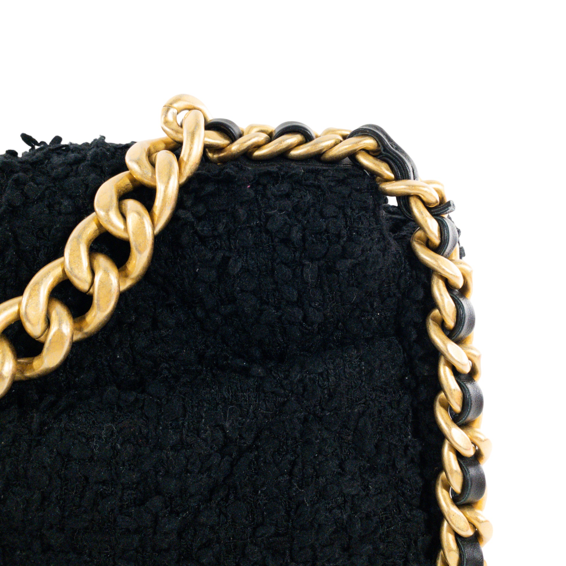 This is an authentic Chanel large 19. Black tweed exterior with large quilting and front flap. Woven leather chain CC turn clasp. Large spacious pocket in back with chain top handle and long chain shoulder strap. Interior is lined with fabric with zipped pocket.