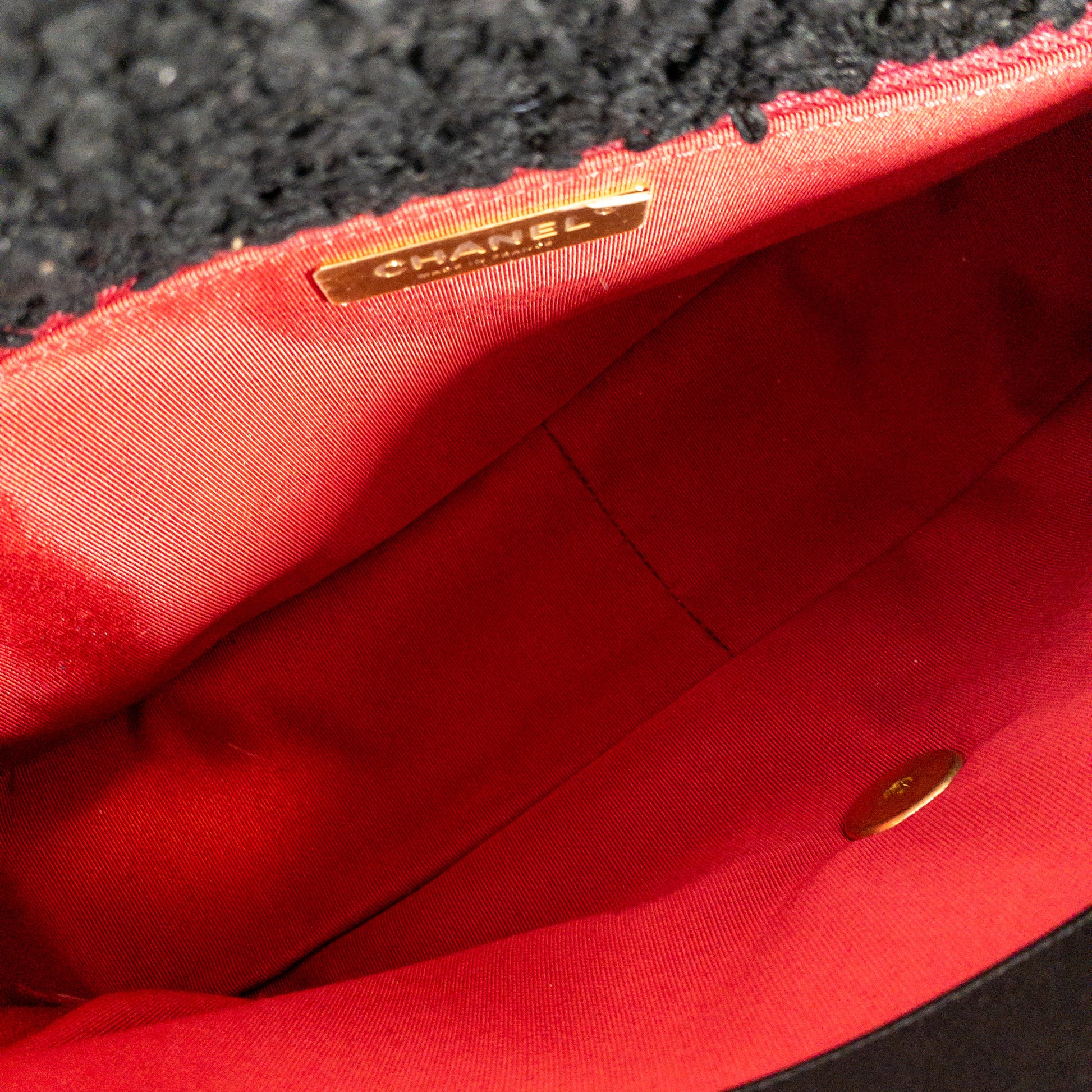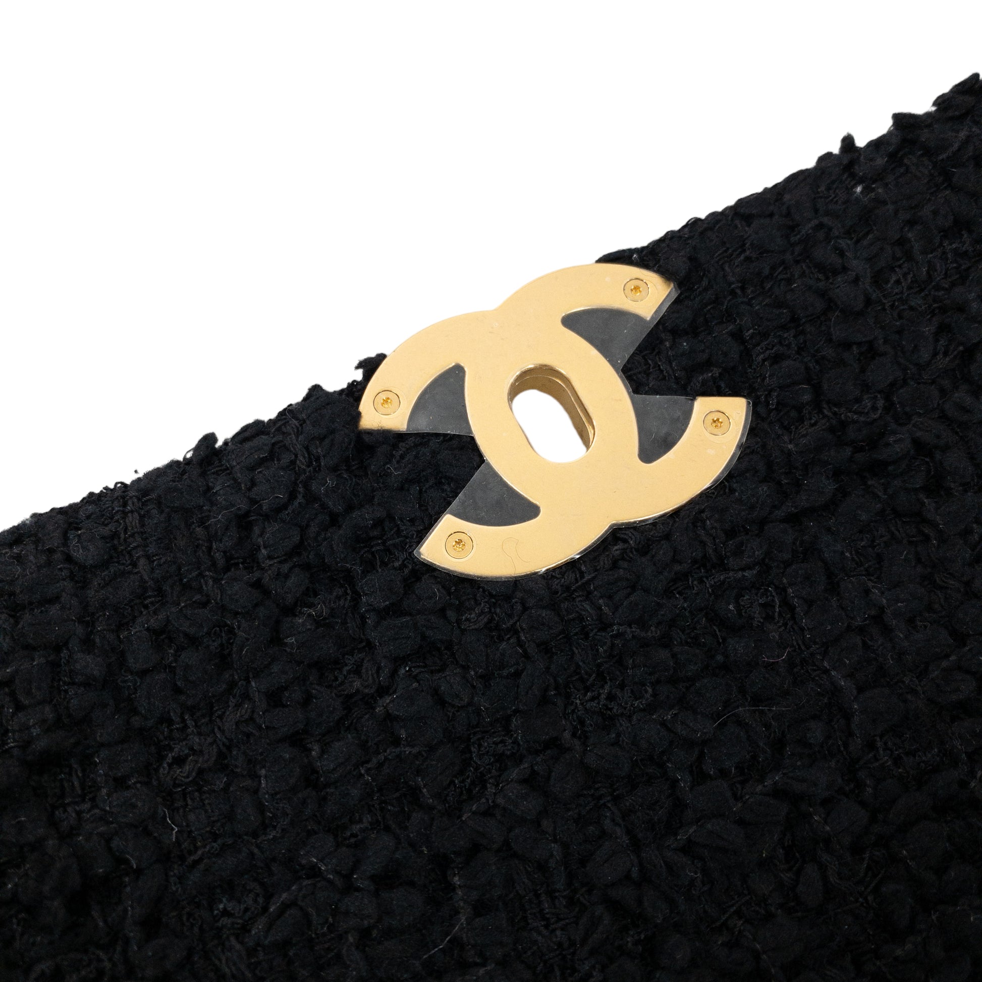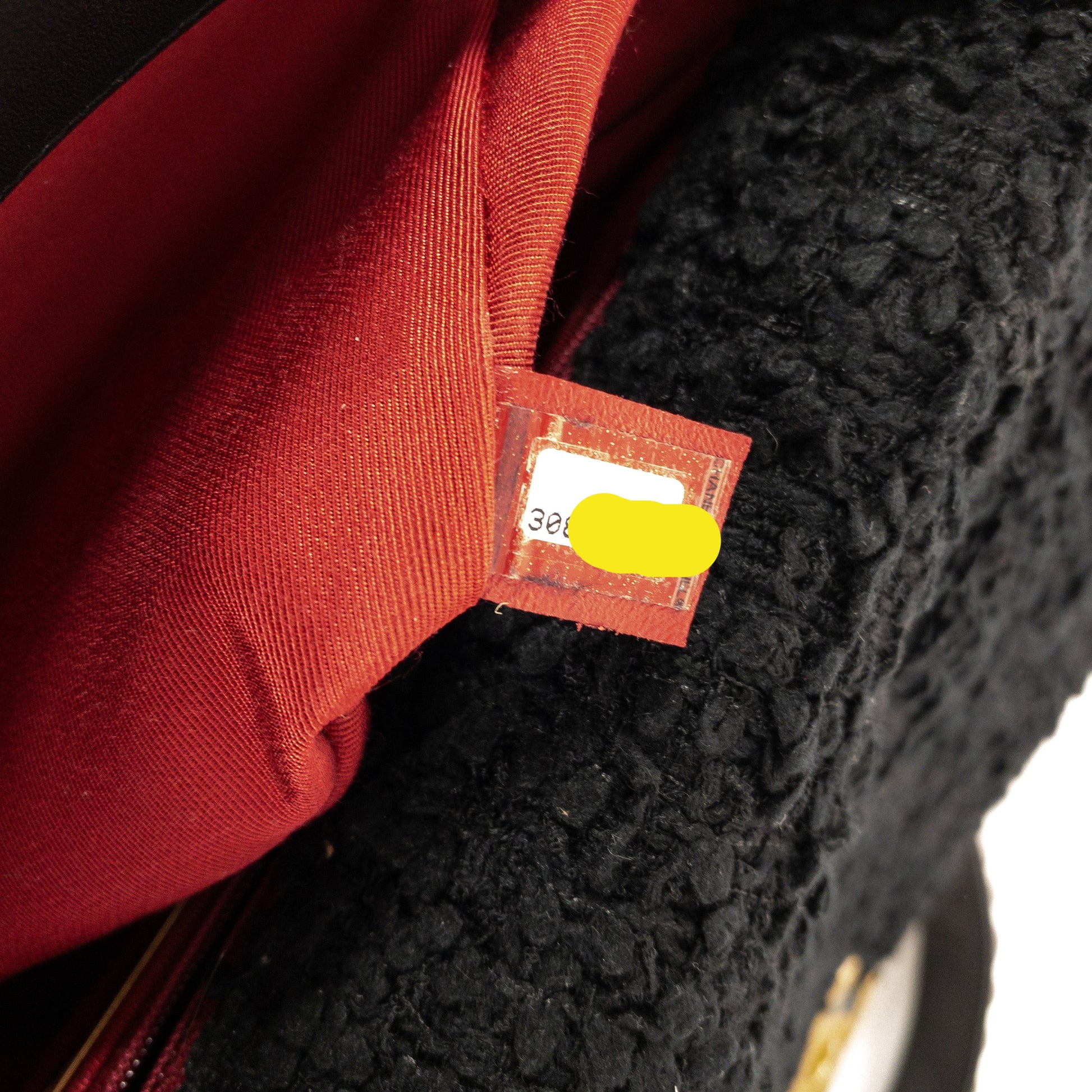 This is an authentic Chanel large 19. Black tweed exterior with large quilting and front flap. Woven leather chain CC turn clasp. Large spacious pocket in back with chain top handle and long chain shoulder strap. Interior is lined with fabric with zipped pocket.