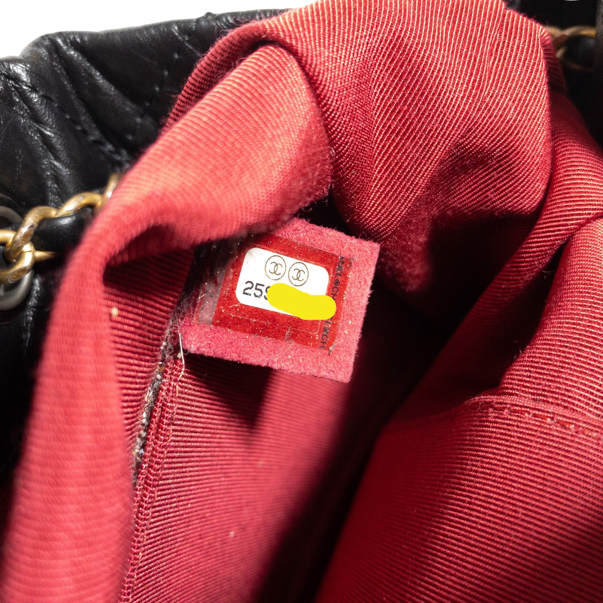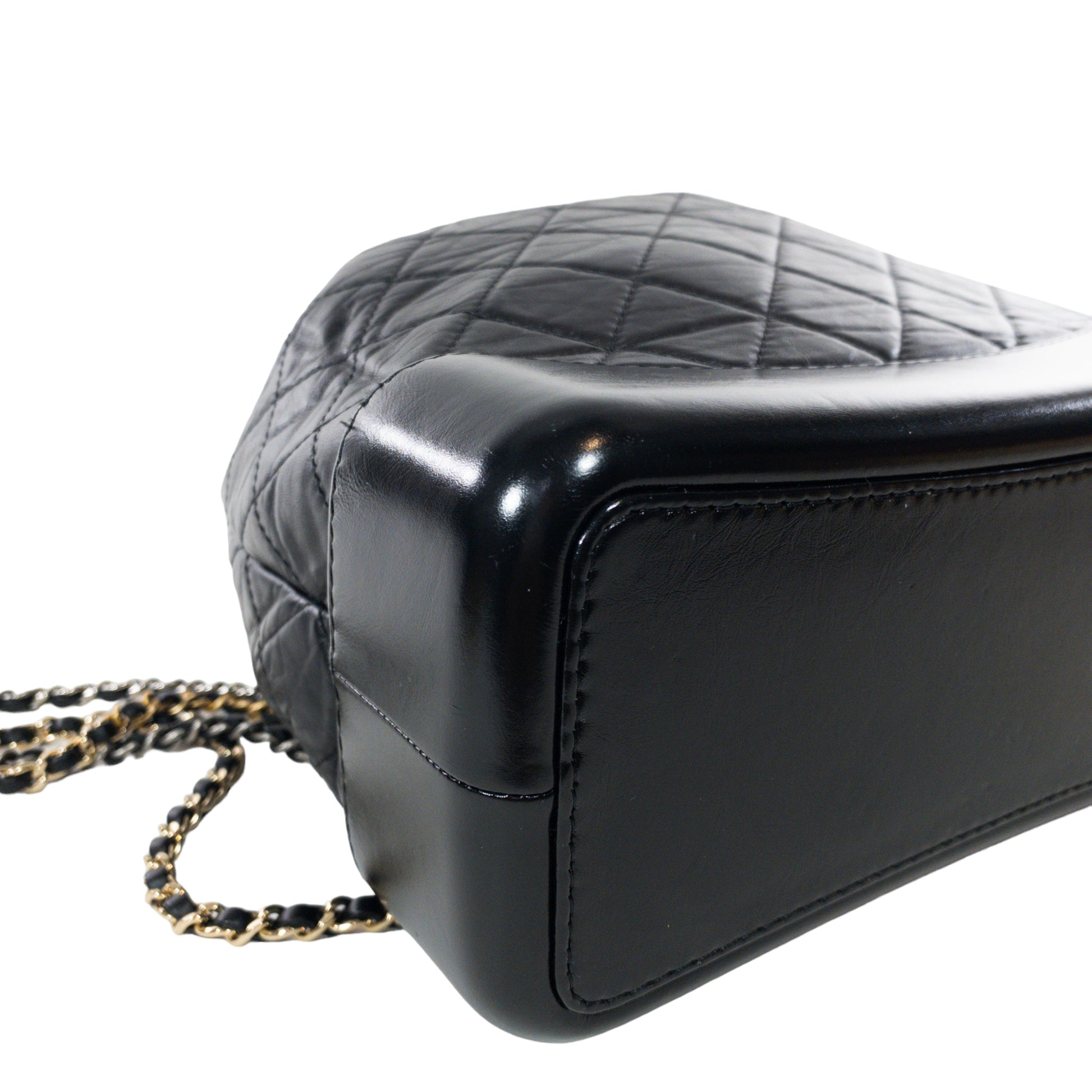 This is an authentic Chanel Gabrielle small drawstring backpack. Black quilted leather with glazed structured base. Multicolor woven chain hardware. Ruthenium CC in front. Lined with red fabric.