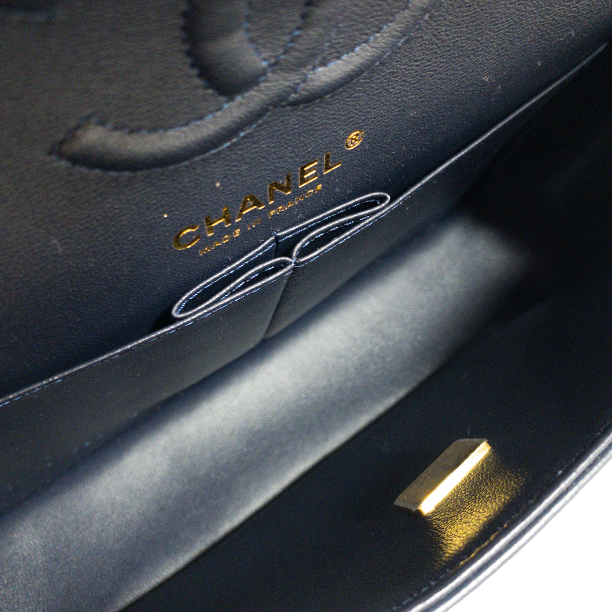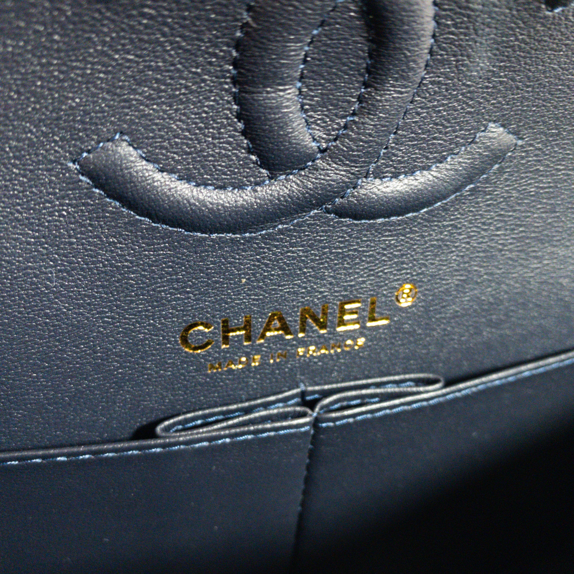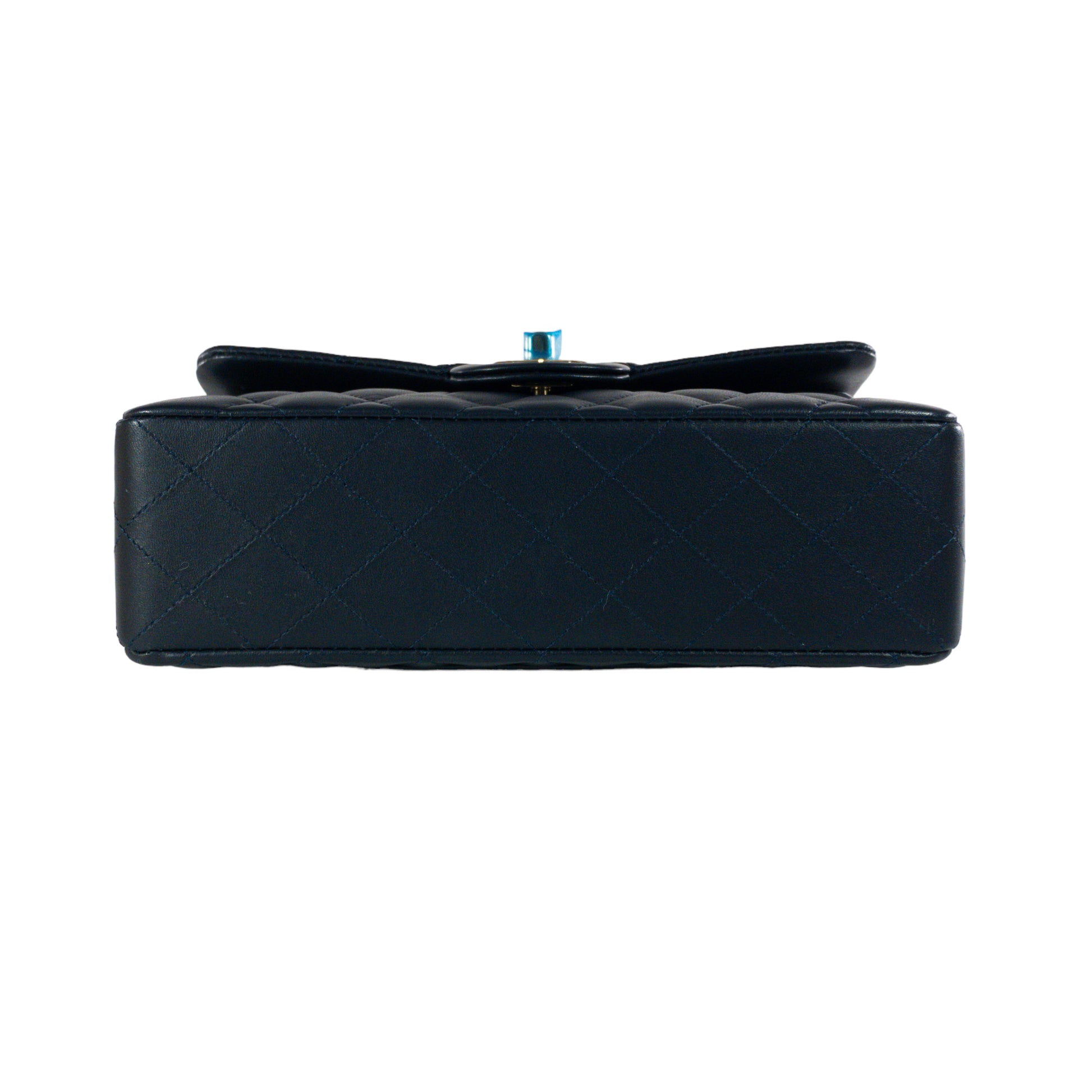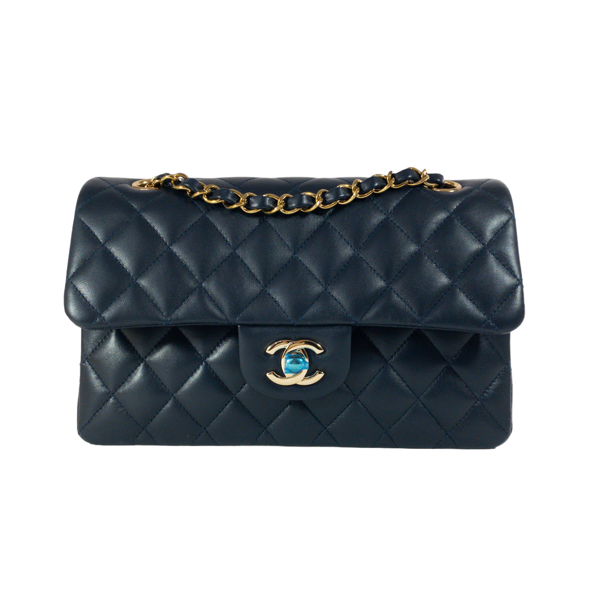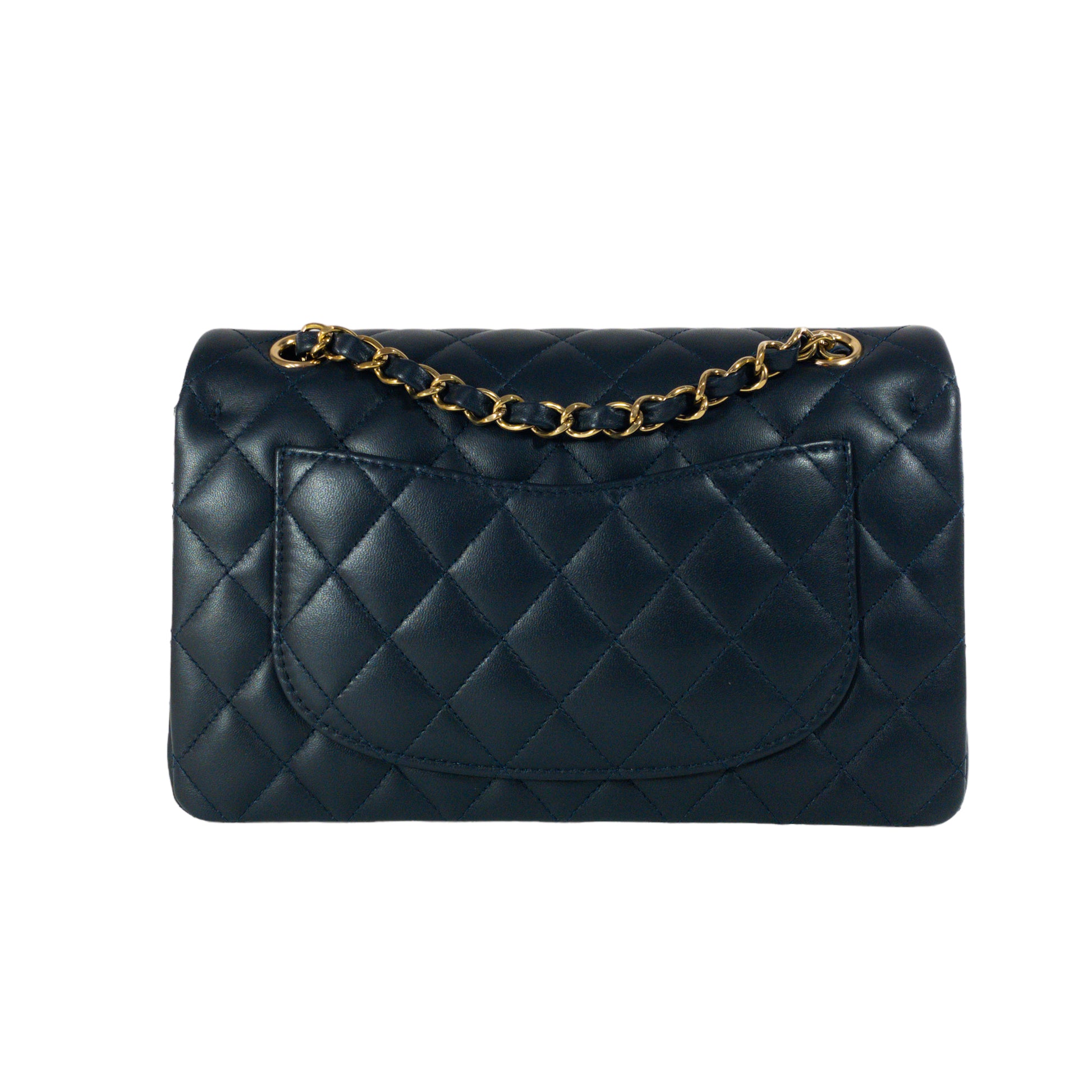 This is an authentic Chanel small classic flap in navy lambskin. Gold hardware. Double flap with several interior pockets. Woven chain strap, can be worn doubled or singled.