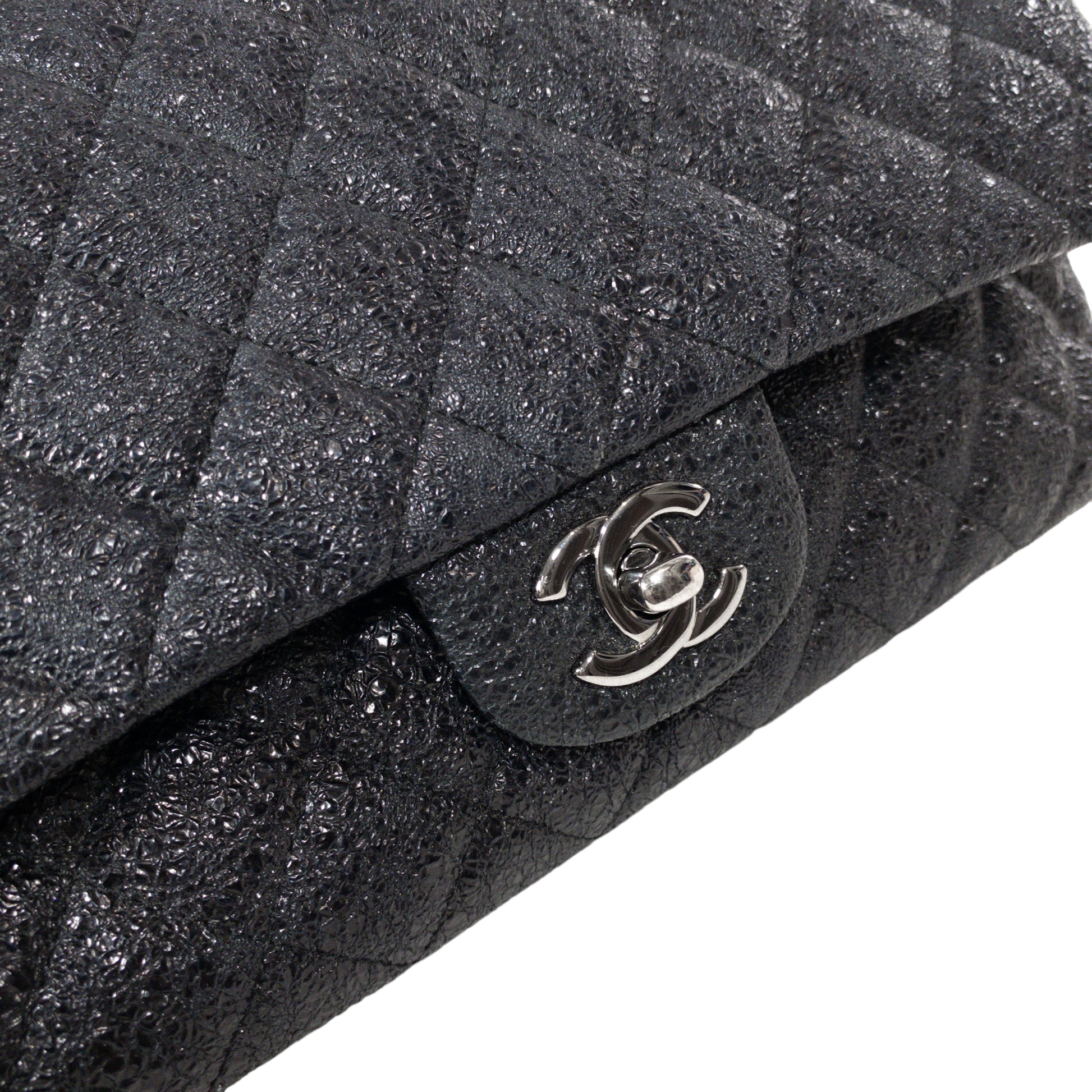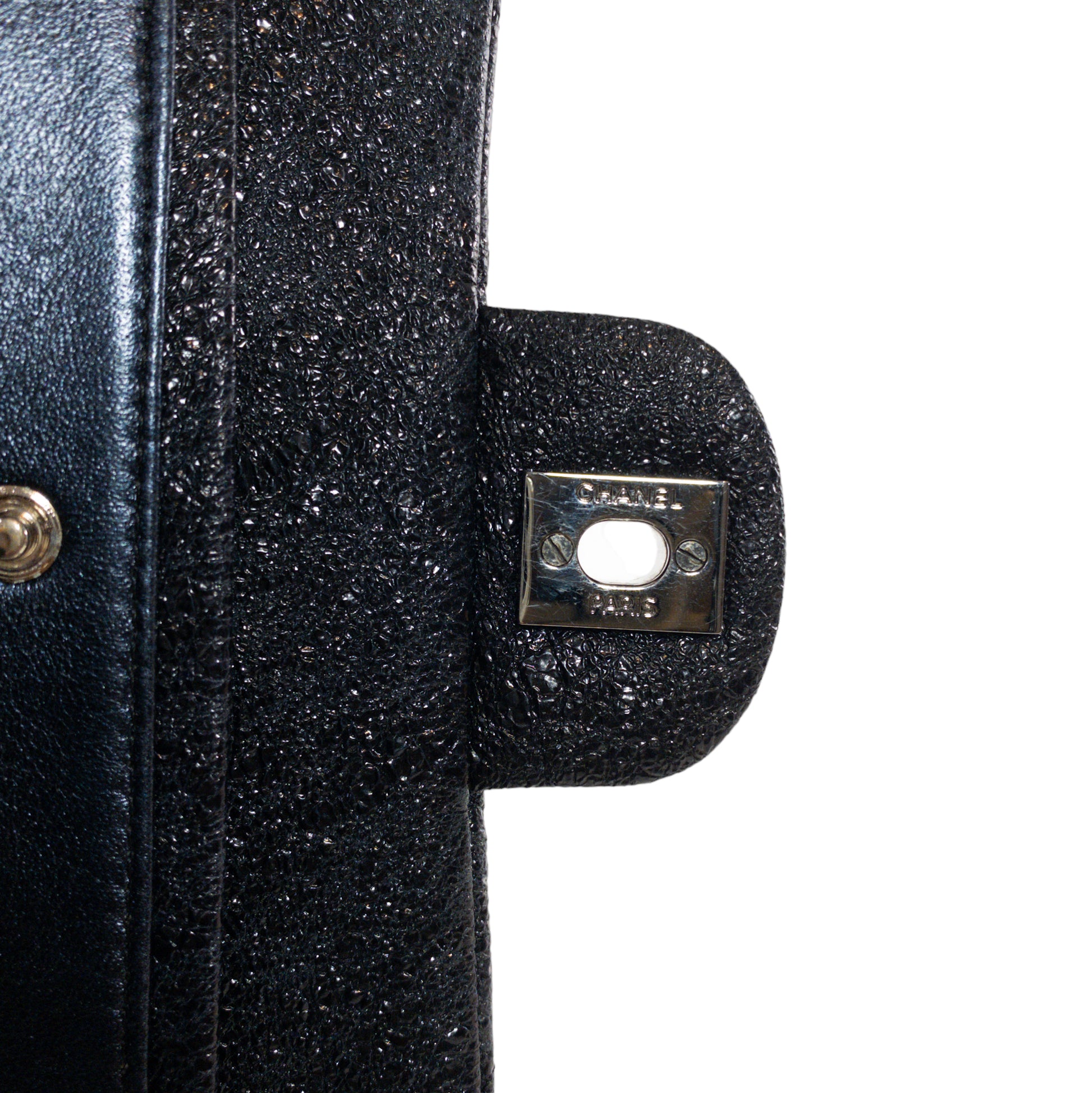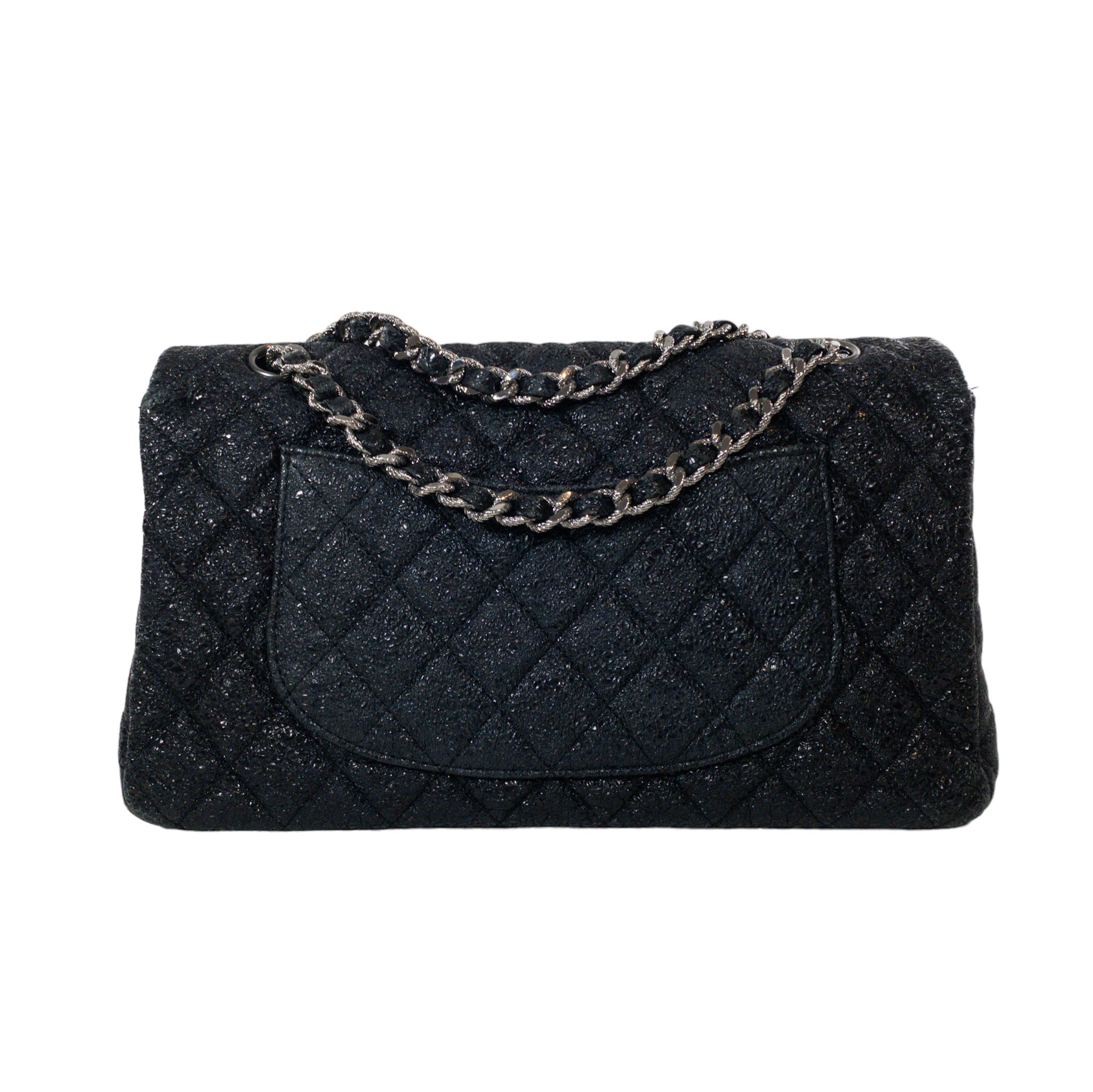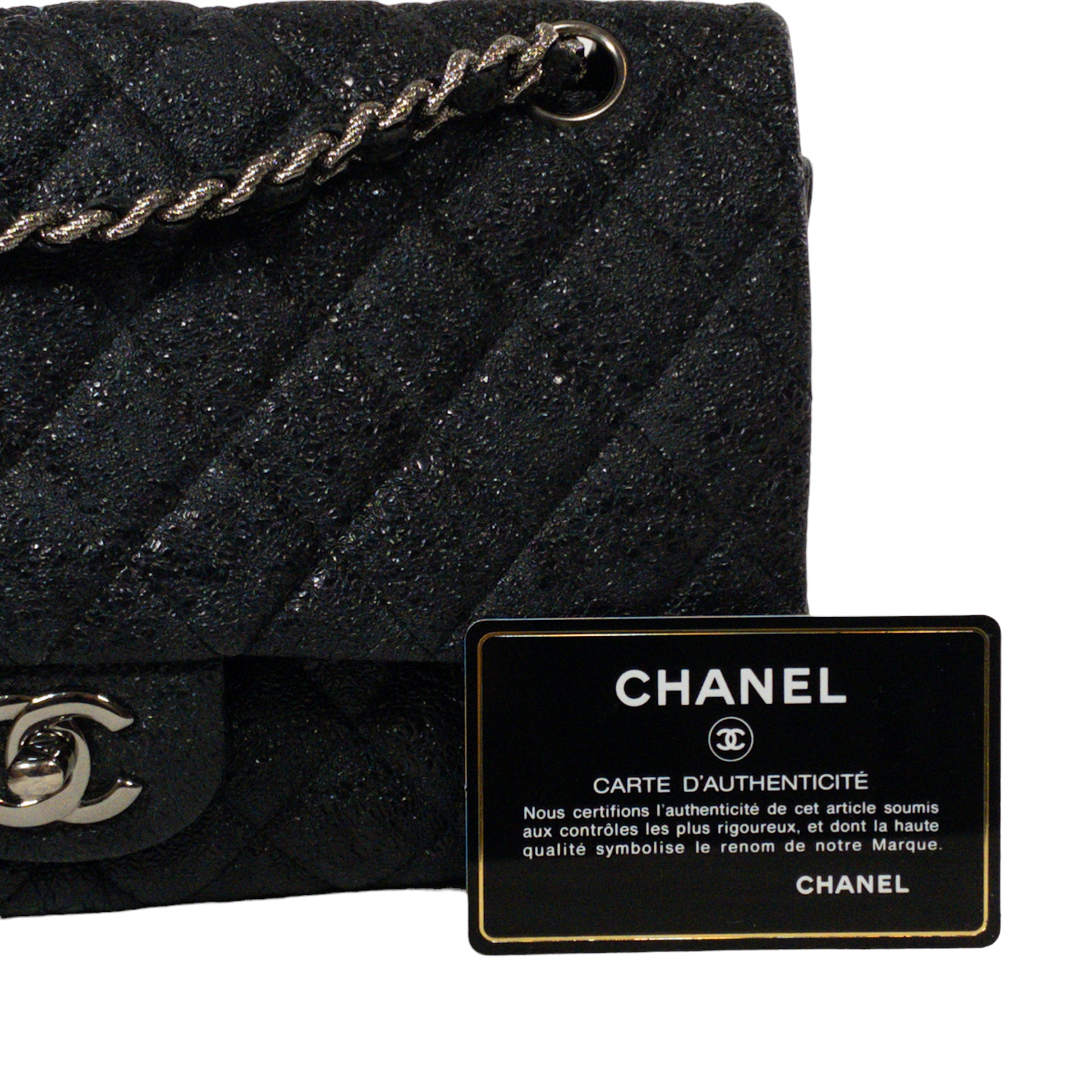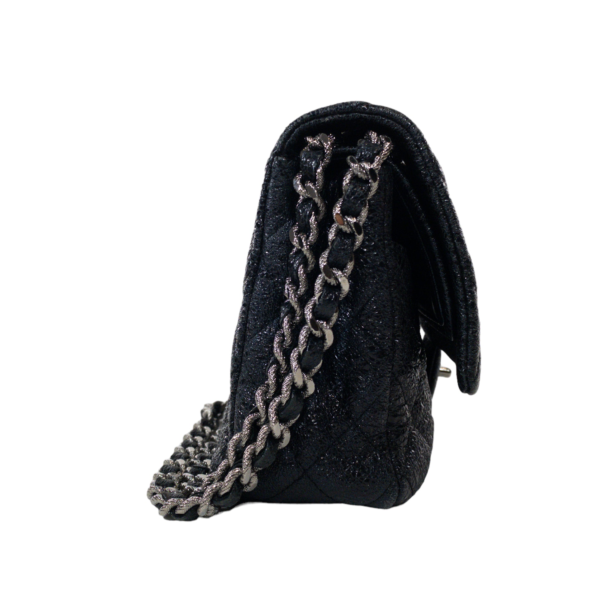This is an authentic Chanel Medium Classic Flap. The bag has a flap closure with a Double C logo turn lock. Limited edition piece from A/W 2007 collection in textured metallic black leather with braided rope chain. The interior is leather and includes one slip pocket and one zip pocket, it also has one exterior pocket on the back side. The strap is woven leather and metal and allows for shoulder carry.