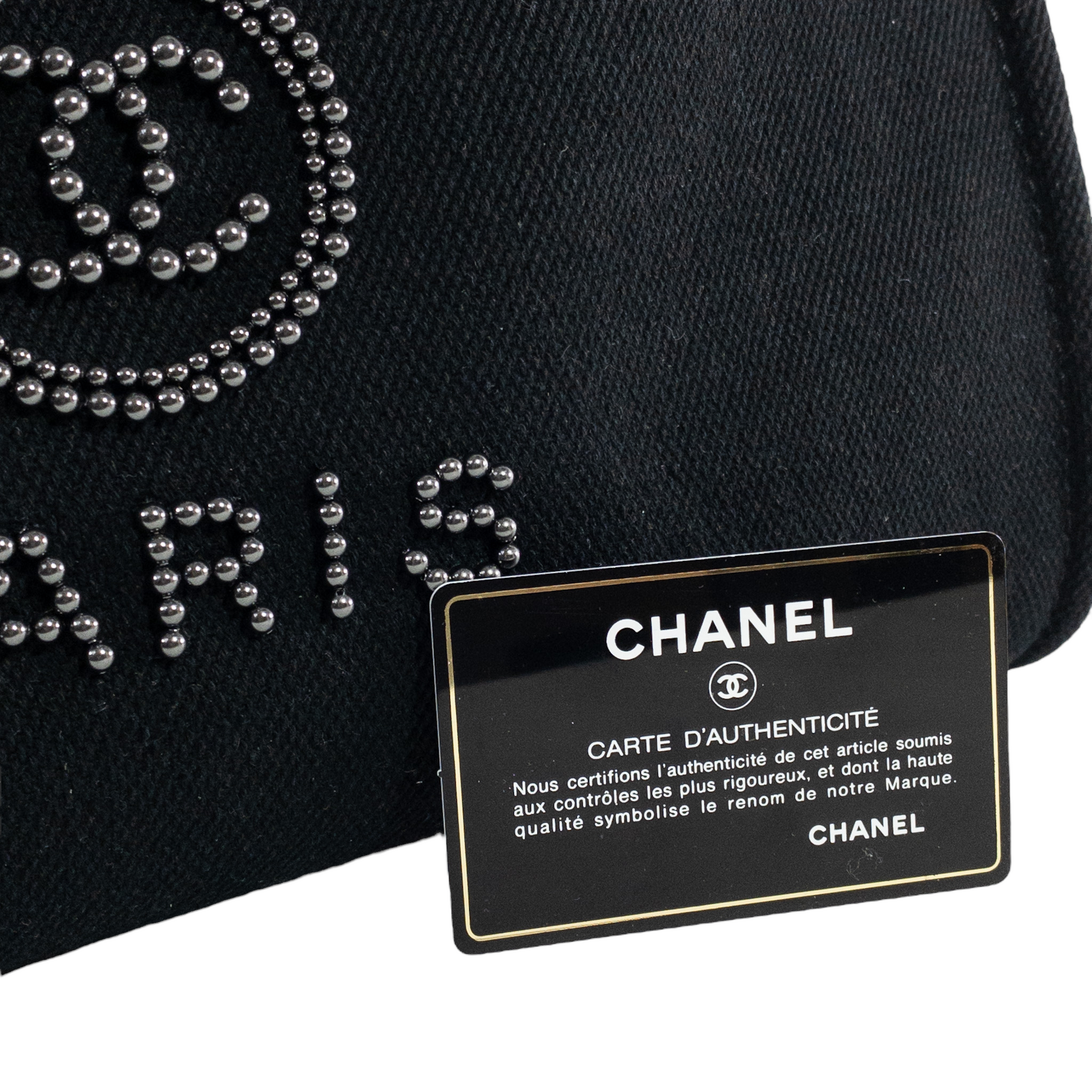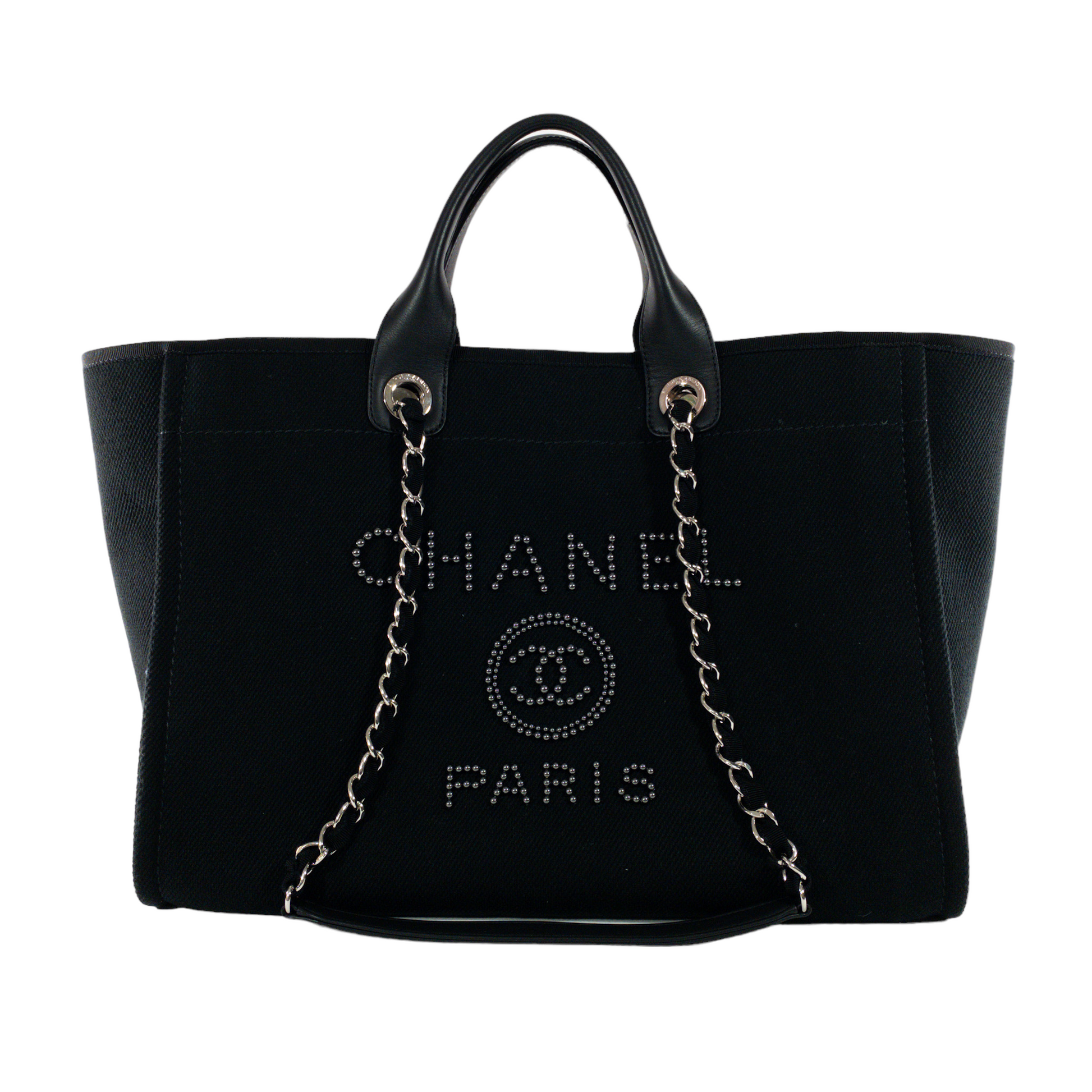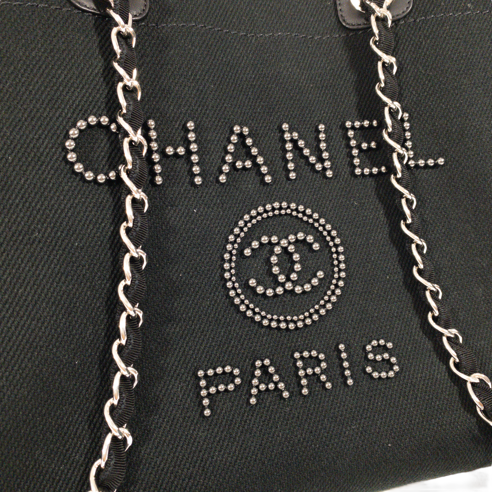 This is an authentic Chanel canvas Deauville. Black fabric with graphite beaded embroidery CC logo and lettering. Leather top handles with woven chain shoulder straps. Black fabric interior.
