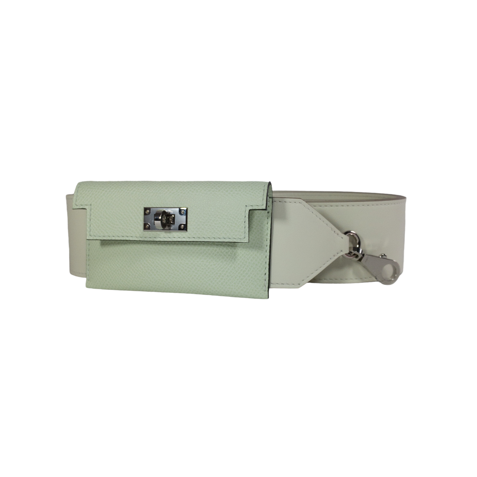 This is an authentic Hermès Mushroom and Vert Fizz Pocket Kelly Shoulder Strap. This strap features a small Kelly closure pouch in epsom leather. Lobster claw clasp in palladium hardware.