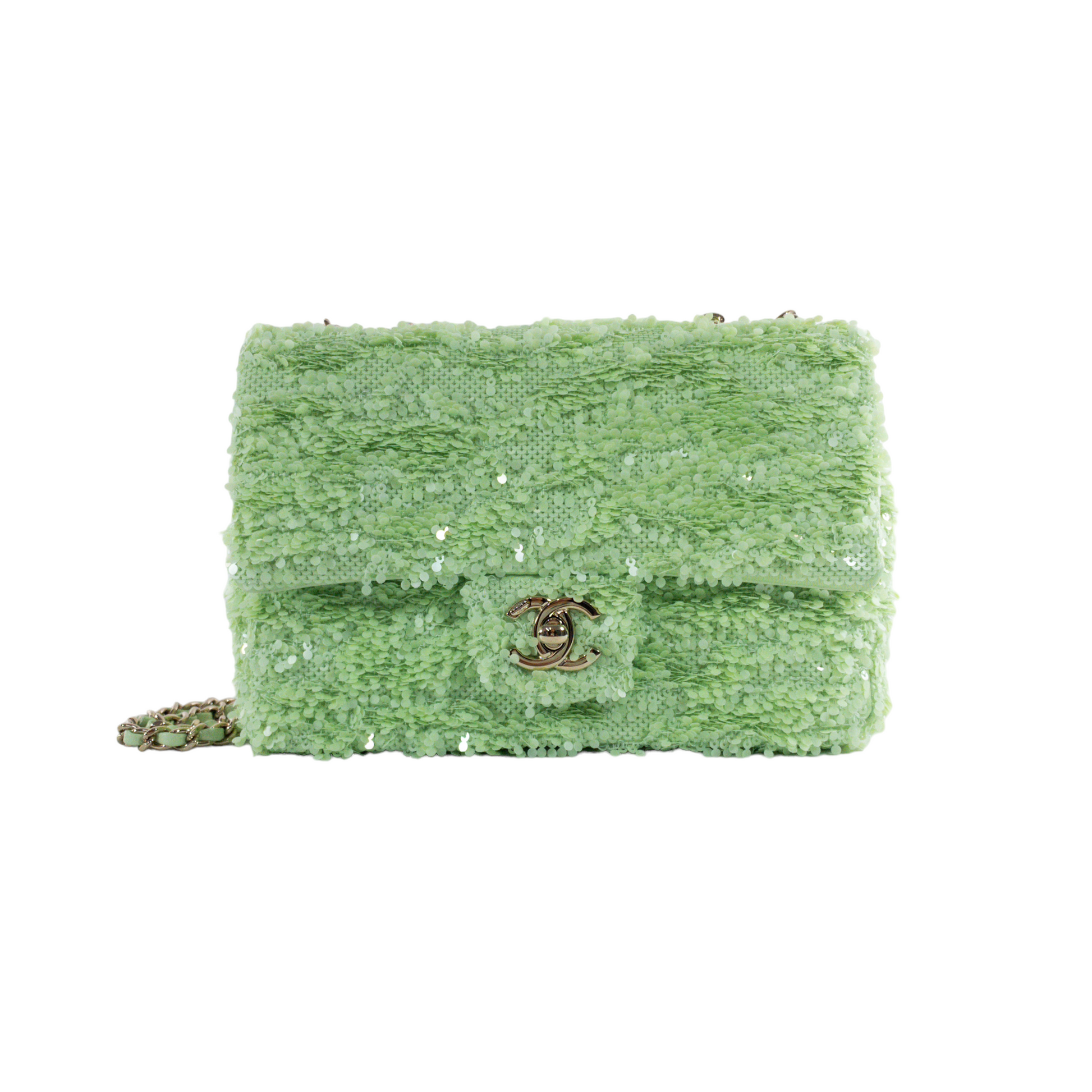 This is an Authentic Chanel Square Mini Flap with sequins. Double sided sequins with quilted check textured pattern. Light gold hardware, CC turn clasp, woven leather chain strap. lined in navy pale green leather.