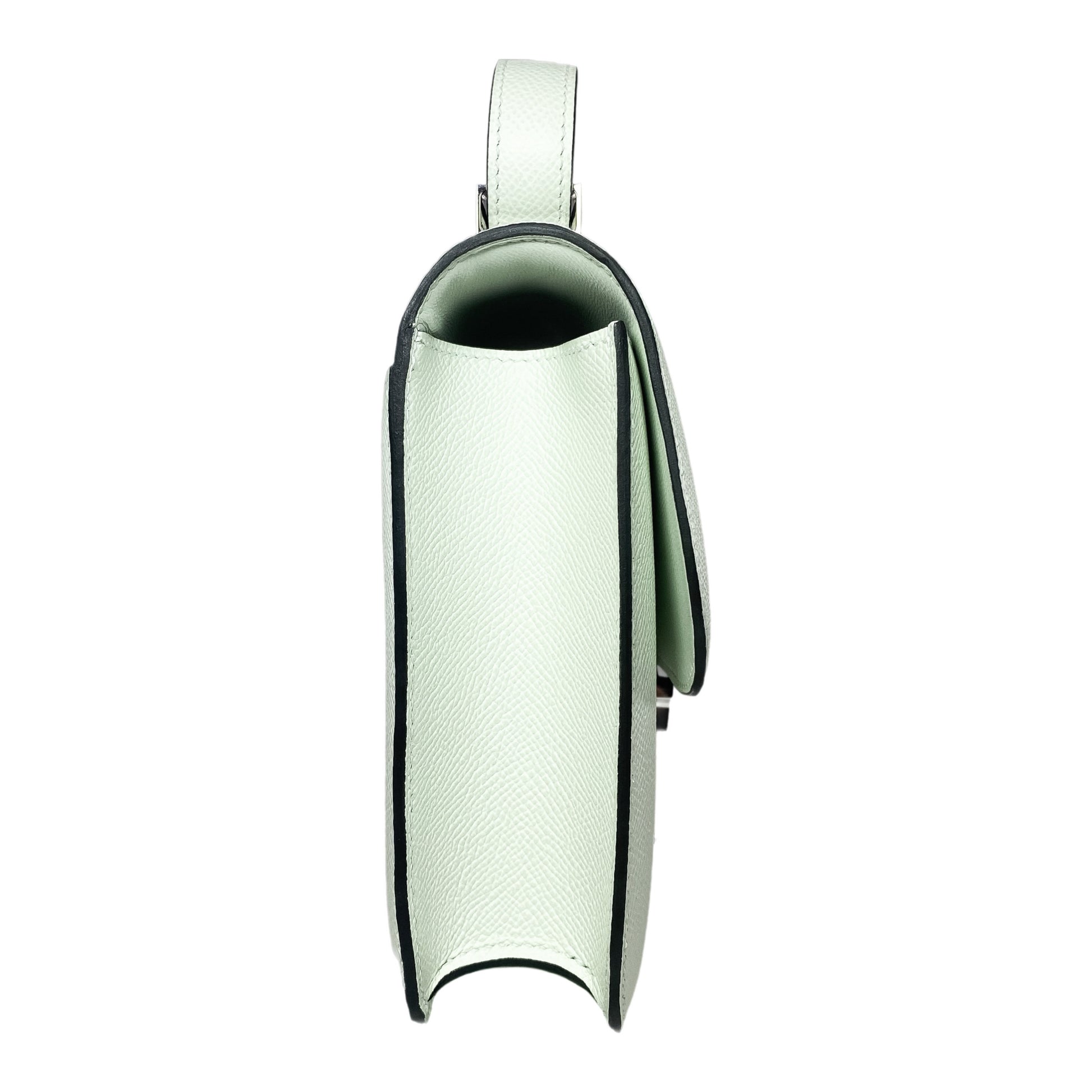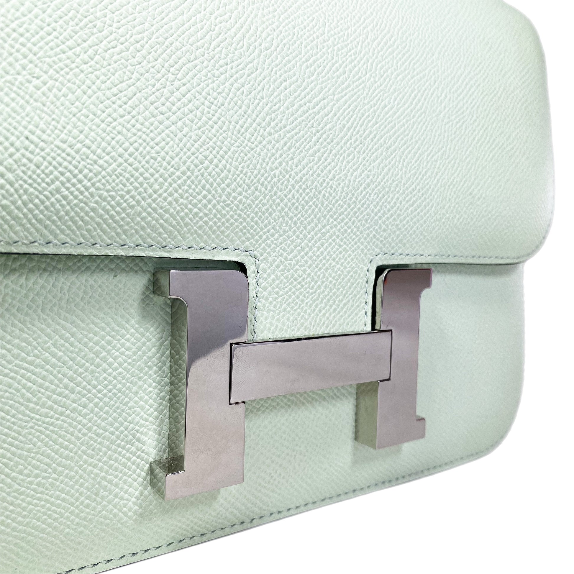 This is an Hermes Vert Fizz Constance 24 in Epsom leather with palladium hardware. This chic Constance features a 17.5-inch strap, a rear exterior pocket, and the signature "H" clasp closure. The front flap opens the handbag to a Vert Fizz leather lined interior that features two patch pockets, a zipper pocket, and a handheld mirror. This is a stellar everyday handbag!