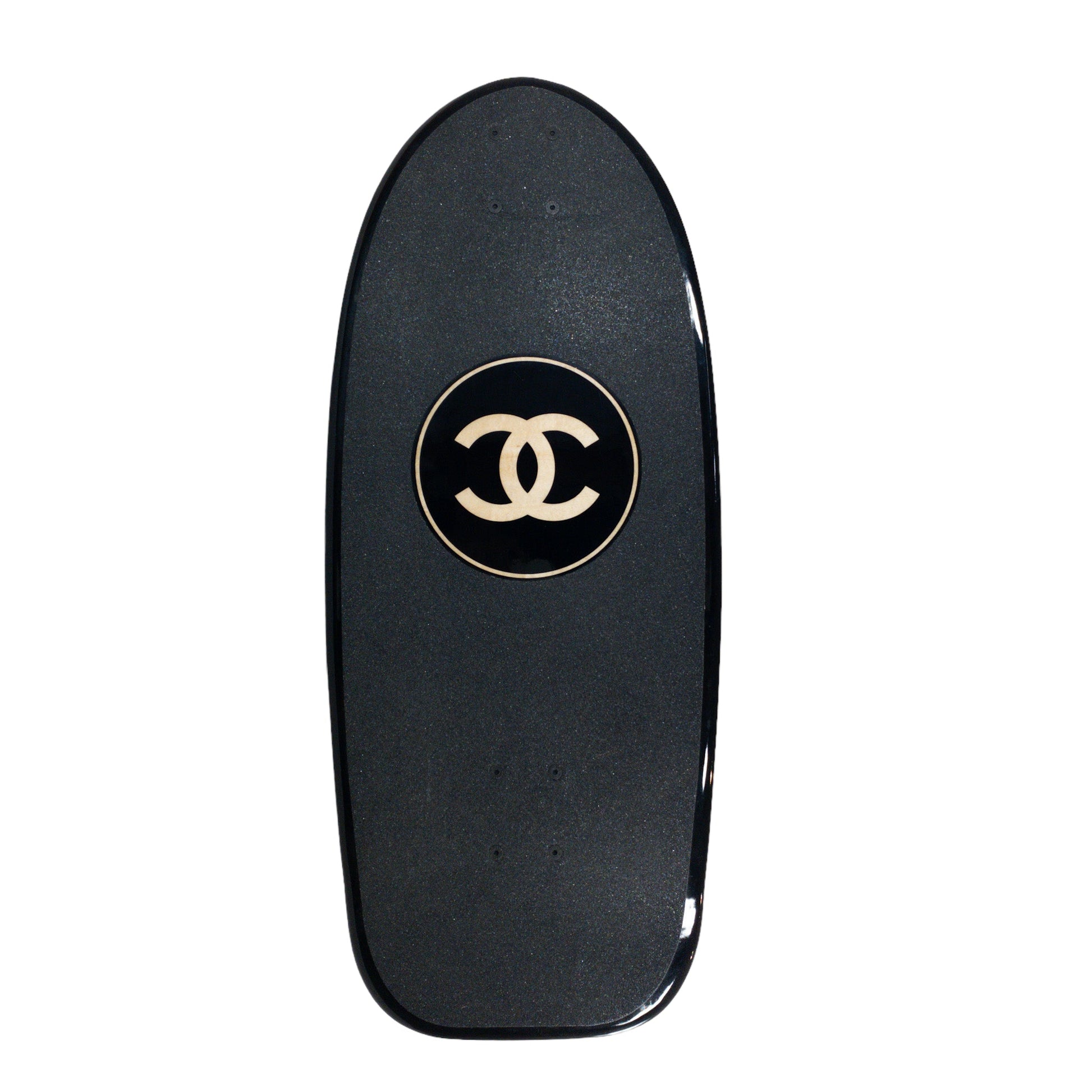 This is an authentic Chanel limited edition skateboard. Wood throughout with textured material on top. Printed on bottom with quilted CC logo.