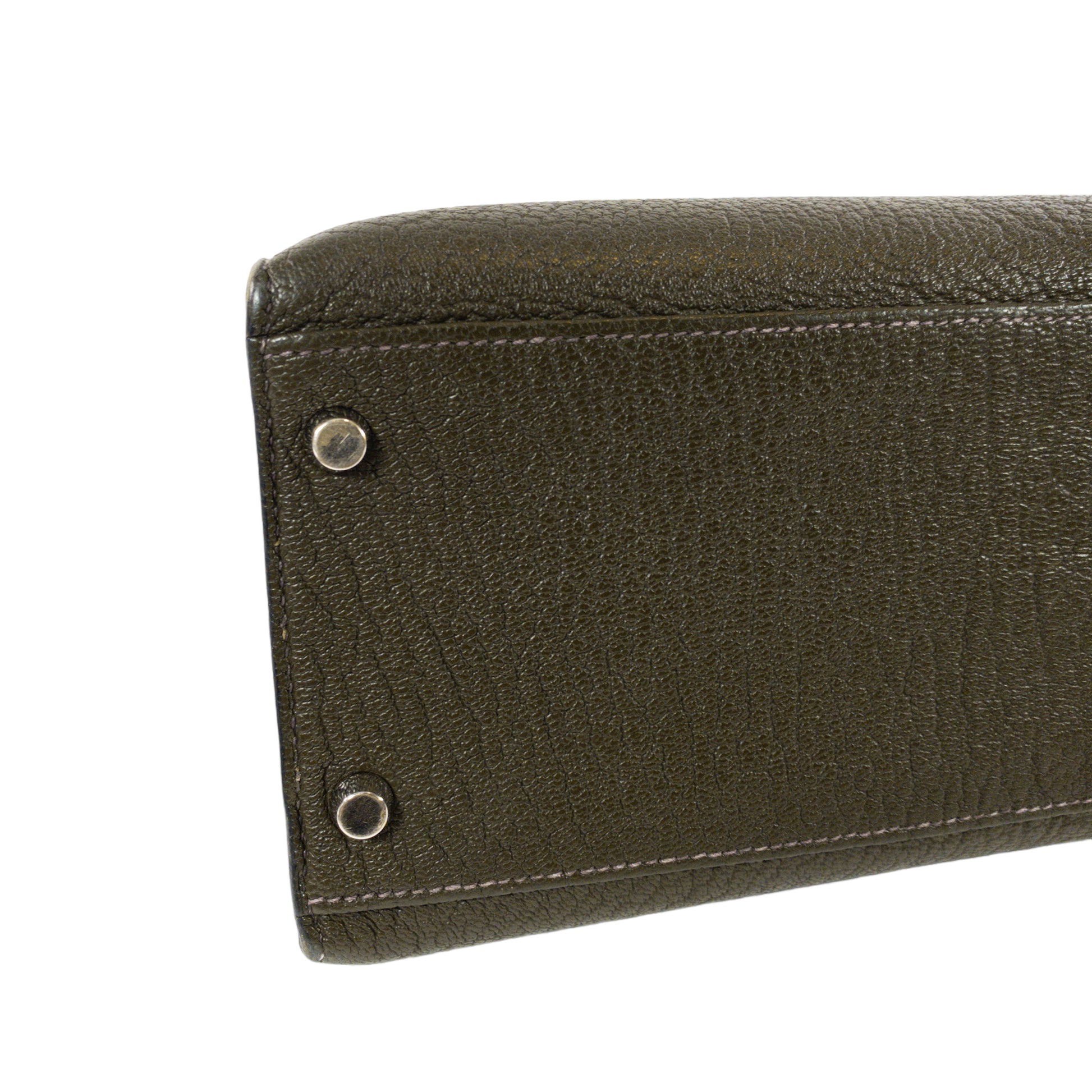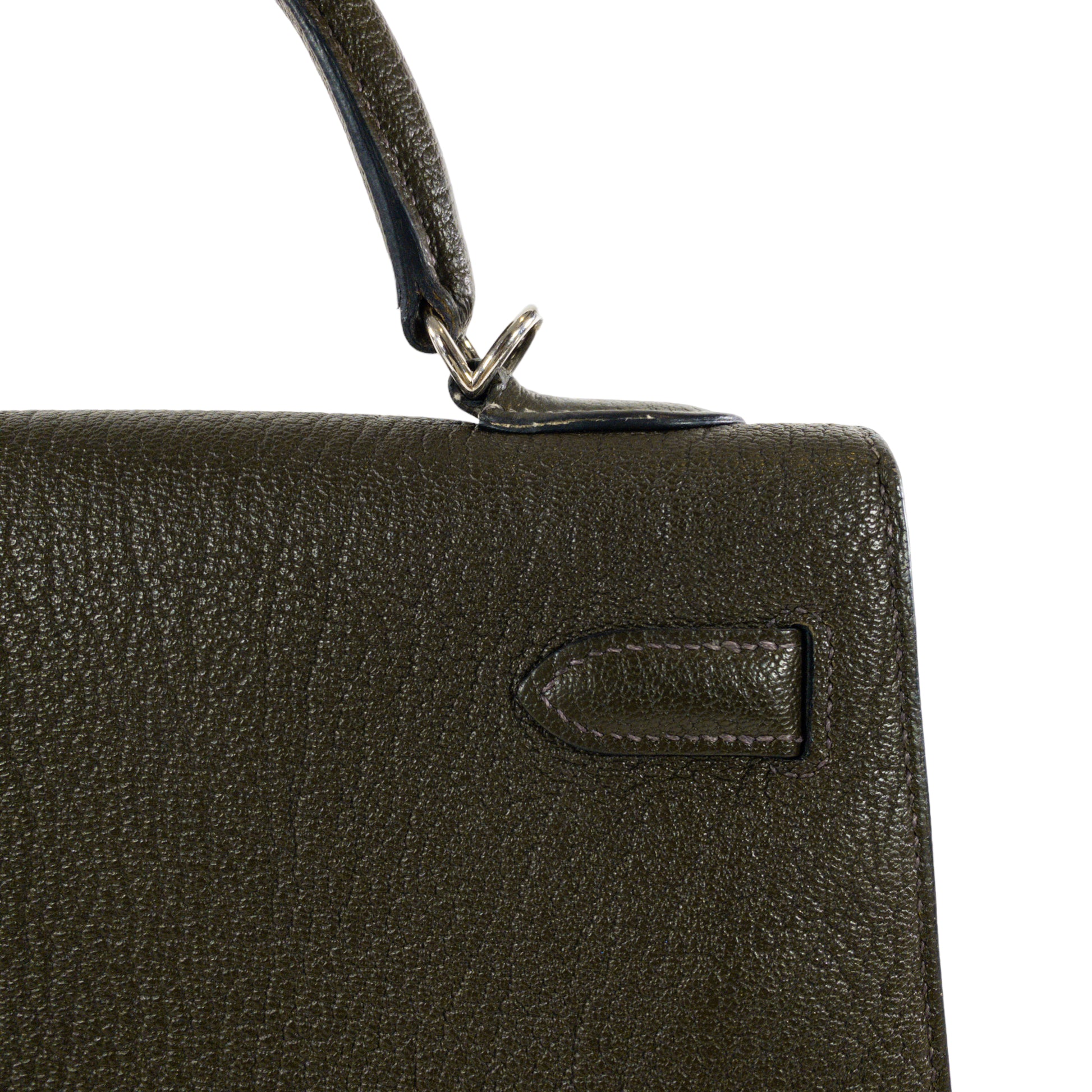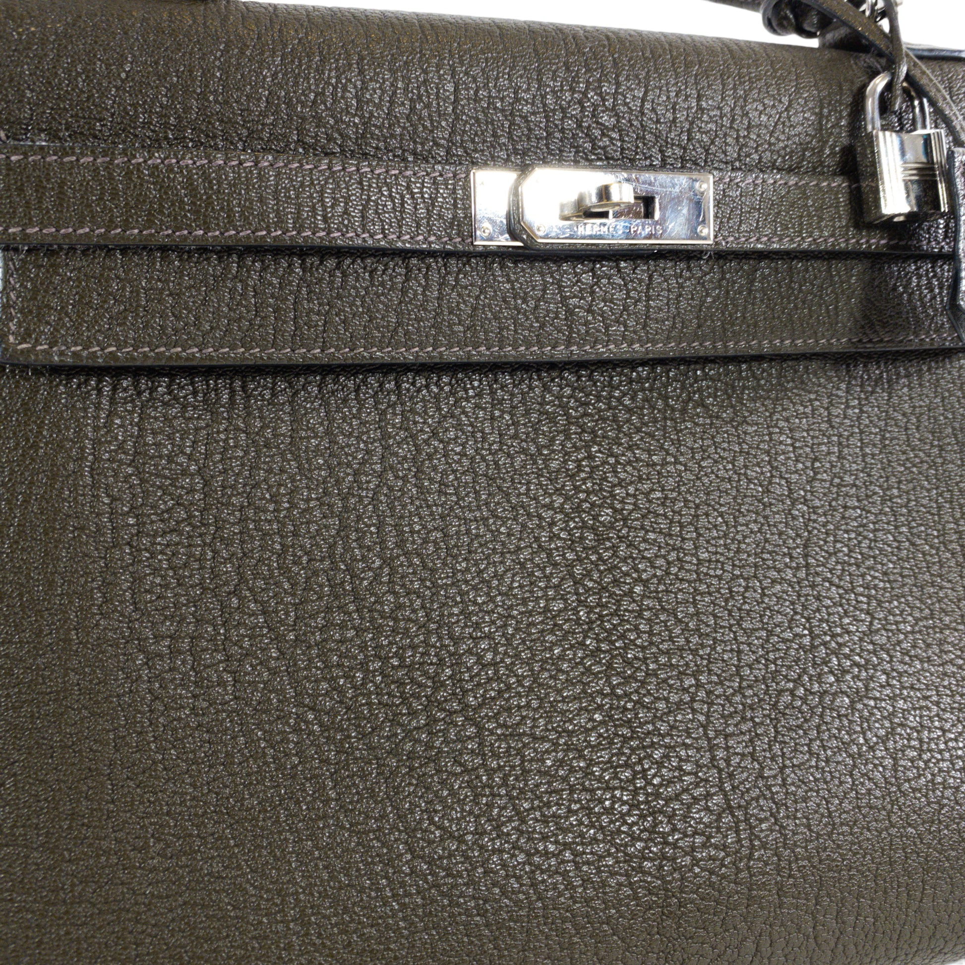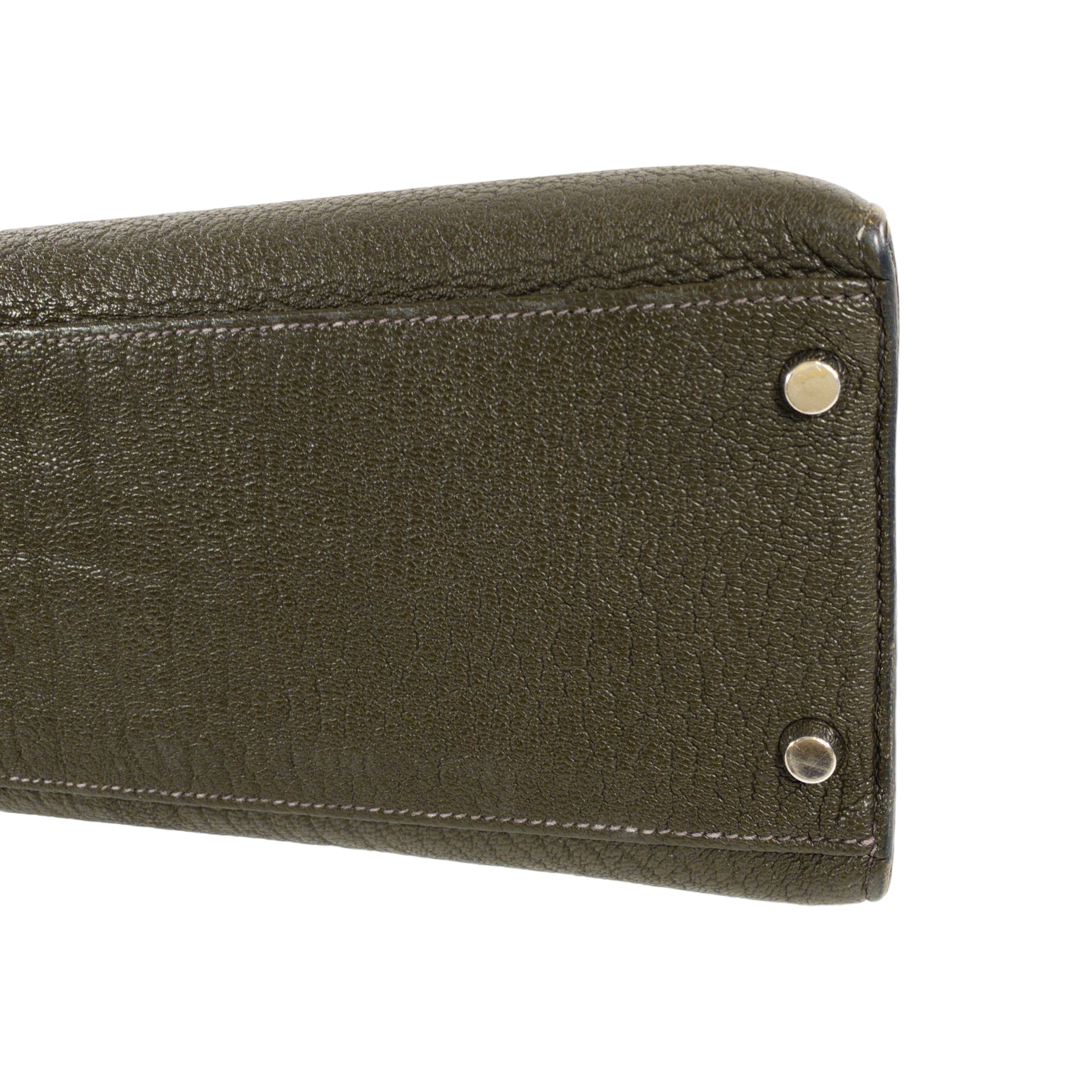 This is an authentic Hermes Kelly 32 in Dark Green Goatskin from 2004. Flap closure and opens with turn lock straps . Four feet on bottom. Lined with orange leather. Interior has one zipped pocket and a bank of slip pockets on opposite side.Can be carried on the top handle or with detachable shoulder strap.