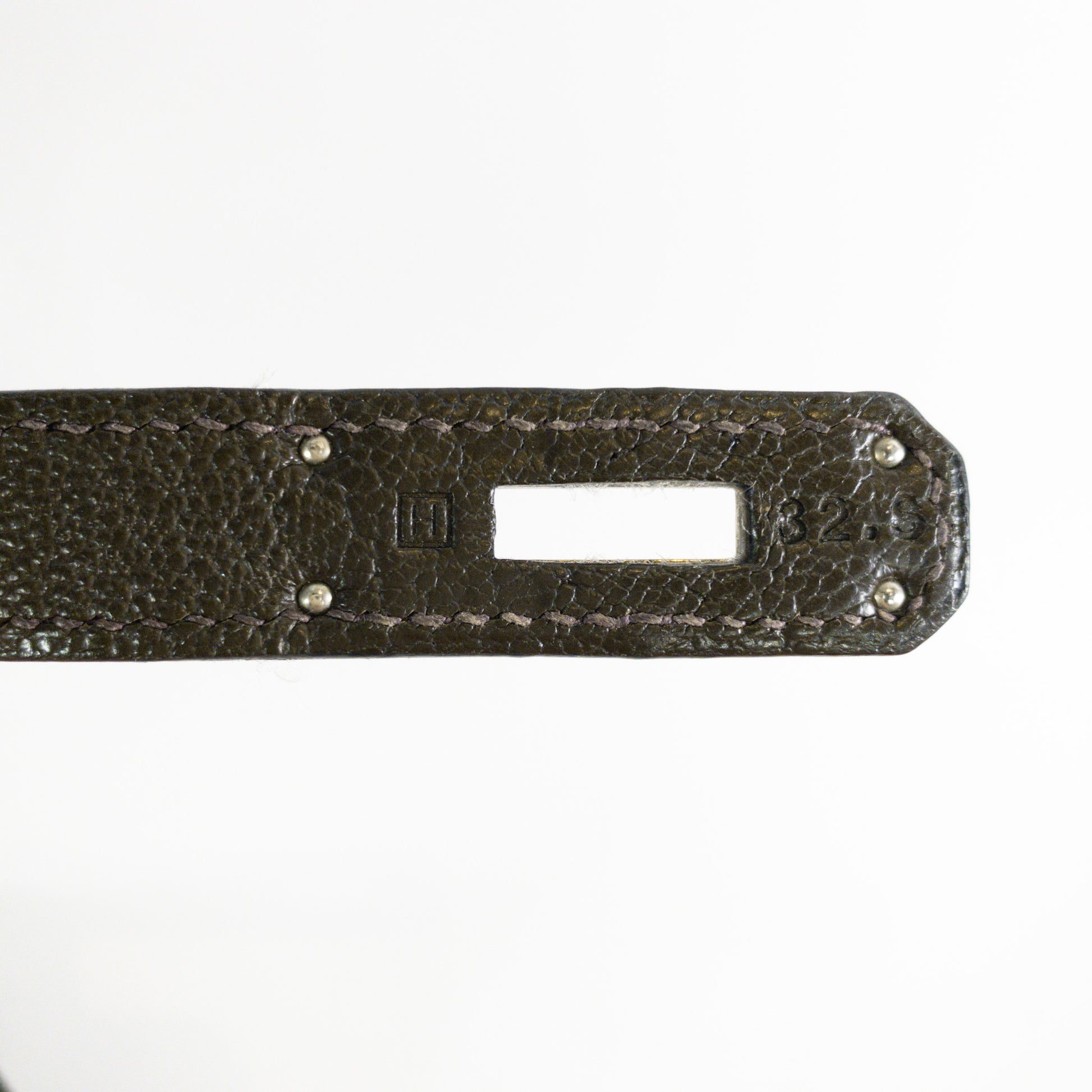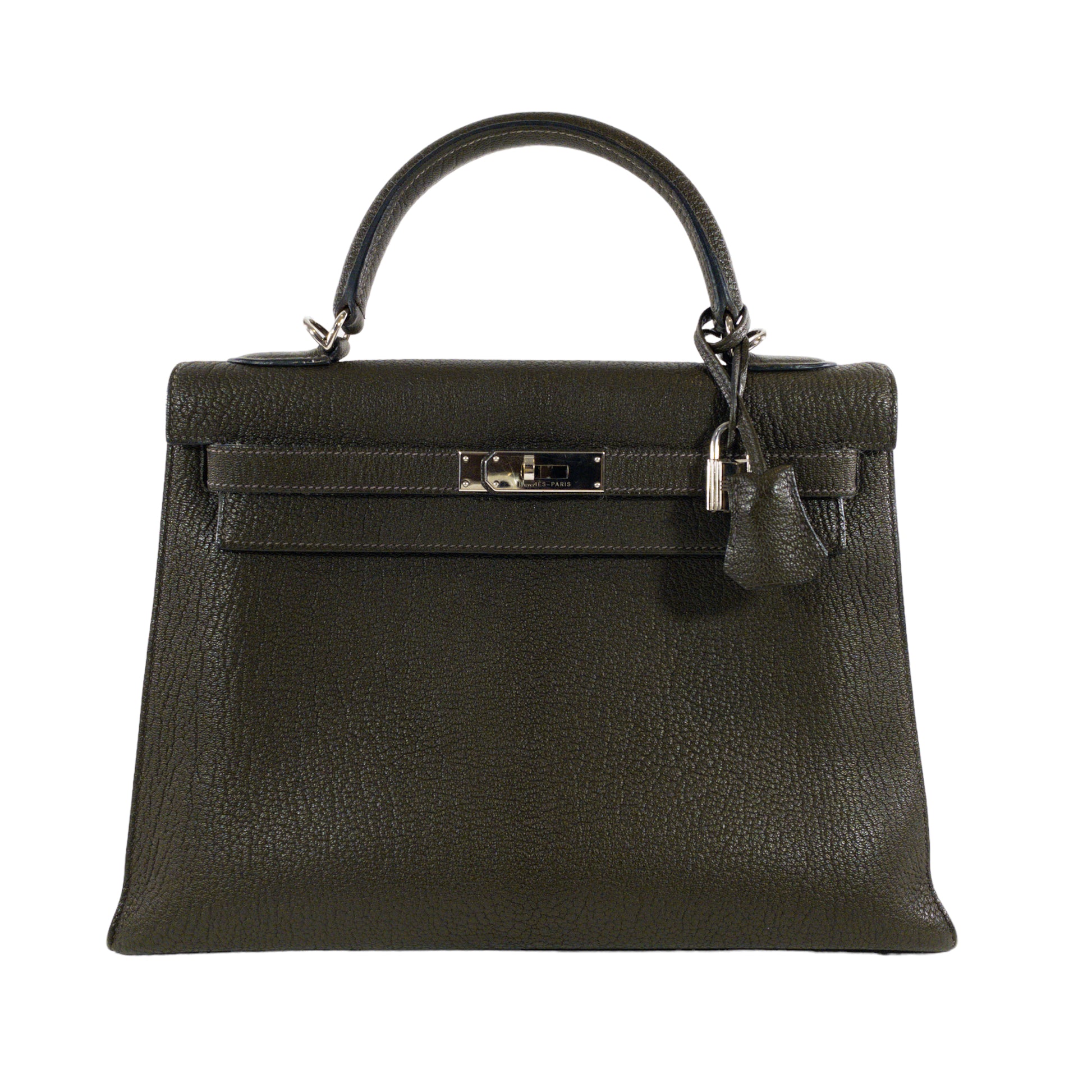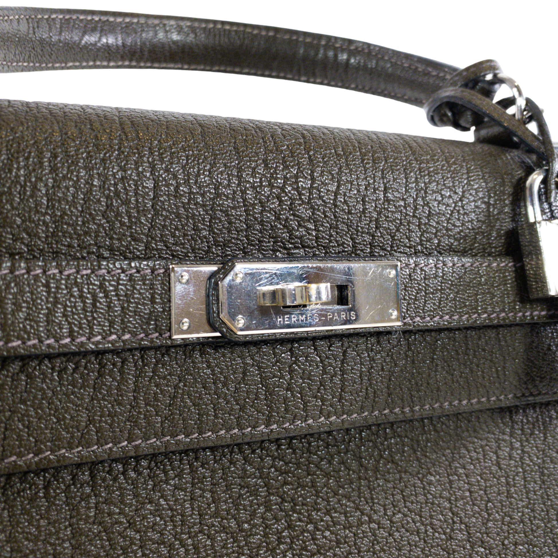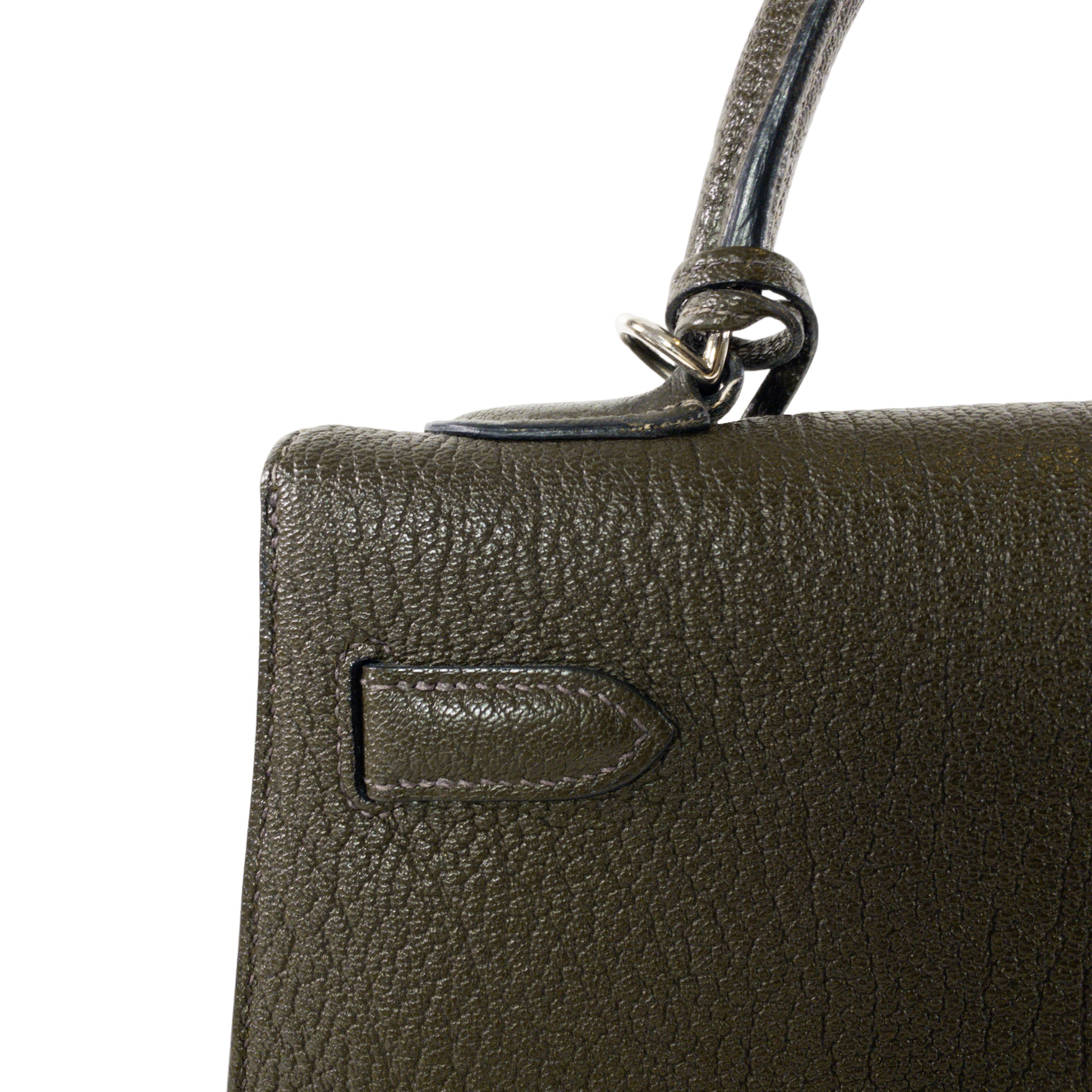 This is an authentic Hermes Kelly 32 in Dark Green Goatskin from 2004. Flap closure and opens with turn lock straps . Four feet on bottom. Lined with orange leather. Interior has one zipped pocket and a bank of slip pockets on opposite side.Can be carried on the top handle or with detachable shoulder strap.