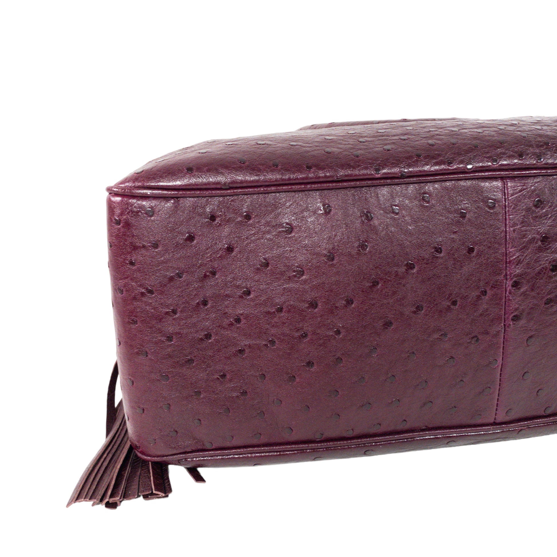 This is an authentic Gucci Soho Bowling bag in burgundy ostrich leather. Double GG logo stitched into front. Champagne gold hardware with chain straps. Lined in beige fabric