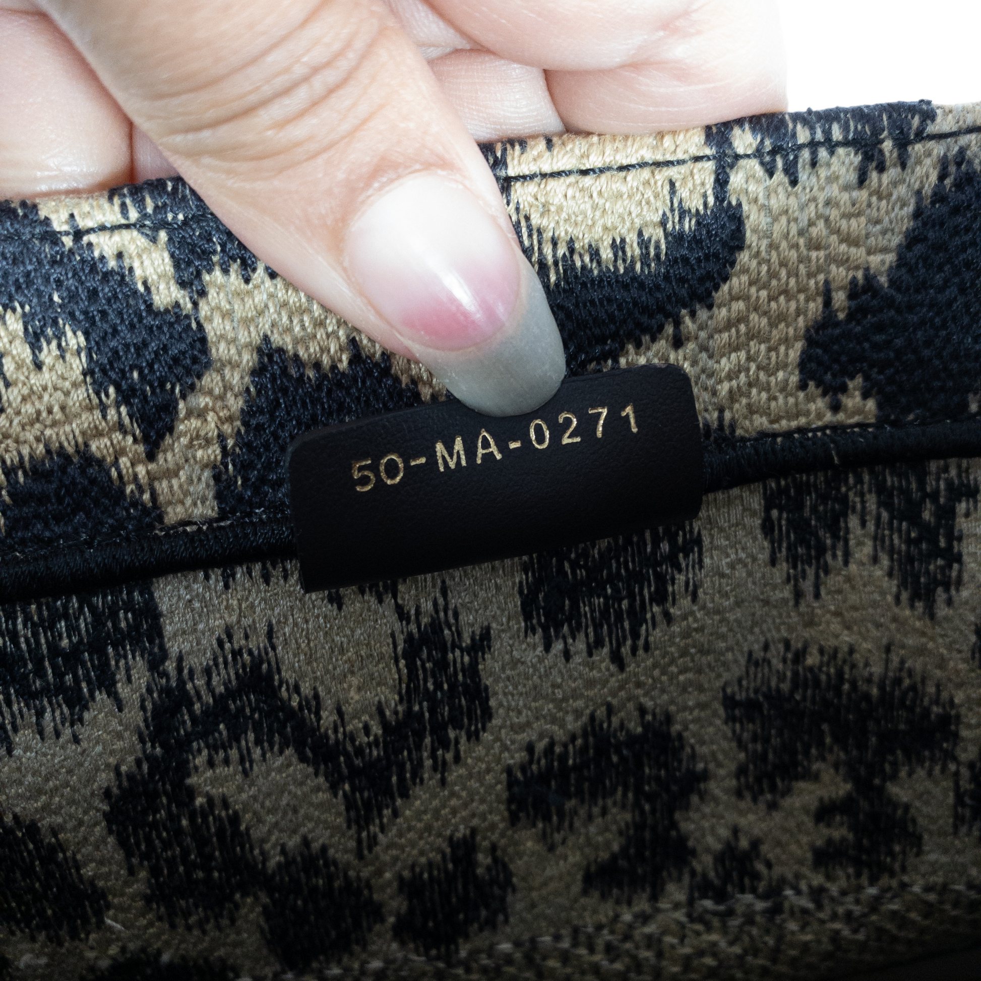 This is an Authentic Dior Book Tote in size Medium. Embroidered leopard print canvas in taupe, black and metallic gold threads. 'Christian Dior' woven in front with large stationary top handles. Large interior cavity.
