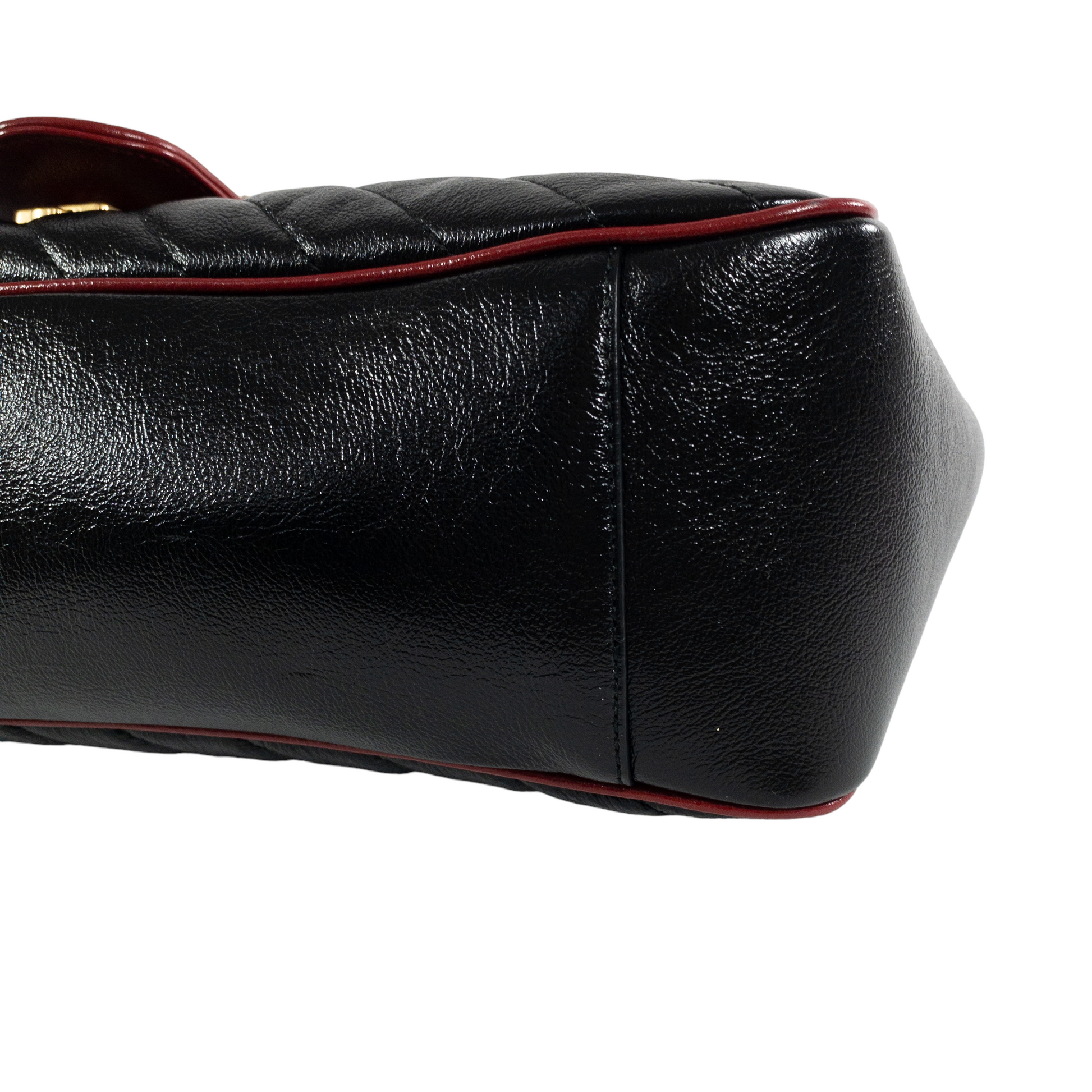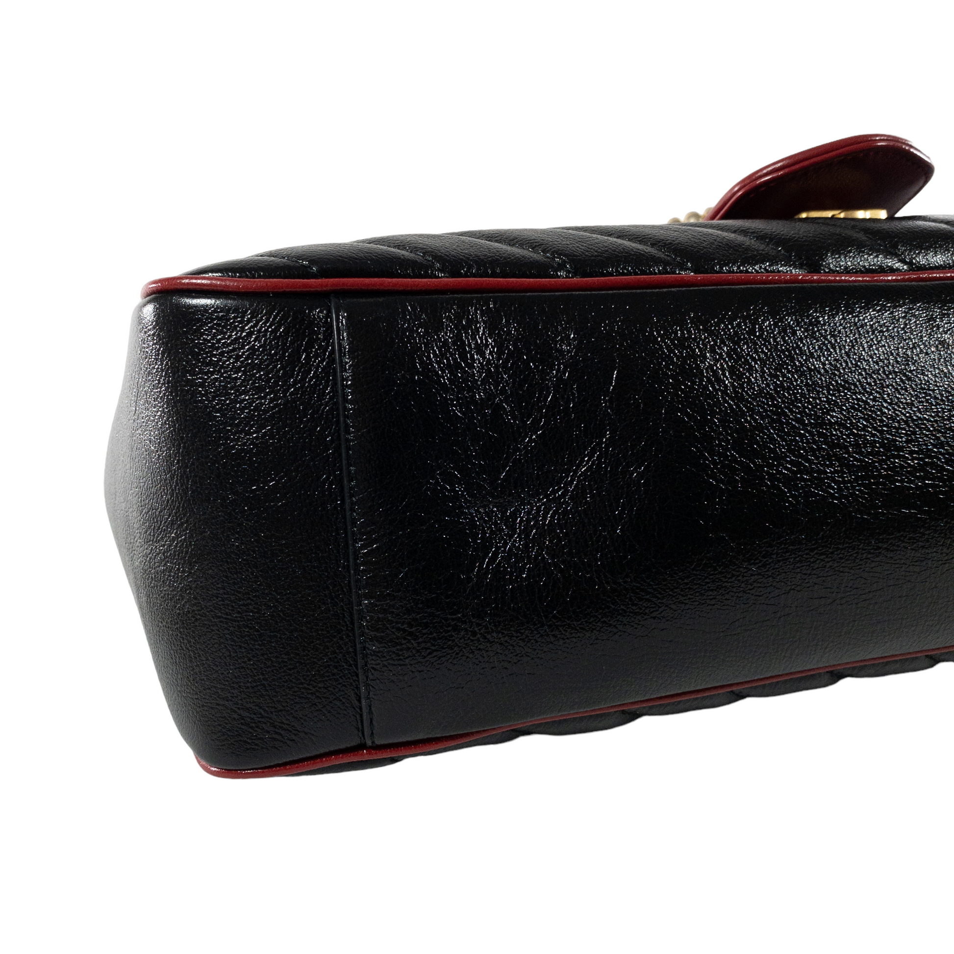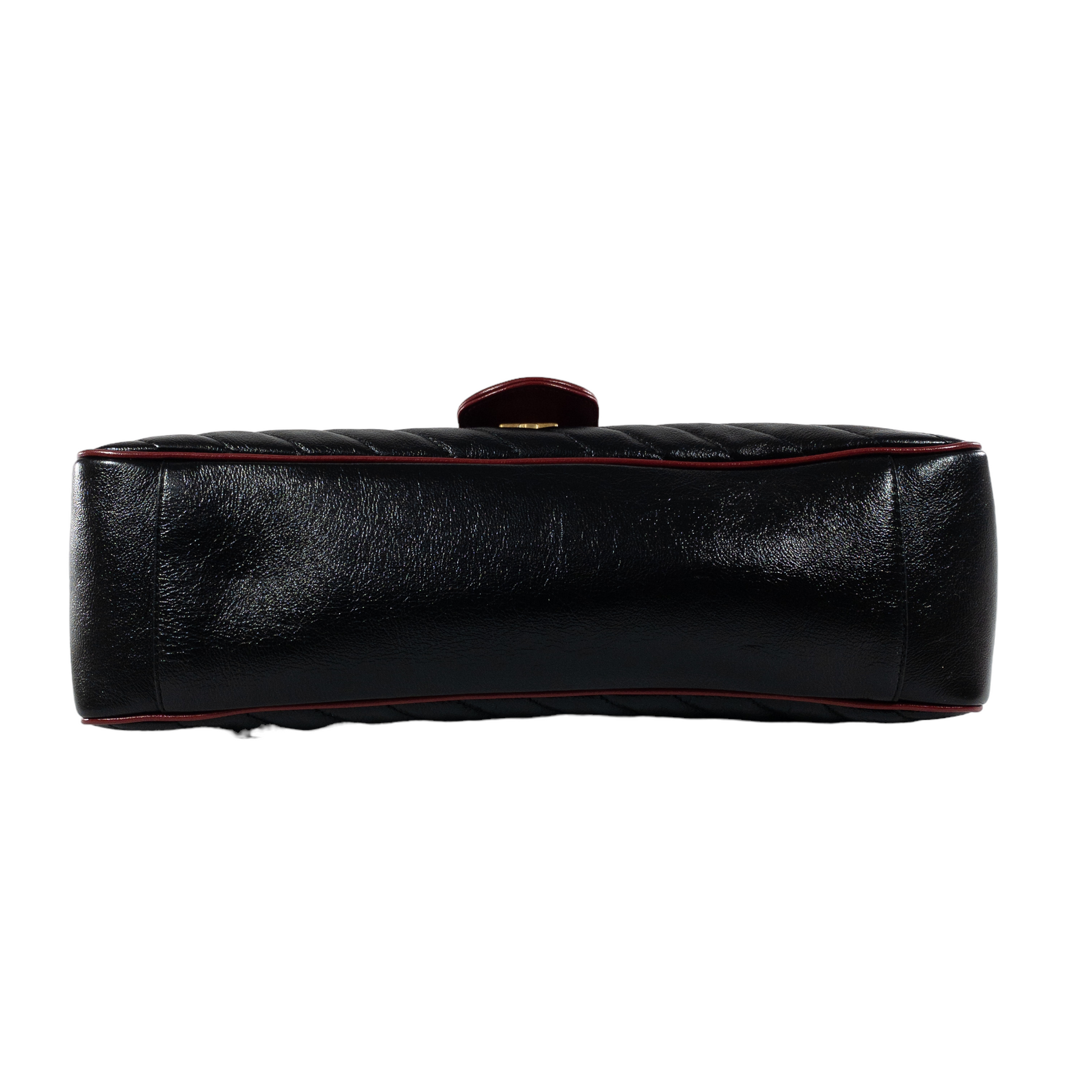 This is an authentic Gucci XL Marmont flap. Black quilted glazed leather with red trim. Textured GG logo clasp. Chain strap with leather segment, can be worn doubled or singled. Suede interior with zipped pocket and card slots