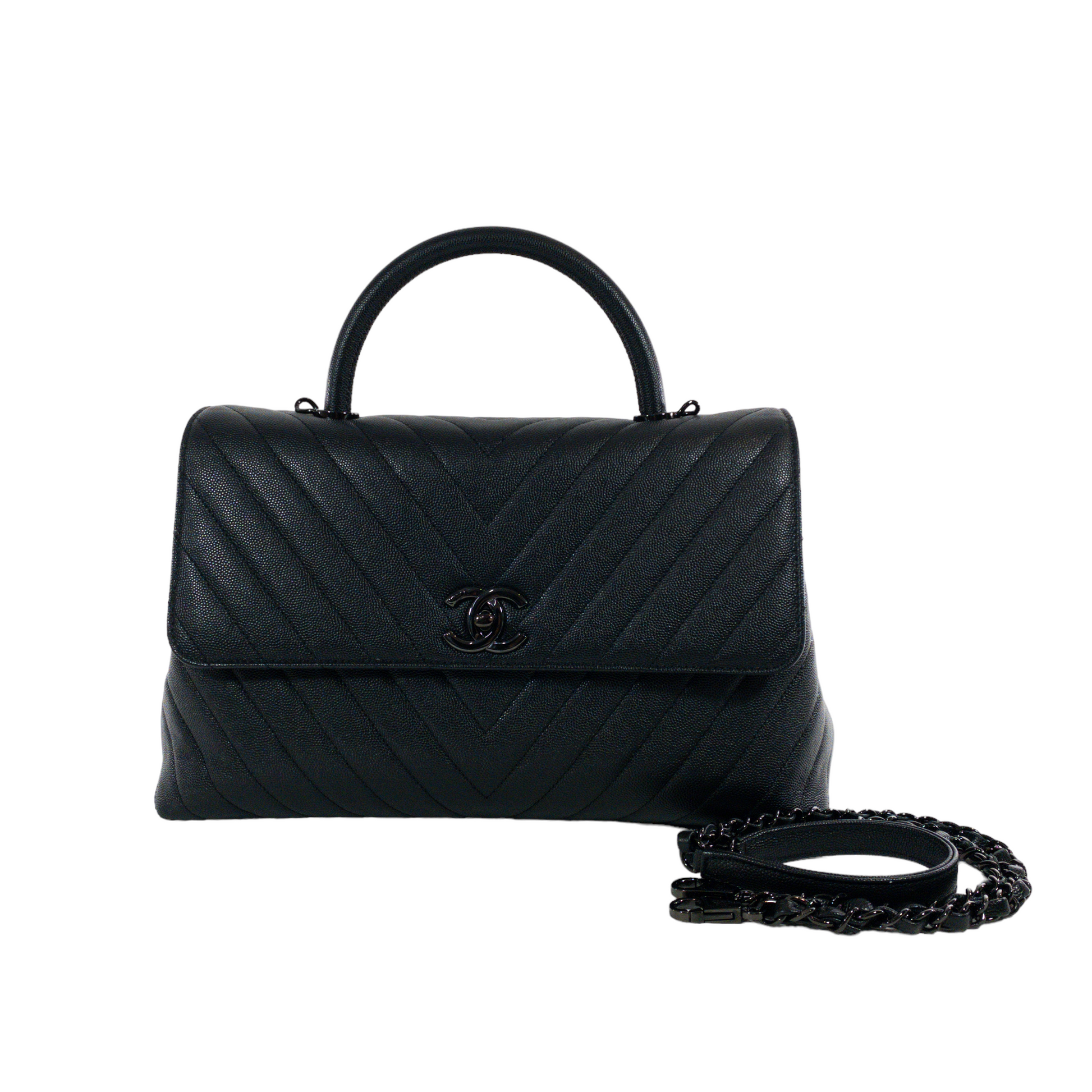 This is an authentic Chanel Large Coco Handle. Metallic black caviar leather exterior with shiny black hardware. Chevron Quilted exterior with detachable chain strap. Front flap closure, with CC turn lock. Pocket in back with four feet on bottom. Interior lined with leather two compartments inside with zipper pocket in between.