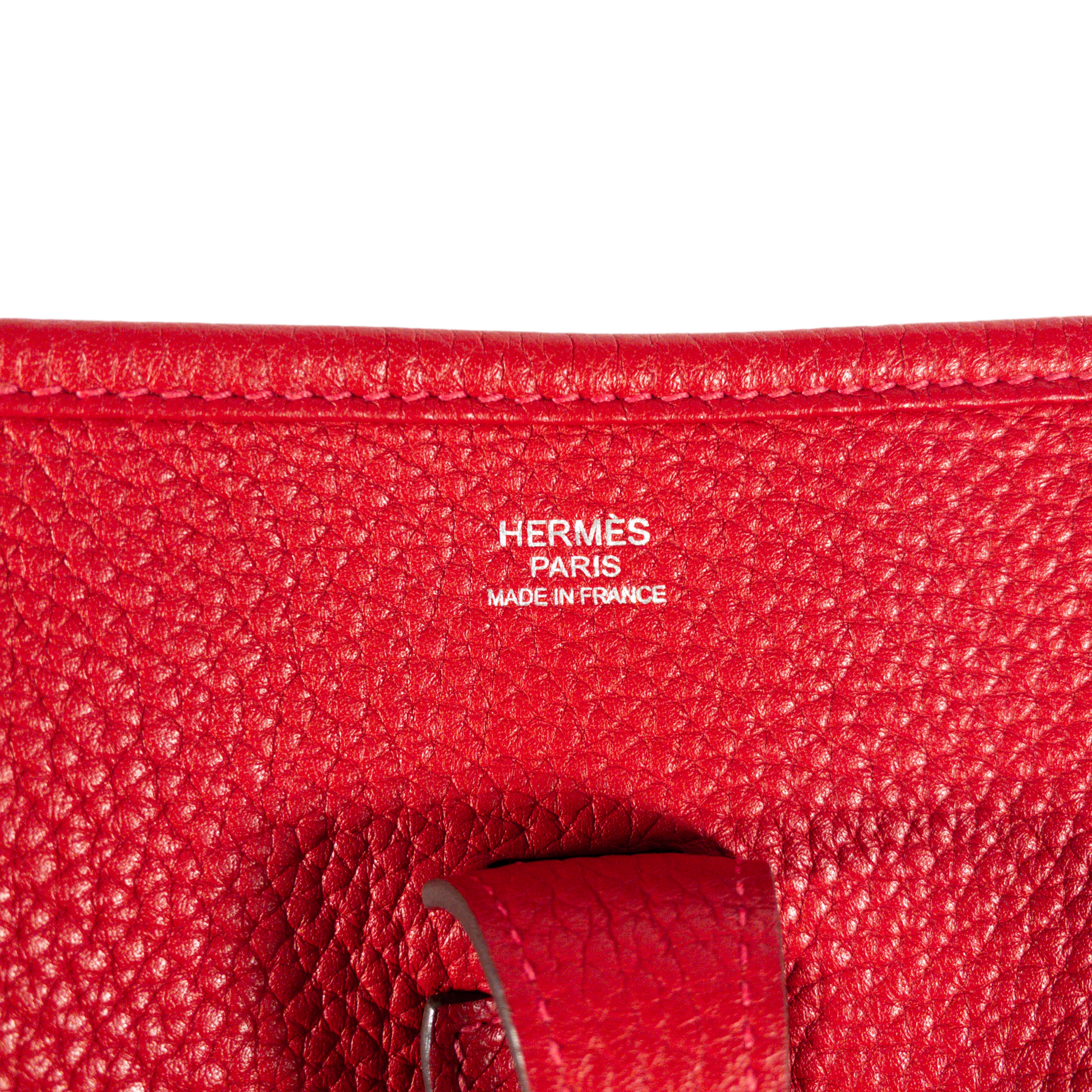 This is an authentic Hermes Evelyne in size PM. Made from Rouge Vif Clemence leather and includes a matching canvas strap. Strap closure with snap. Palladium hardware. Interior is lined with suede.