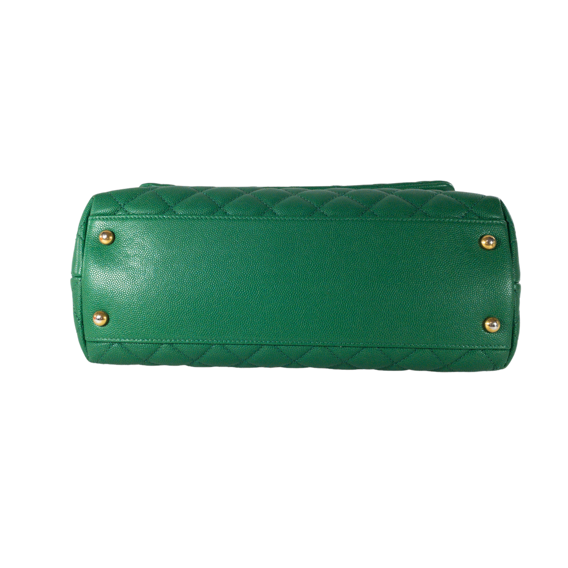 This is an Authentic Chanel Medium Coco Handle. Emerald green caviar leather exterior with aged gold hardware. Quilted exterior with detachable chain strap. Front flap closure, with CC turn lock. Pocket in back with four feet on bottom. Interior lined with leather two compartments inside with zipper pocket in between.