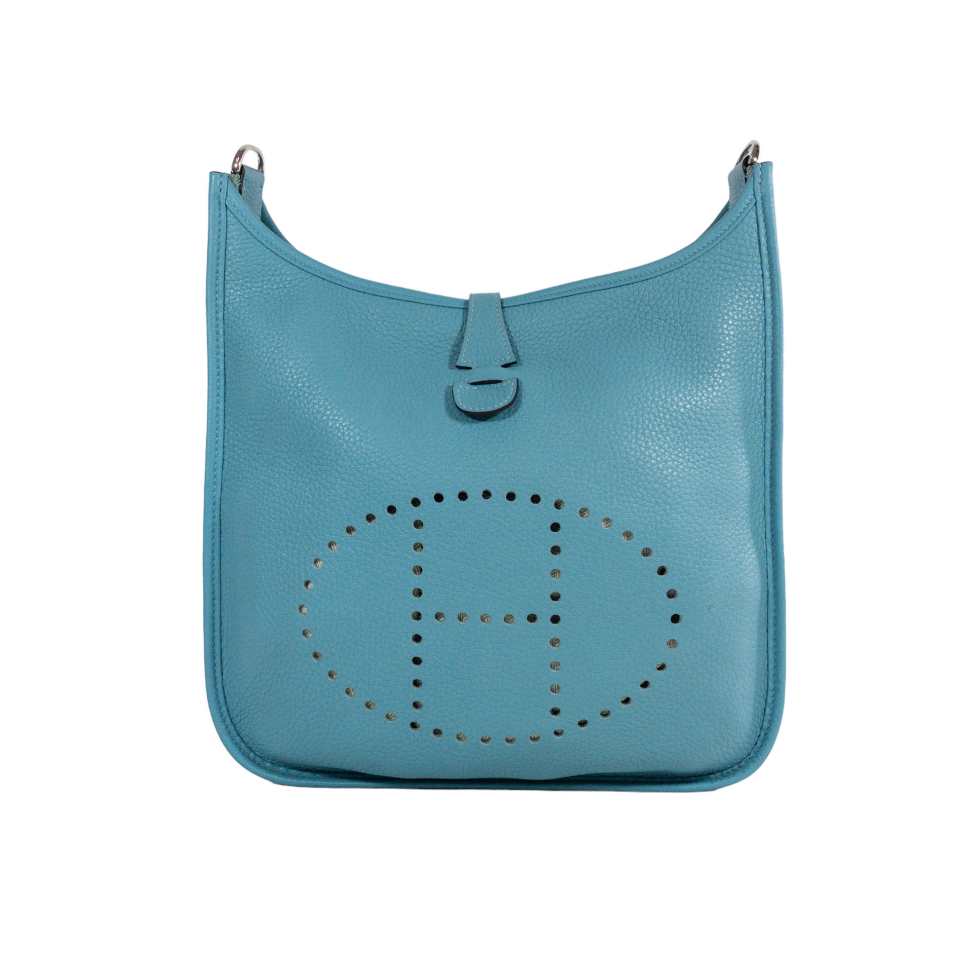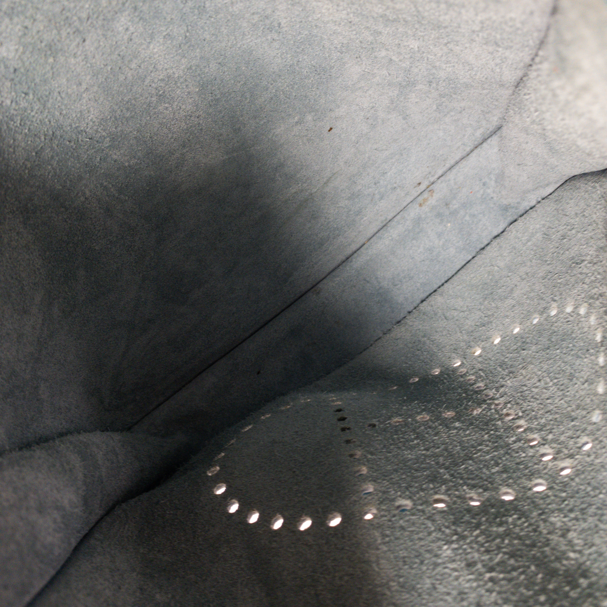 This is an authentic Hermes Evelyne in size PM. Made from Clemence leather and includes a matching canvas strap. Strap closure with snap. Palladium hardware. Interior is lined with suede.