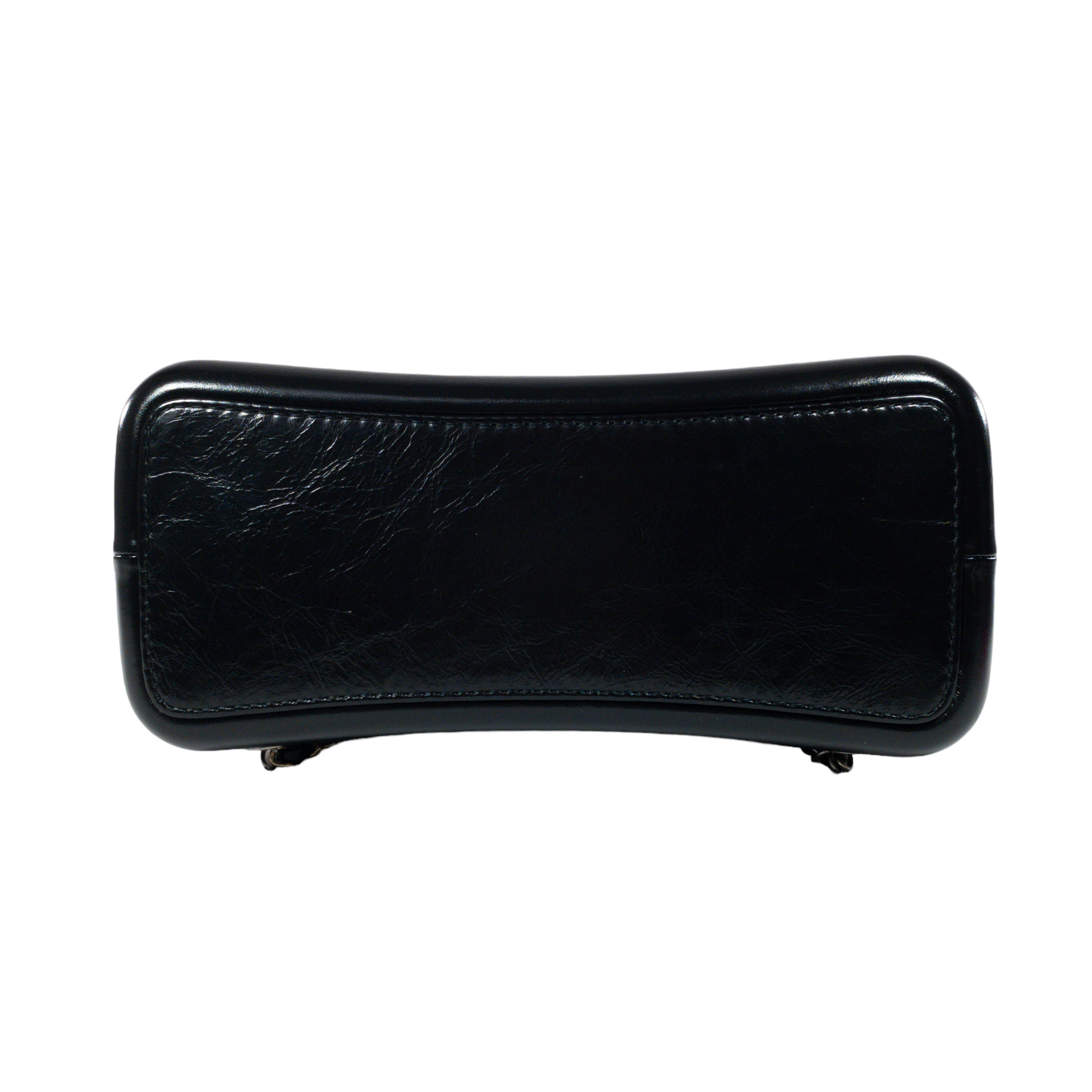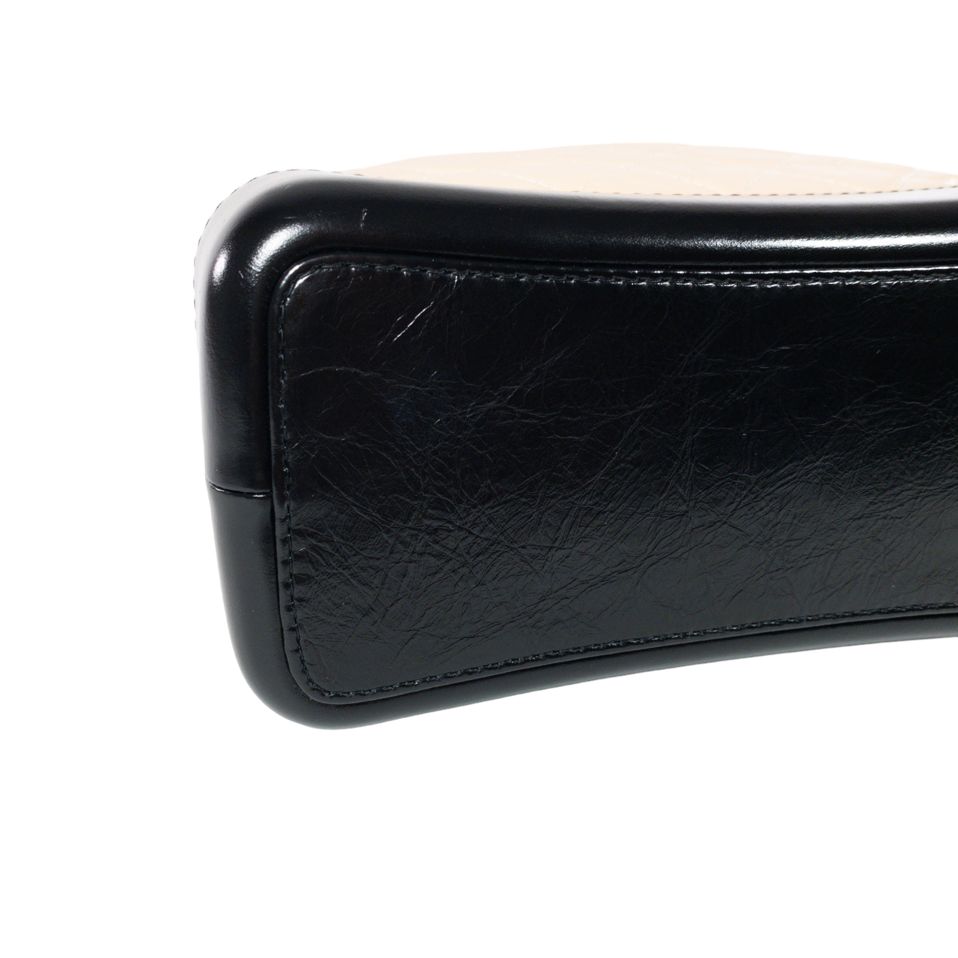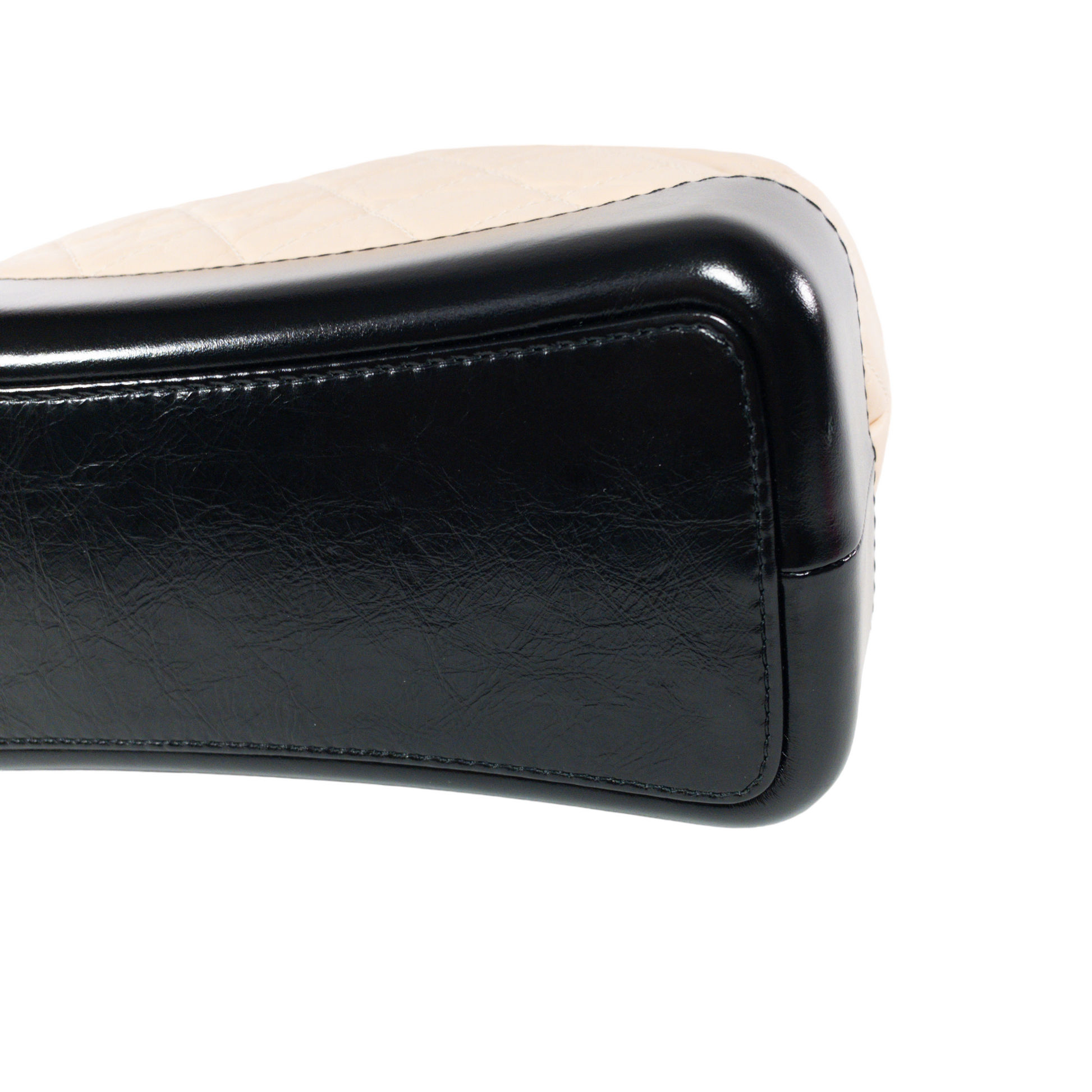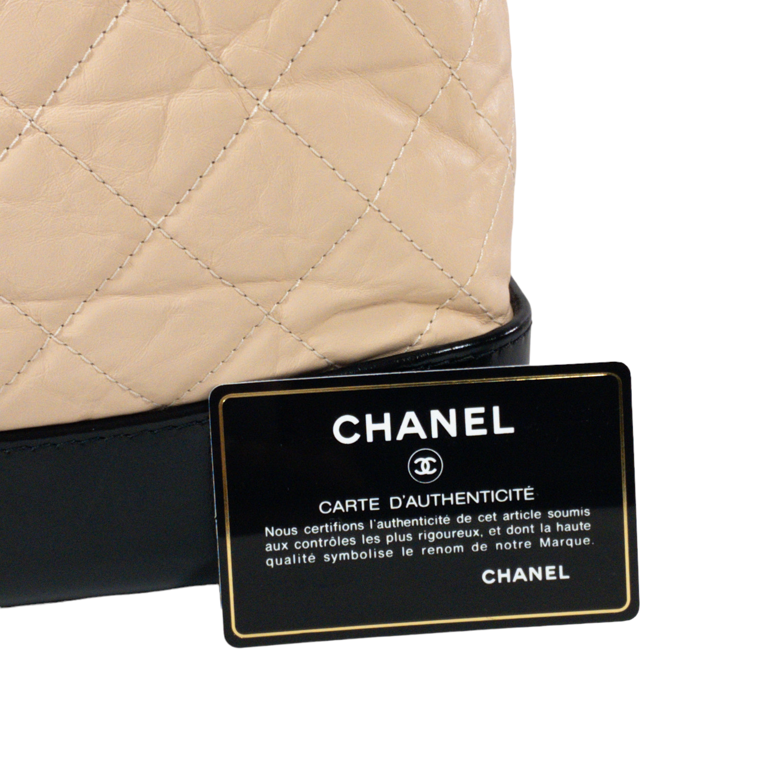 This is an authentic Chanel Gabrielle small drawstring backpack. Beige quilted leather with glazed black leather structured base. Multicolor woven chain hardware. Ruthenium CC in front. Lined with red fabric.