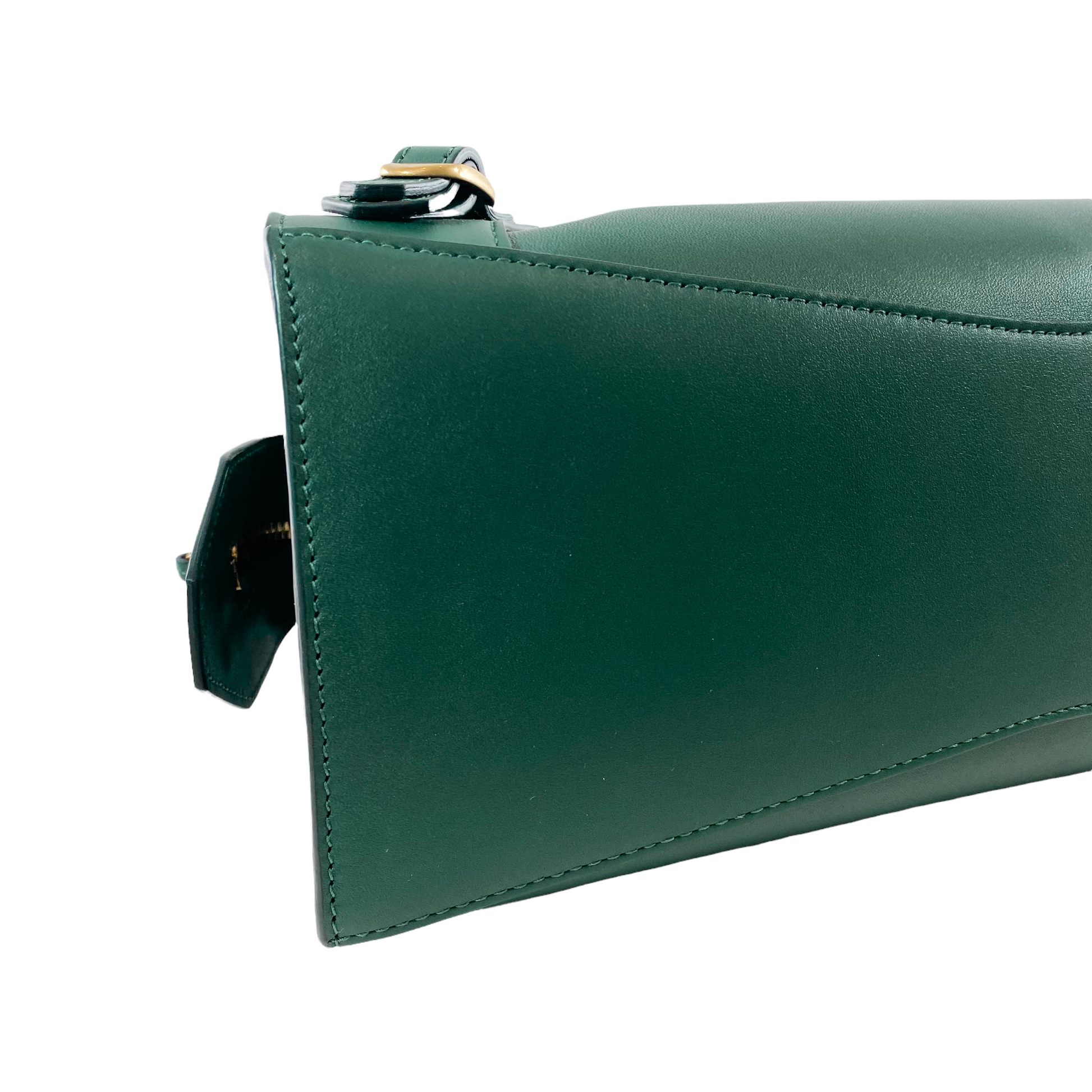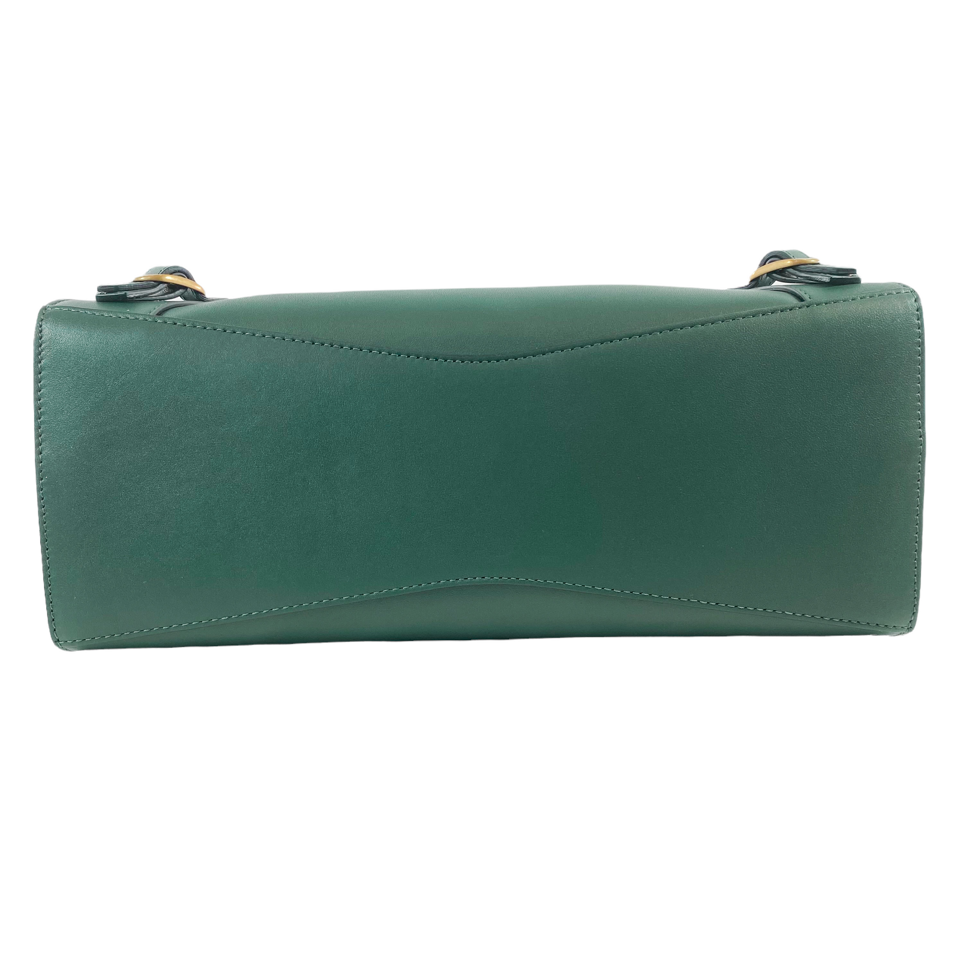 This is an Authentic Balenciaga Neo City bag in size small. Smooth dark green leather with aged gold hardware. Double rolled top handles with detachable shoulder strap. Front zipped pocket with top zipper closure. Large interior cavity, with several pockets inside. Comes with mirror