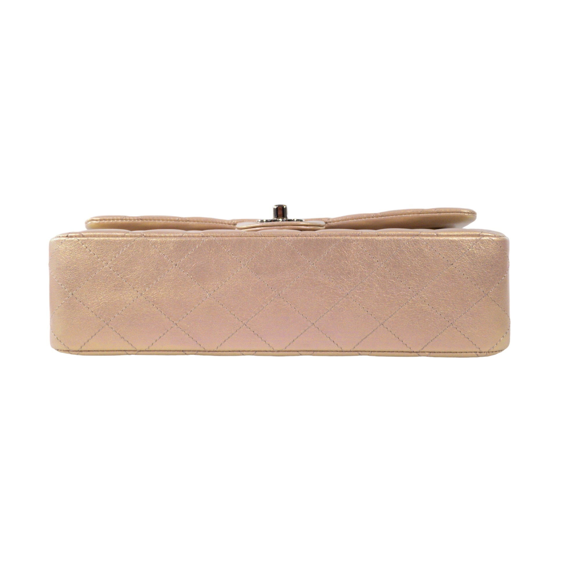 This is an authentic Chanel Medium Classic Flap. The bag has a flap closure with a Double C logo turn lock. The interior is leather and includes one slip pocket and one zip pocket, it also has one exterior pocket on the back side. The strap is woven leather and metal and allows for shoulder carry.
