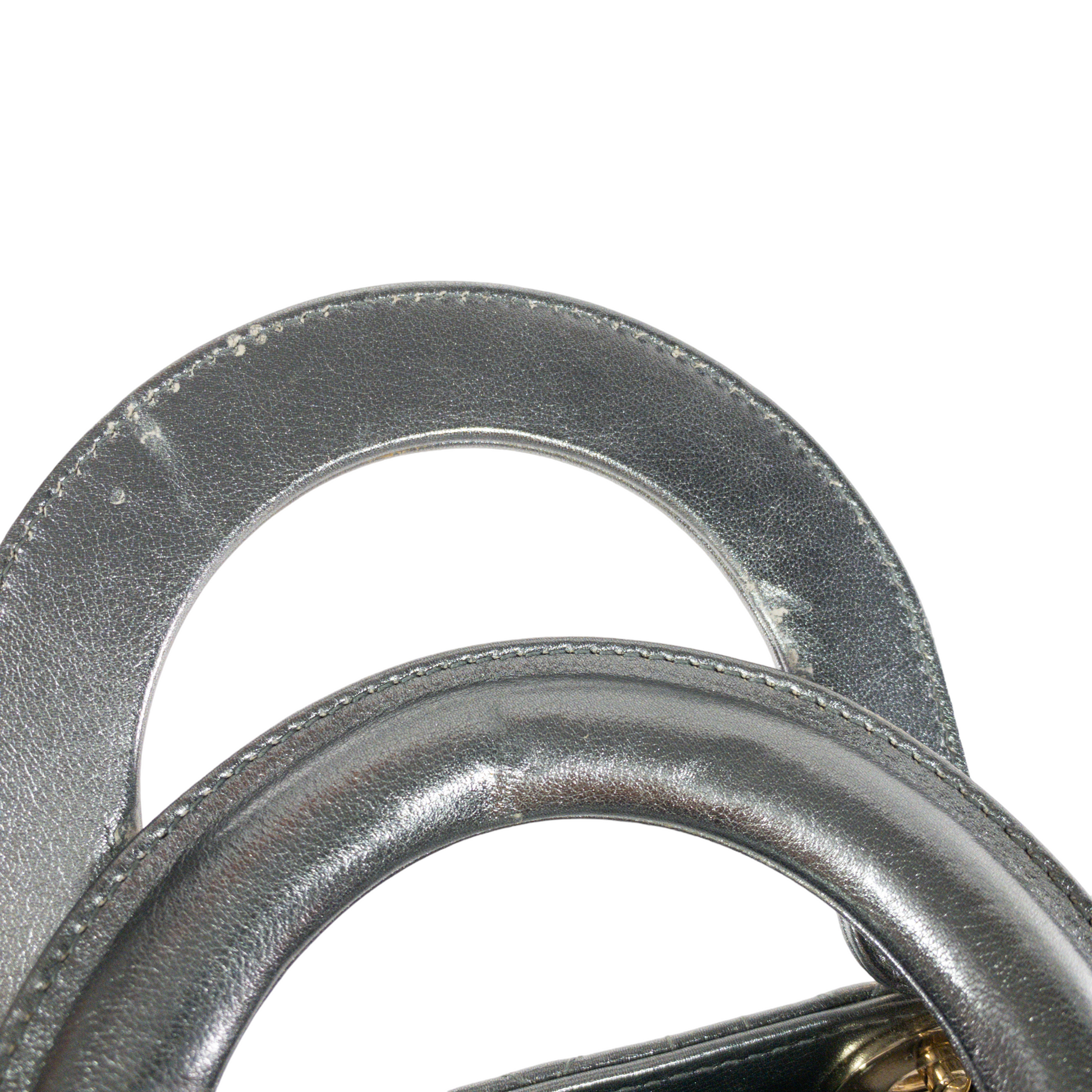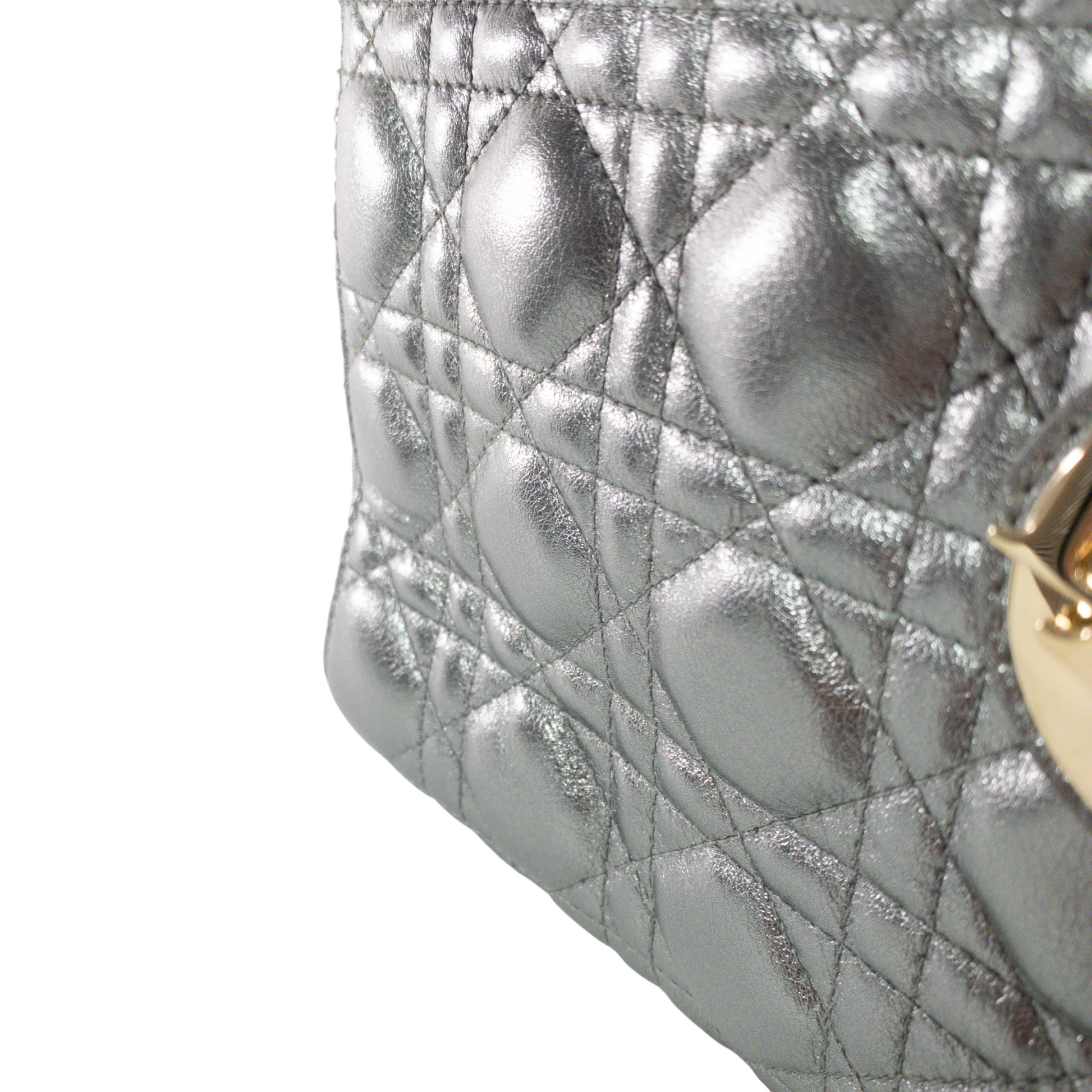 This is an Authentic Dior Lady Dior in size Small. Metallic silver Cannage-quilted lambskin exterior with light gold hardware. Two top handles with removable strap. Strap comes with set of charms. New model Lady Dior with top flap closure. Lined in fabric.