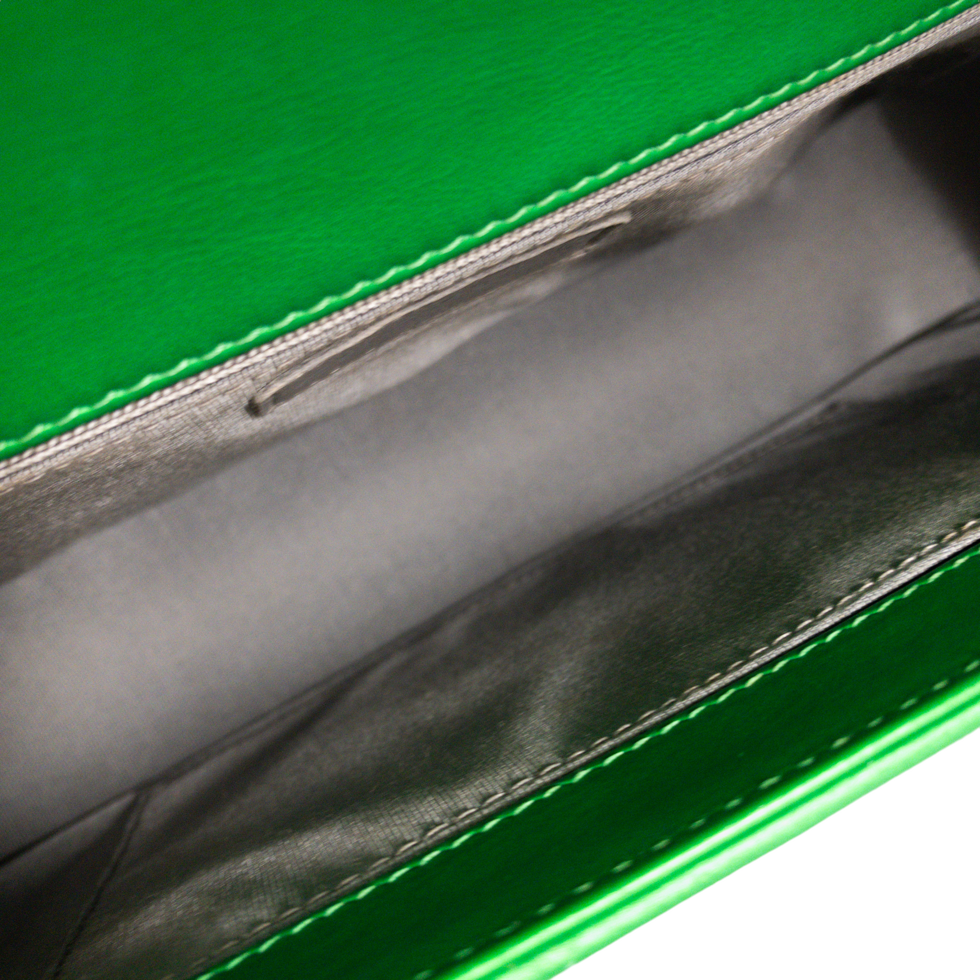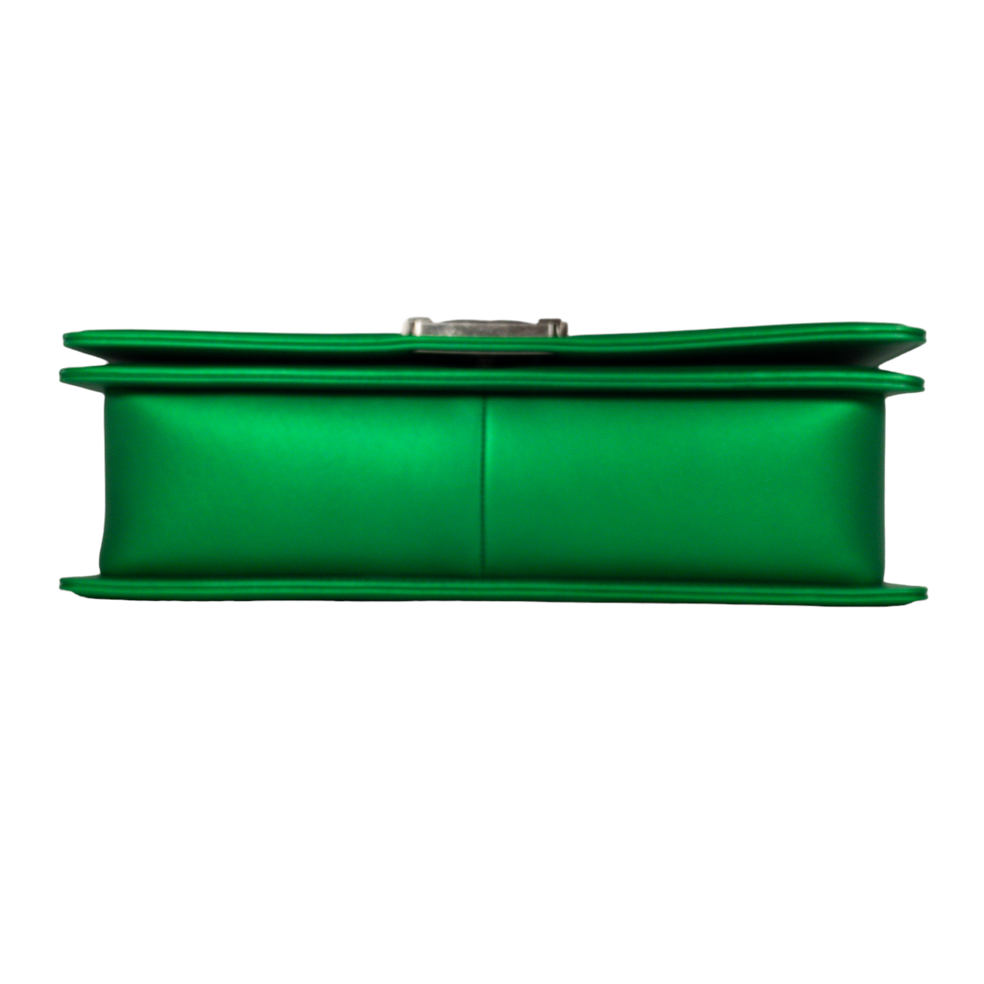 This is an Authentic Chanel Large Boy bag. Formerly titled "New Medium". Metallic green calfskin with ruthenium hardware. The interior is fabric lined and includes one slip pocket and one zip pocket. The bag has a top flap with a Double C logo push lock closure with green glitter enamel on clasp. The strap is metal and leather and can be worn on the shoulder or as a crossbody.