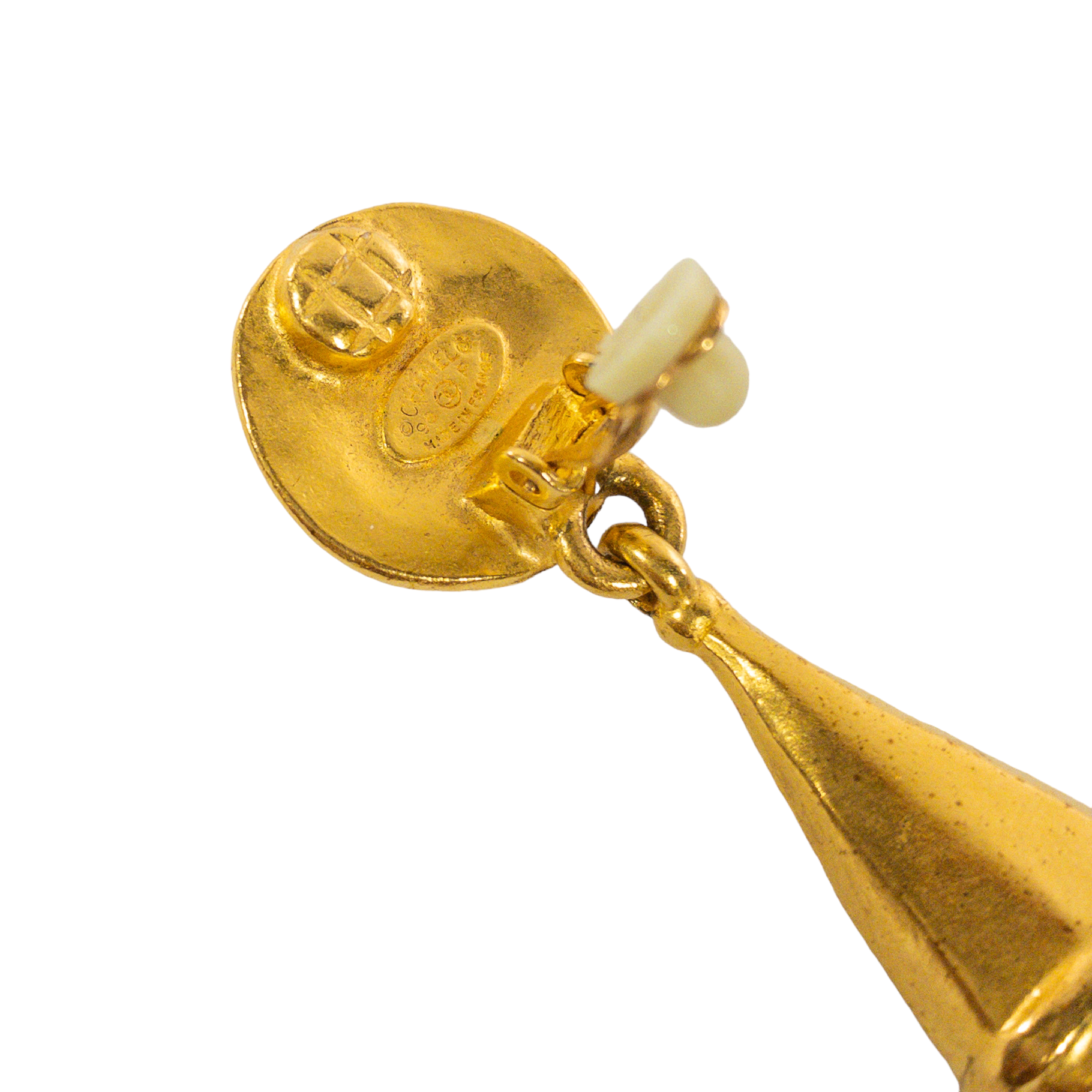 This is an authentic Chanel vintage CC Teardrop dangling earrings. Plated gold with CC embossed on post. Clip on style.