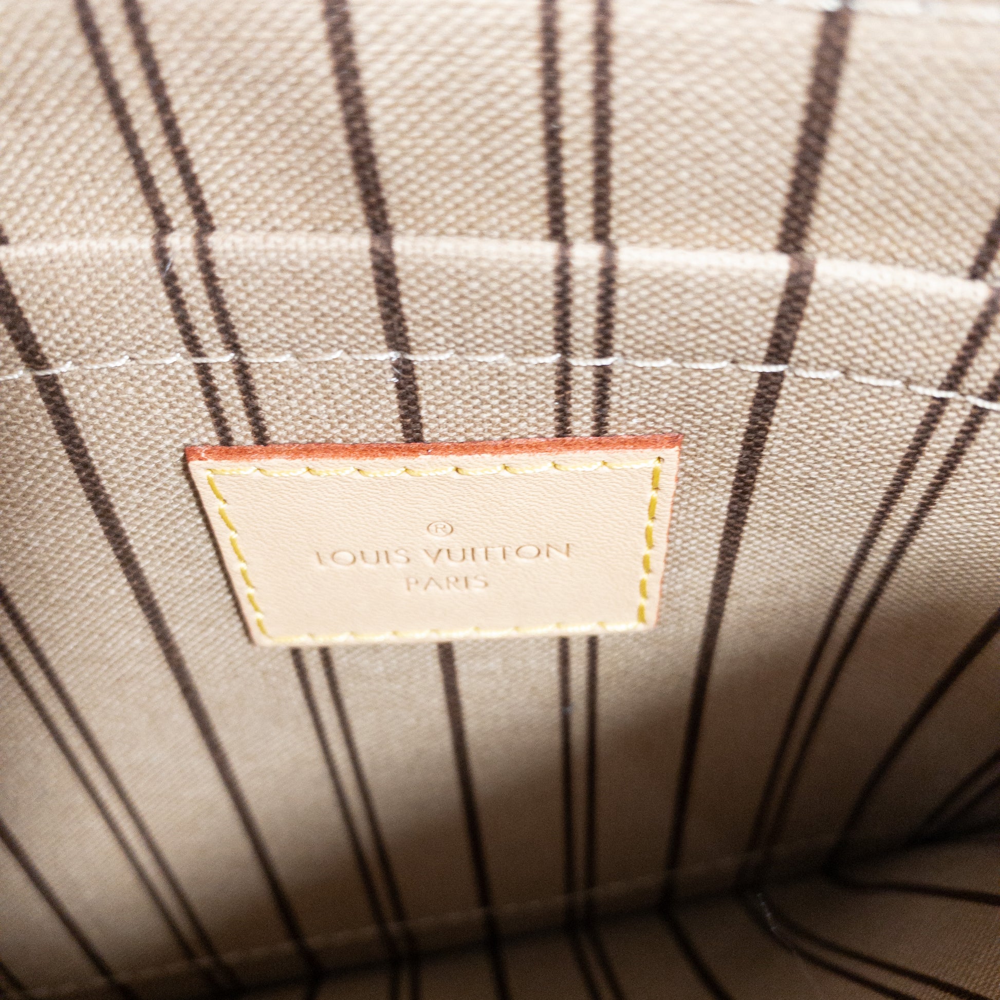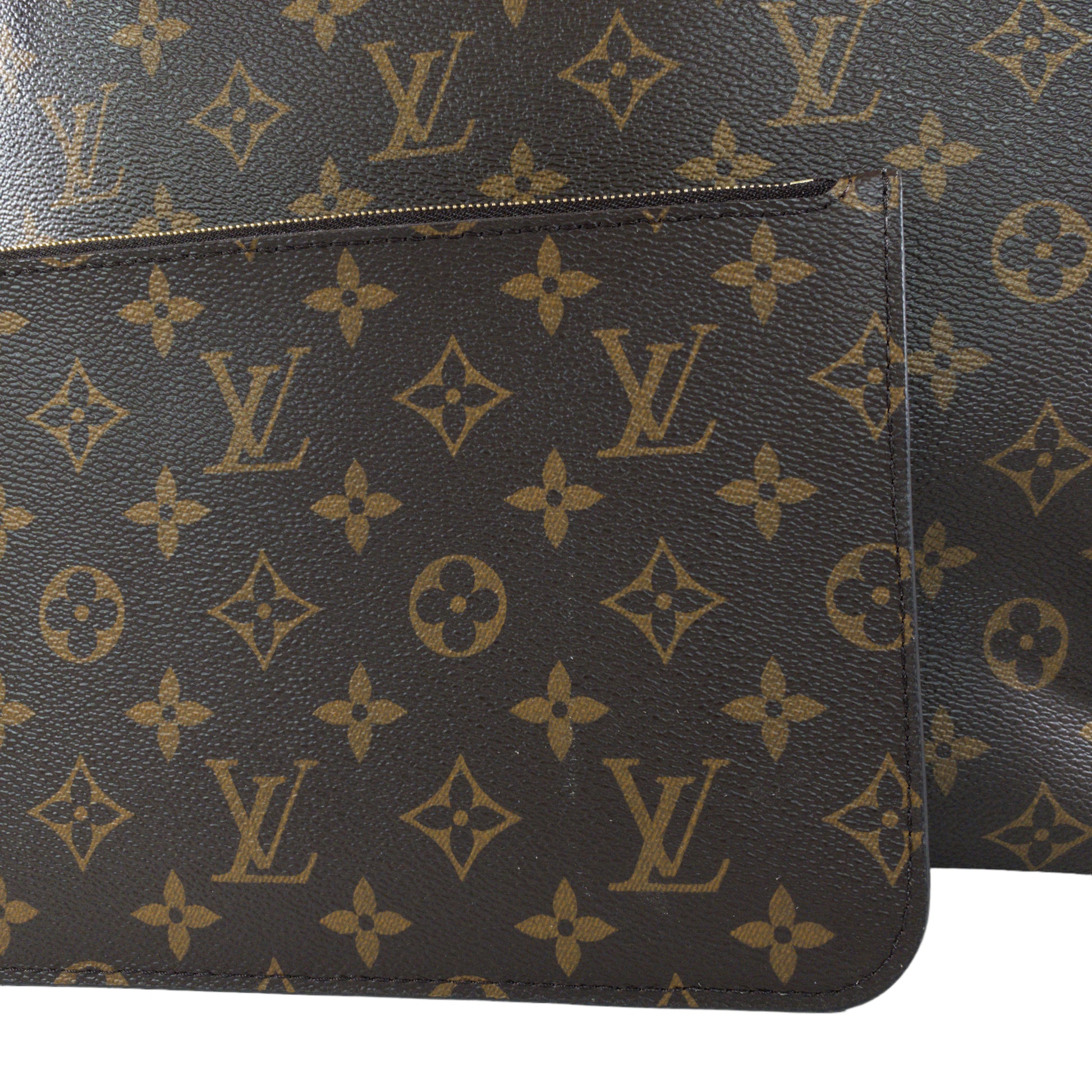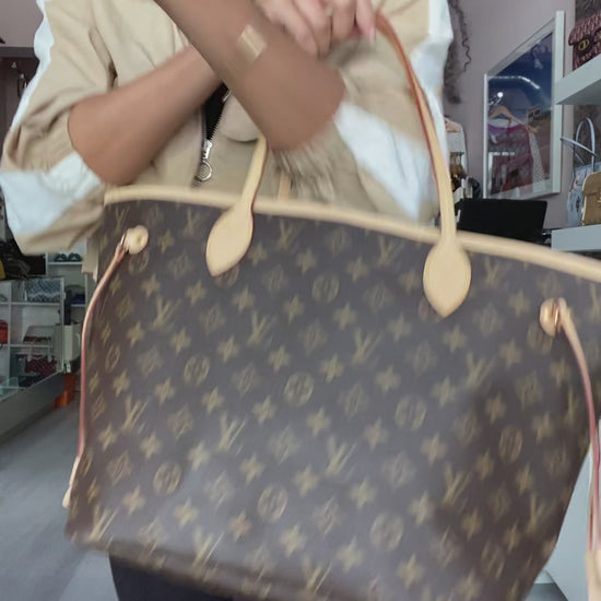 This is an authentic Louis Vuitton Neverfull MM. Classic Monogram coated canvas exterior, with vachetta leather trim. Two shoulder straps with lobster claw clasp closure. Brown canvas interior. Detachable zip pouch