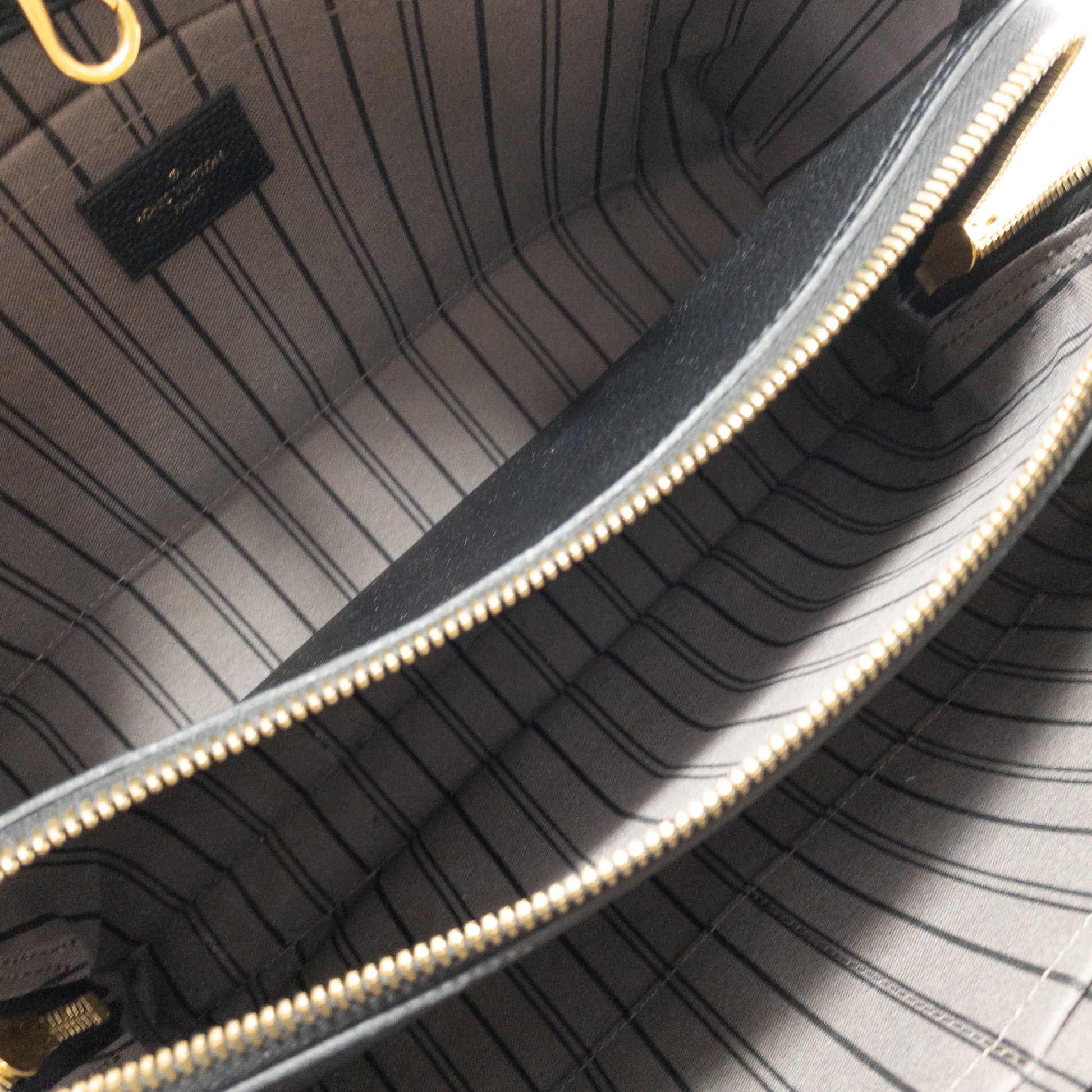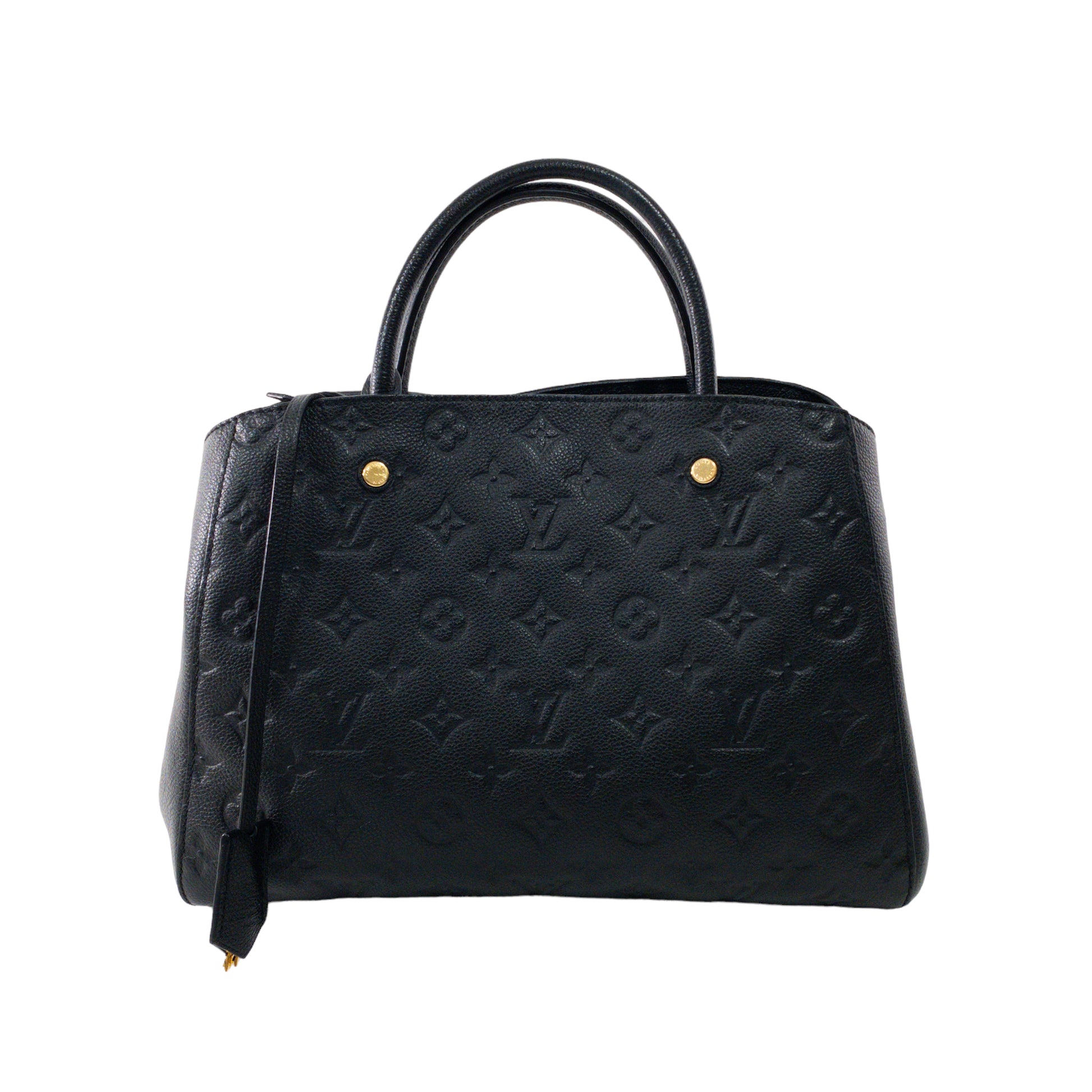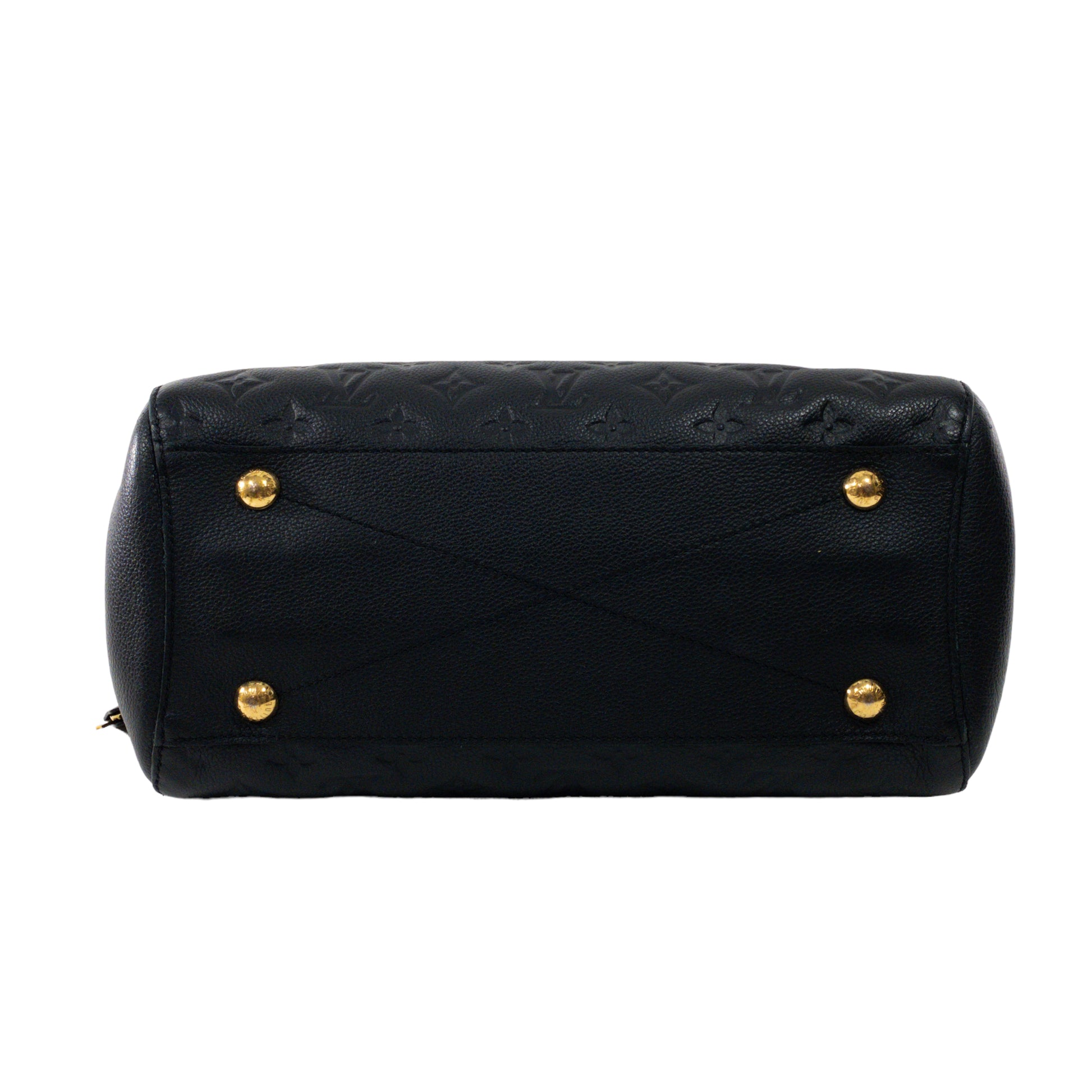 This is an authentic Louis Vuitton Montaigne in black Empreinte leather. Embossed pebbled leather with monogram print. Two leather top handles with lobster claw clasp closure. Two main interior compartments with zipped pocket in between. **MISSING ORIGINAL DETACHABLE STRAP**
