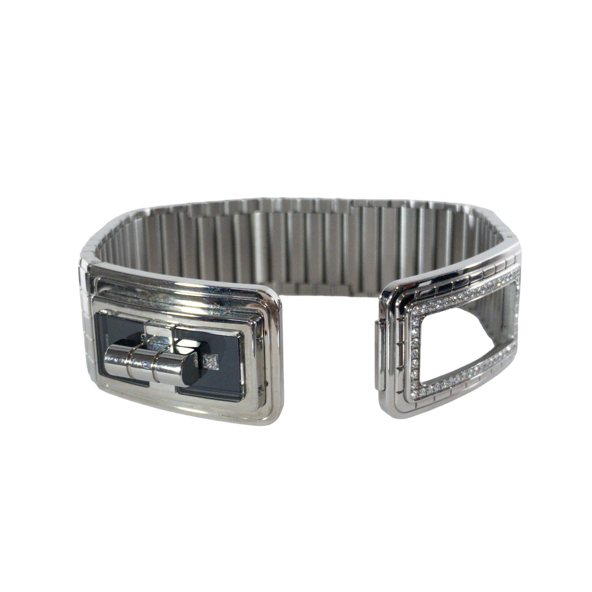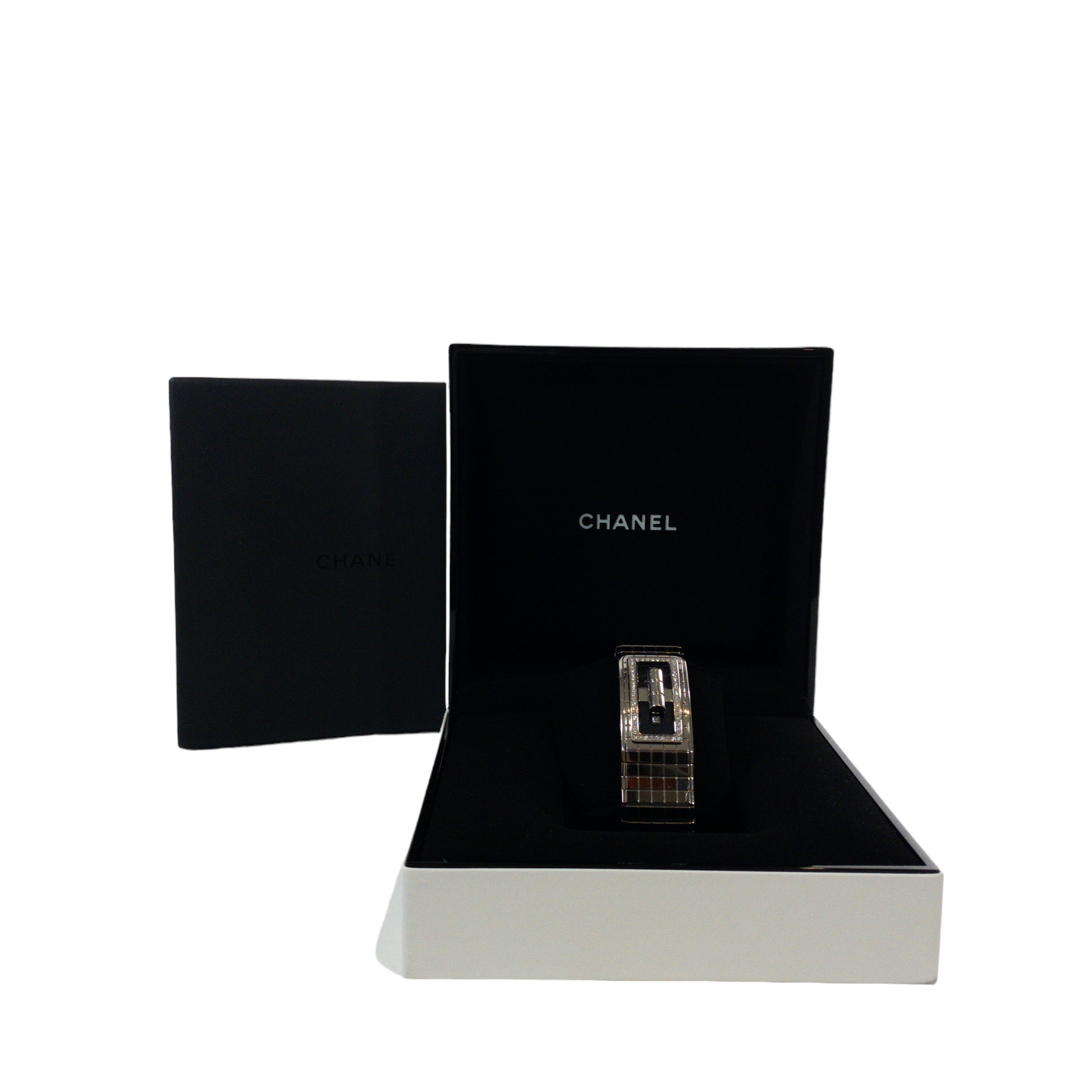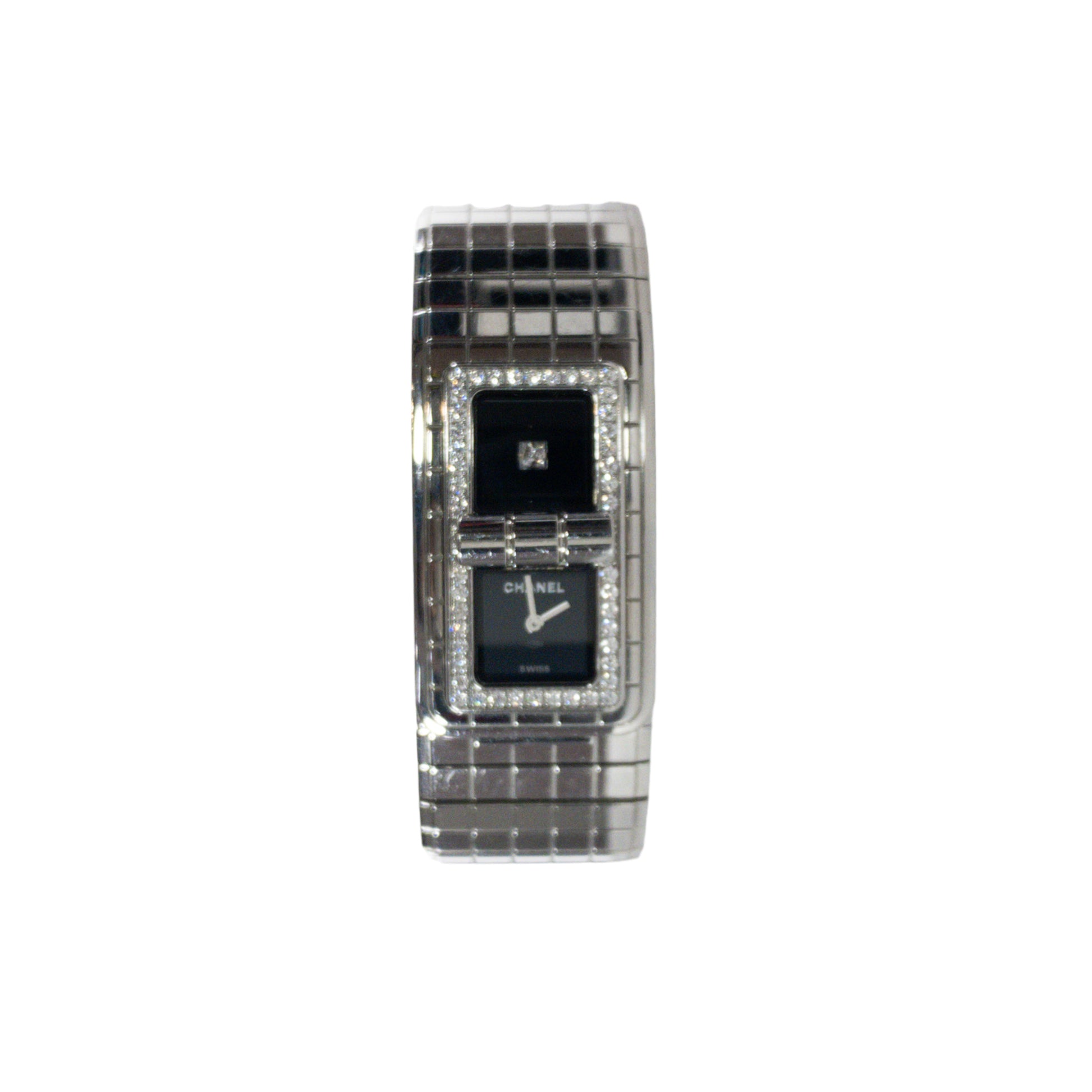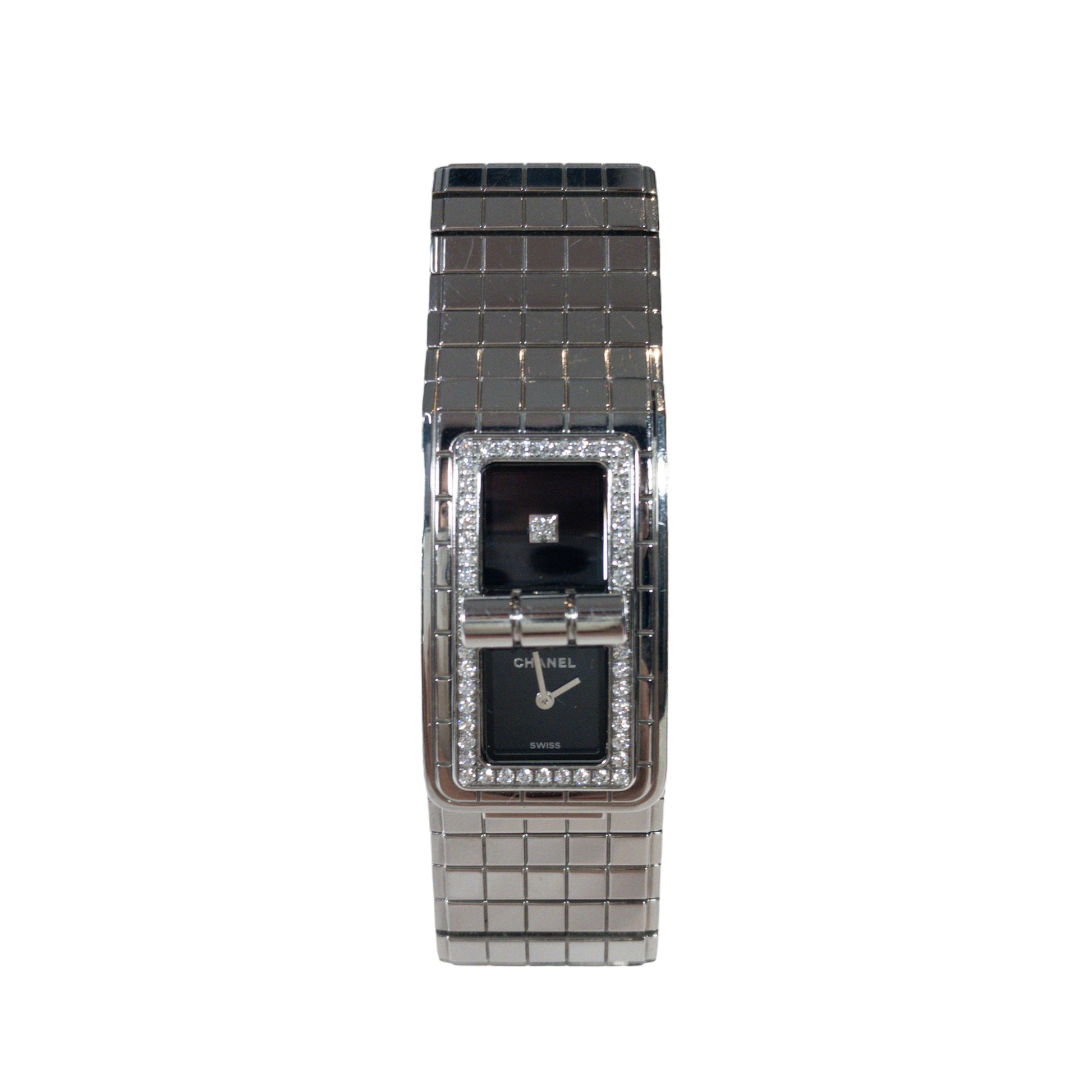 This is an Authentic Chanel Code Coco Watch. Steel throughout with 52 brilliant-cut diamonds around the bezel of the watch. Reissue turn-clasp detail at closure.