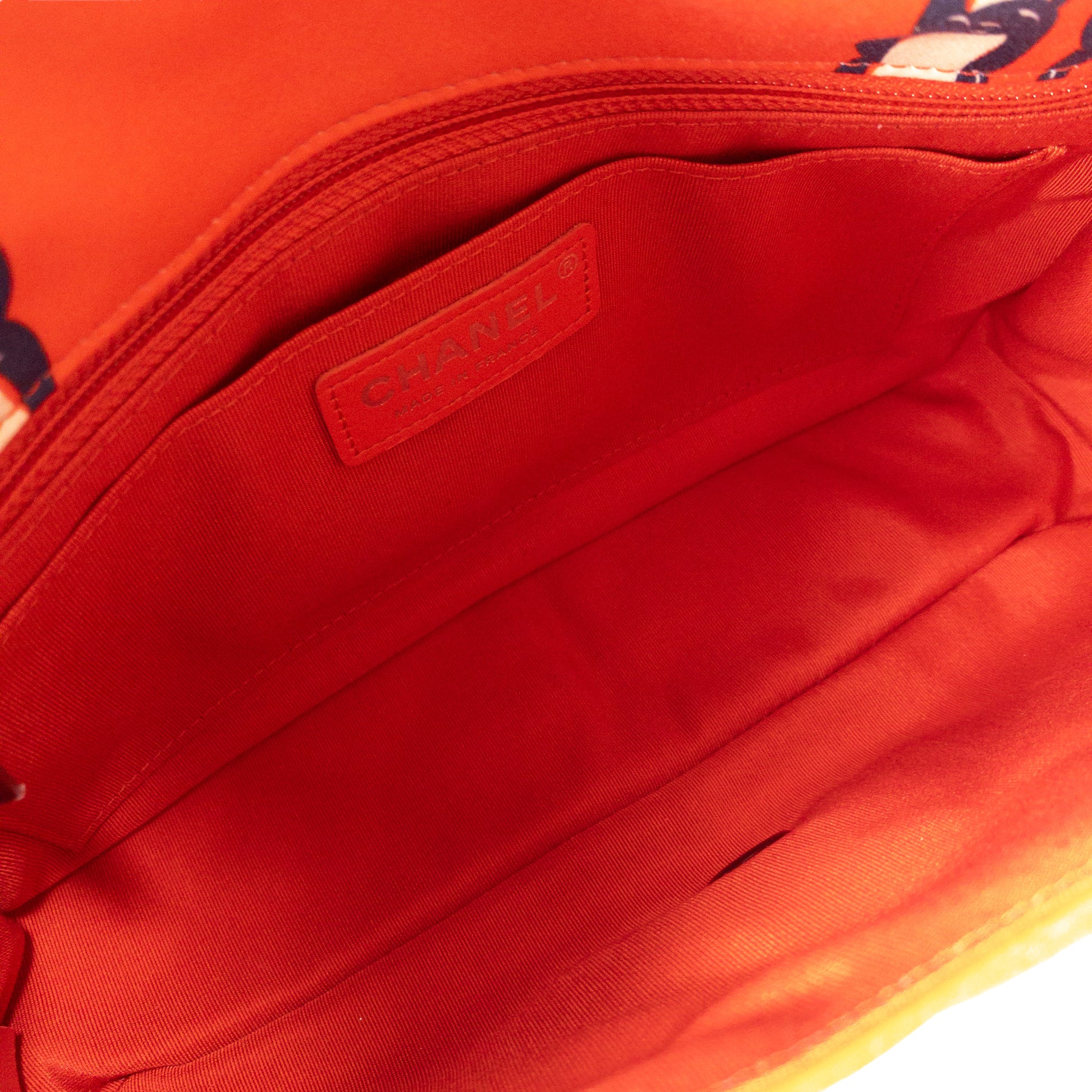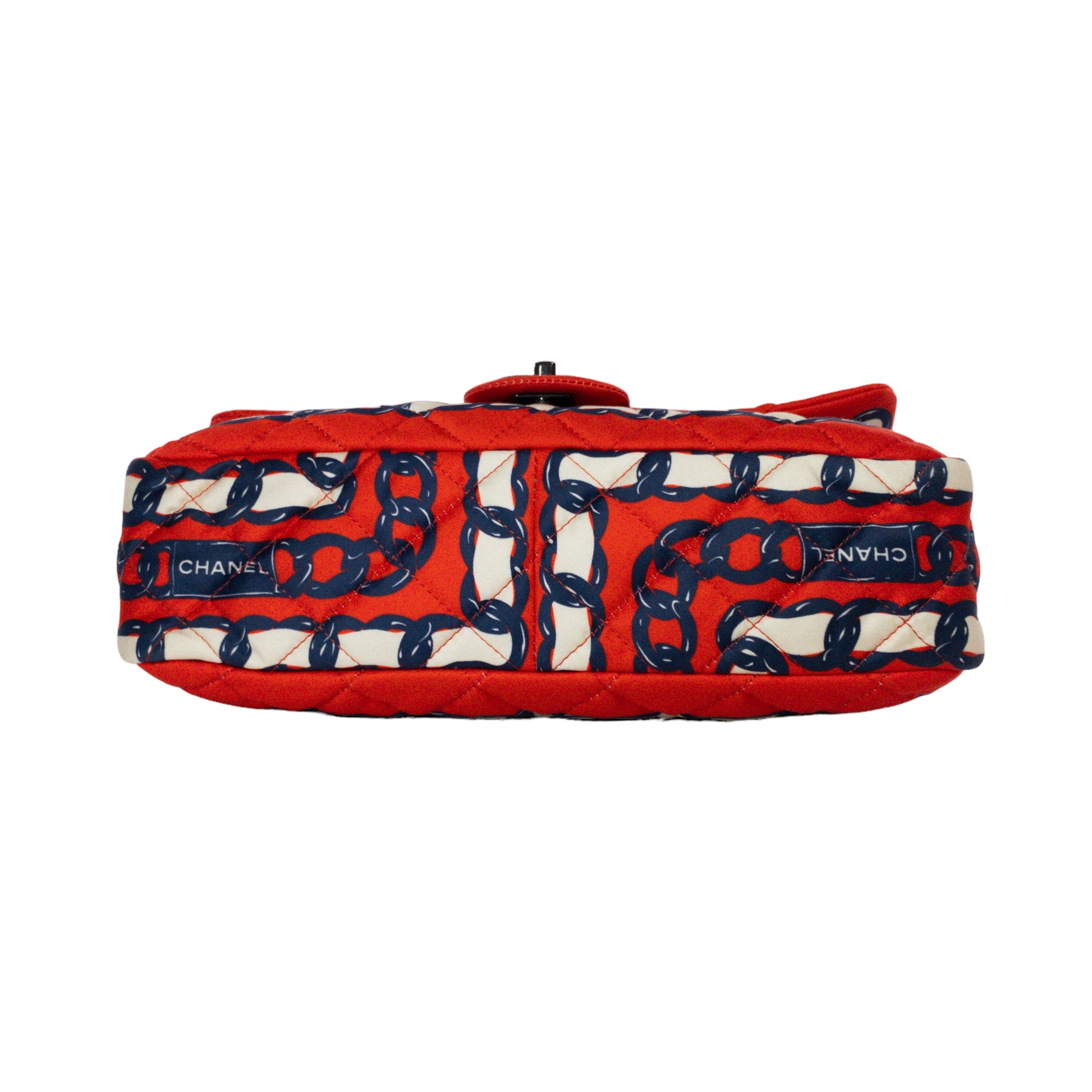 This is an authentic Chanel Medium Classic Single Flap. Printed silk exterior with gunmetal hardware. The bag has a flap closure with a Double C logo turn lock. Fabric interior and includes one slip pocket and one zip pocket. The strap is woven leather and metal and allows for shoulder carry.