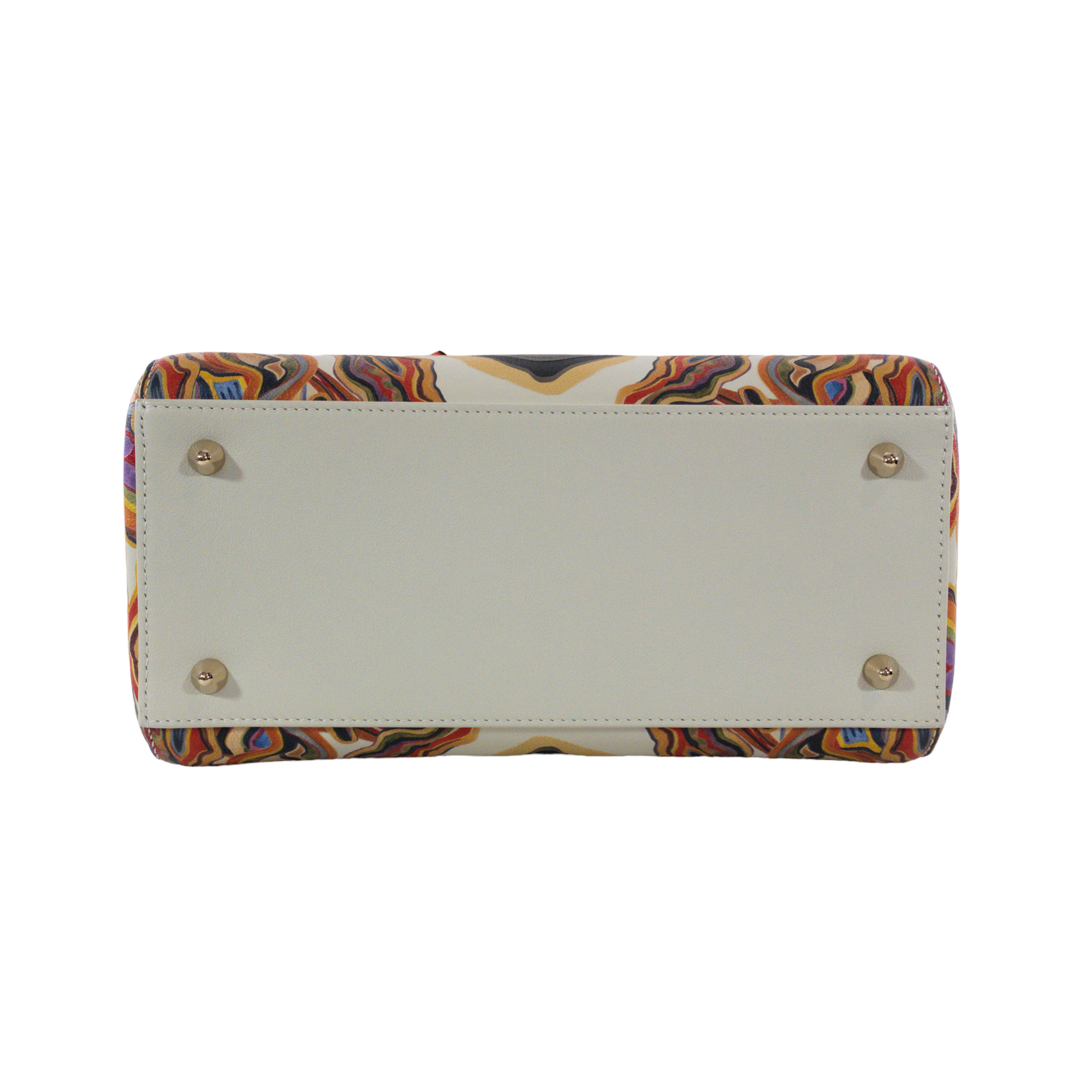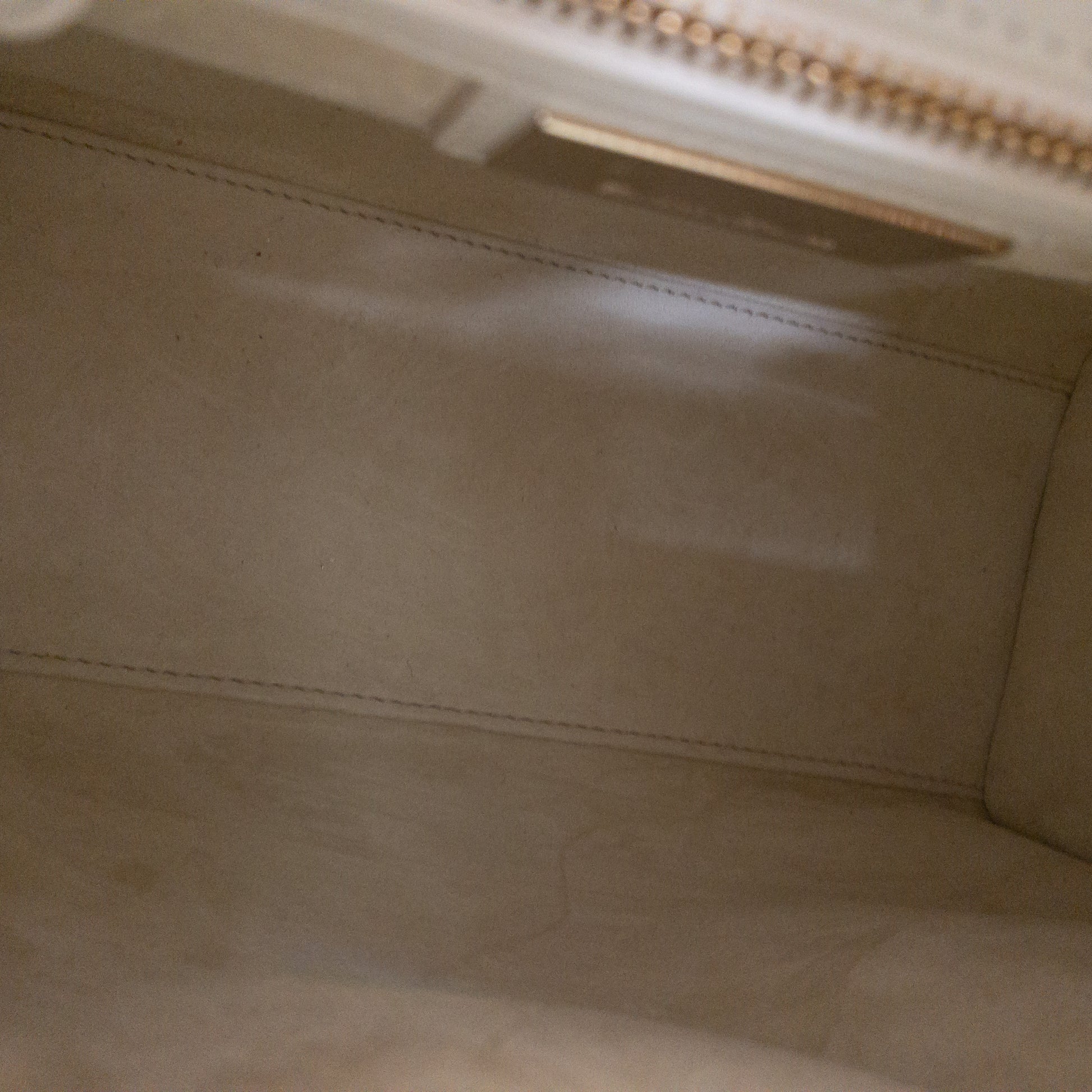 This is an Authentic Dior Limited Edition Lady Dior in size Medium. White leather exterior with heart print. Two top handles with wide removable strap. Original model Lady Dior with zippered closure. Includes matching twilly