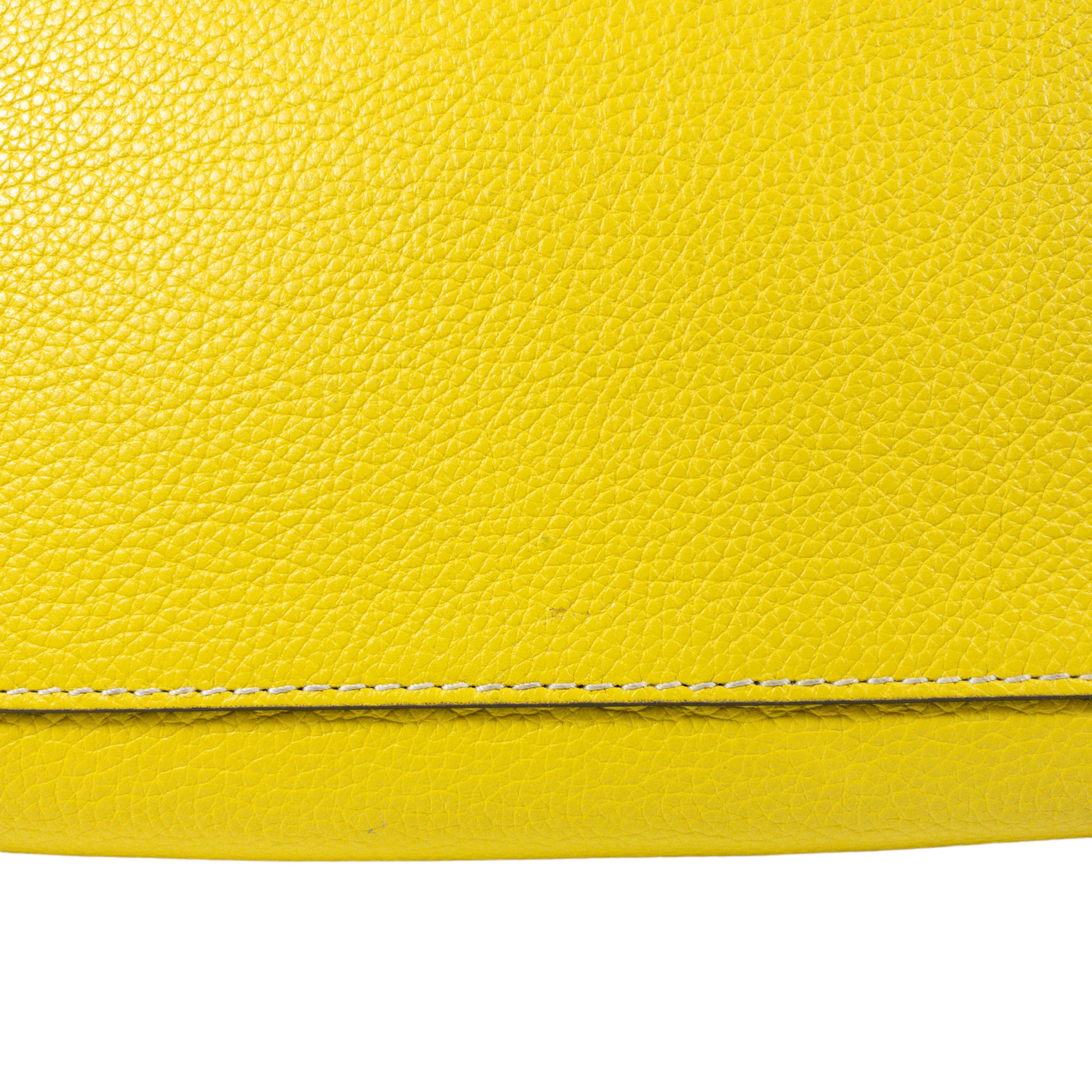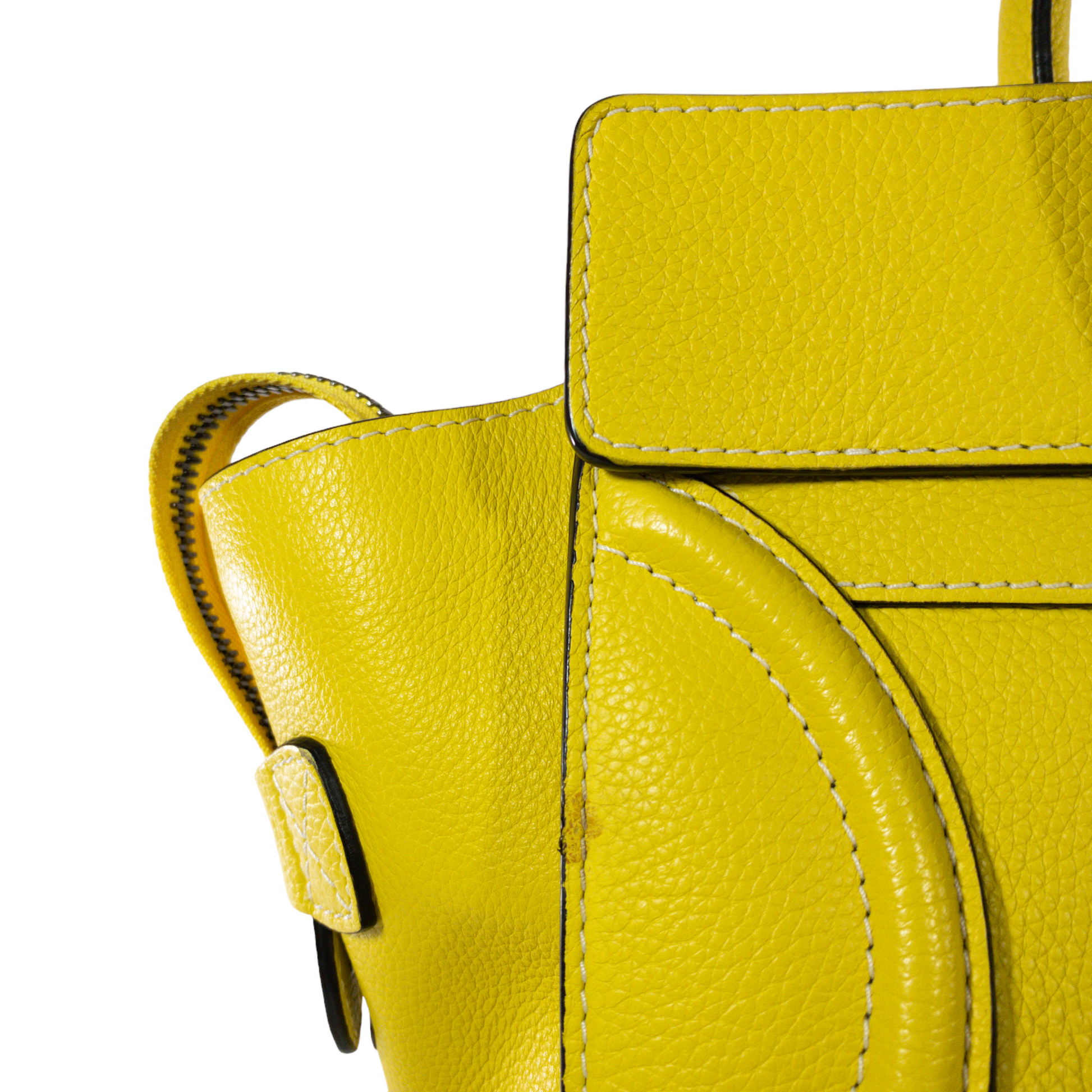 This is an authentic Celine Mini Luggage in the yellow pebbled/drummed leather. Double rolled top handles with front zipped pocket. Zip top closure with microfiber interior lining. Large interior cavity with zipped pocket inside. Microfiber interior