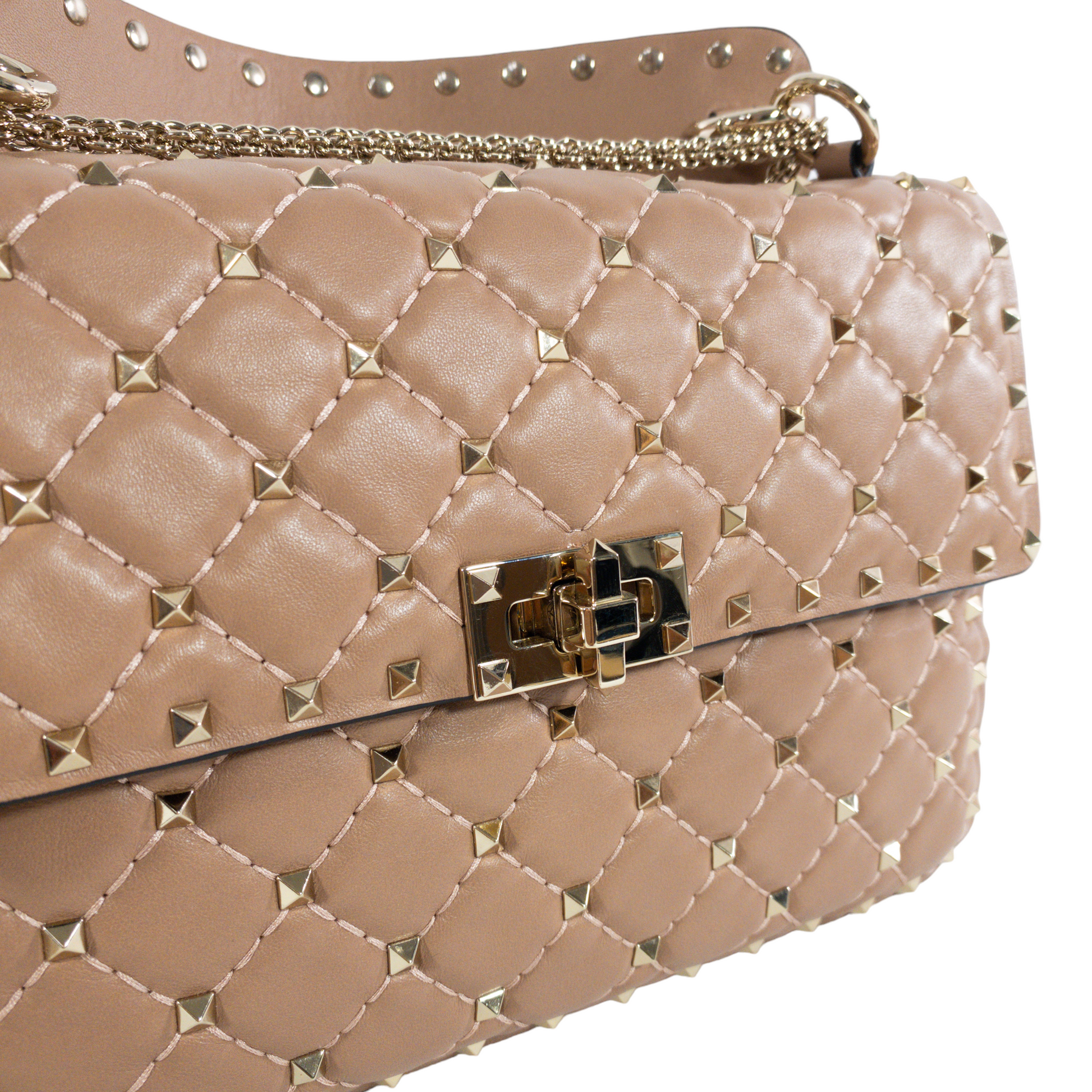 This is an authentic Valentino quilted Spike Flap bag. Gold hardware adn studs throughout. Detachable top handle with turn lock closure and detachable chain strap. Lined in smooth leather. Chain strap, with detachable top handle