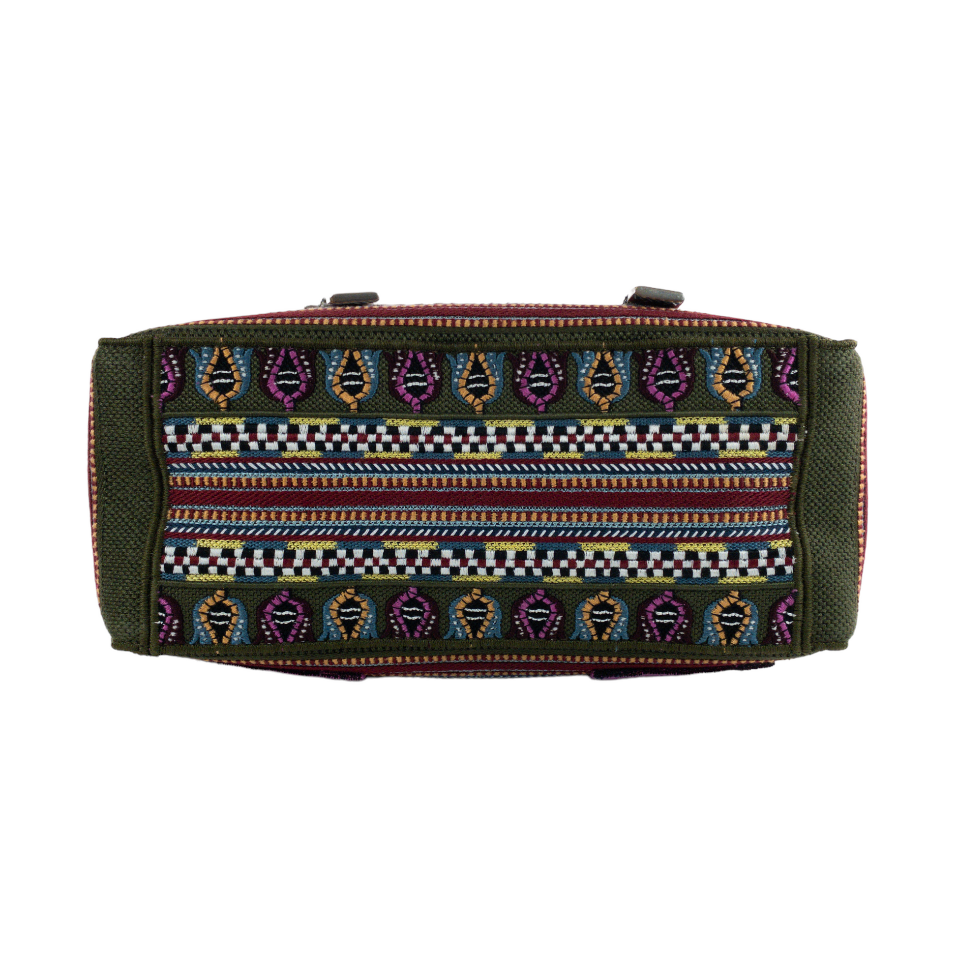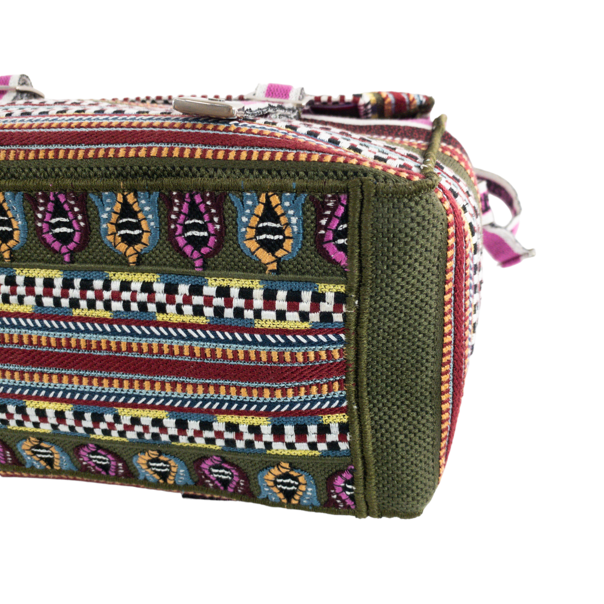 This is an Authentic Dior Camp embroidered messenger bag. Pink with green and multicolor canvas fibers. 'Christian Dior' embroidered lettering in front. Large flap with buckle closure. thin adjustable crossbody strap. Unlined.