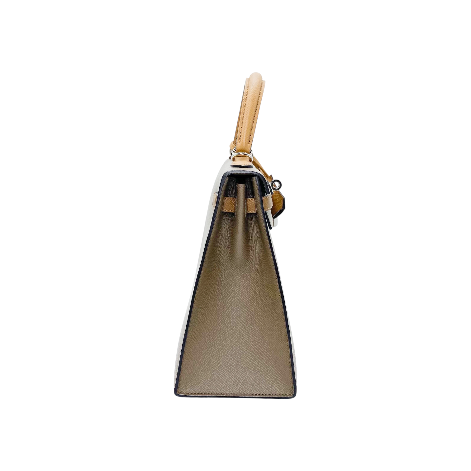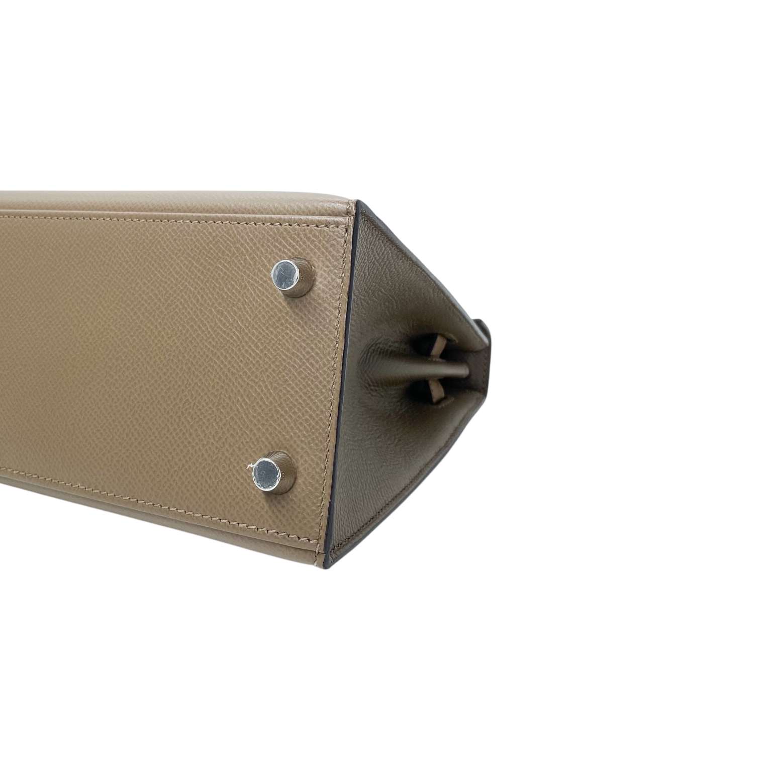 This is an Hermes Etoupe, Biscuit, and Alezan Kelly 25 in epsom leather with palladium hardware. This amazing handbag features a 3.5-inch top handle, a 17-inch strap, a lock and key, and a strap and turn lock closure. The front flap opens to a epsom leather lined interior that features a patch pocket and a zipper pocket. This is an amazing handbag for any occasion!