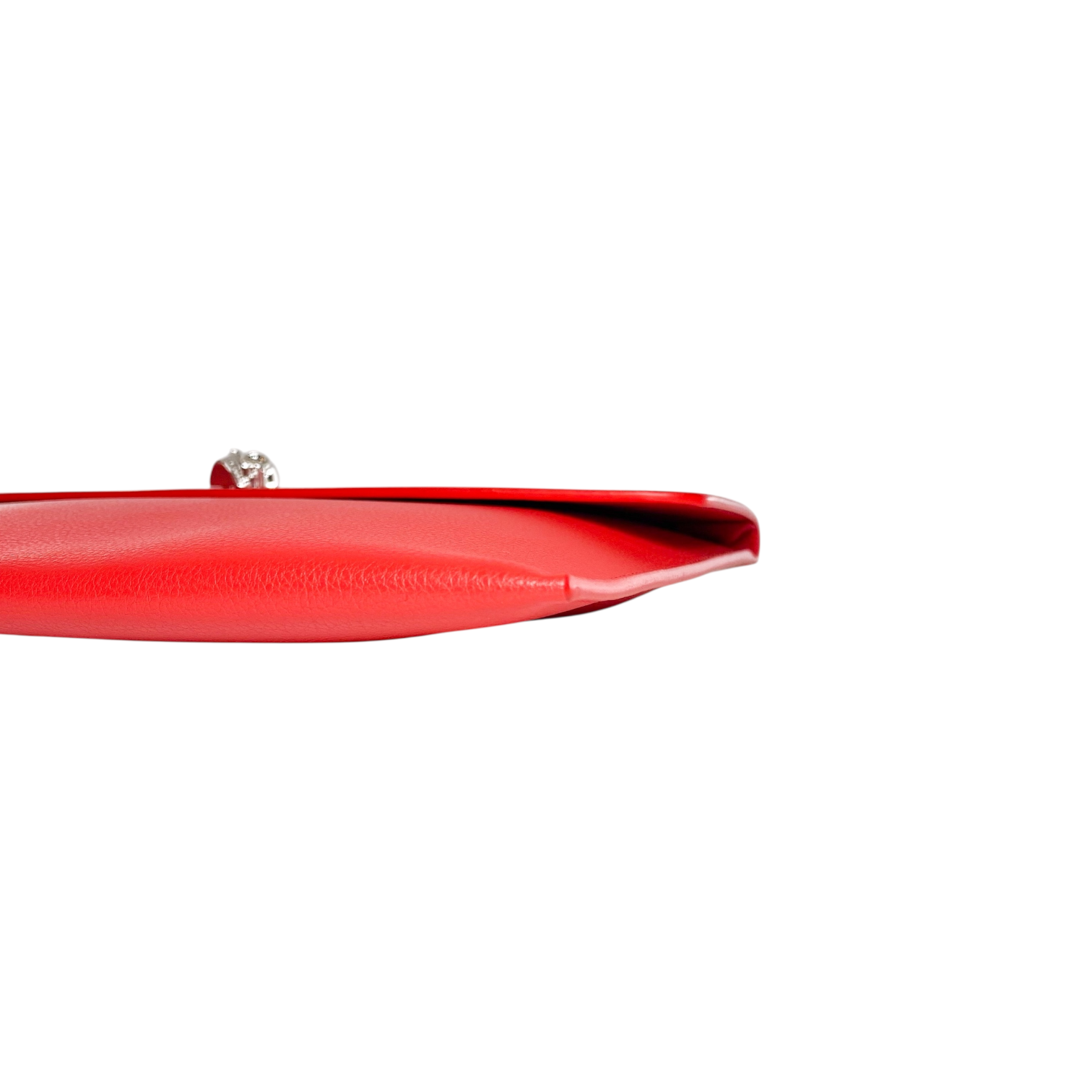 This is an Alexander McQueen Red Envelope in leather with silver hardware. This chic clutch features a silver skull and a snap closure. The interior is lined in red leather. This is an amazing clutch for many occasions!