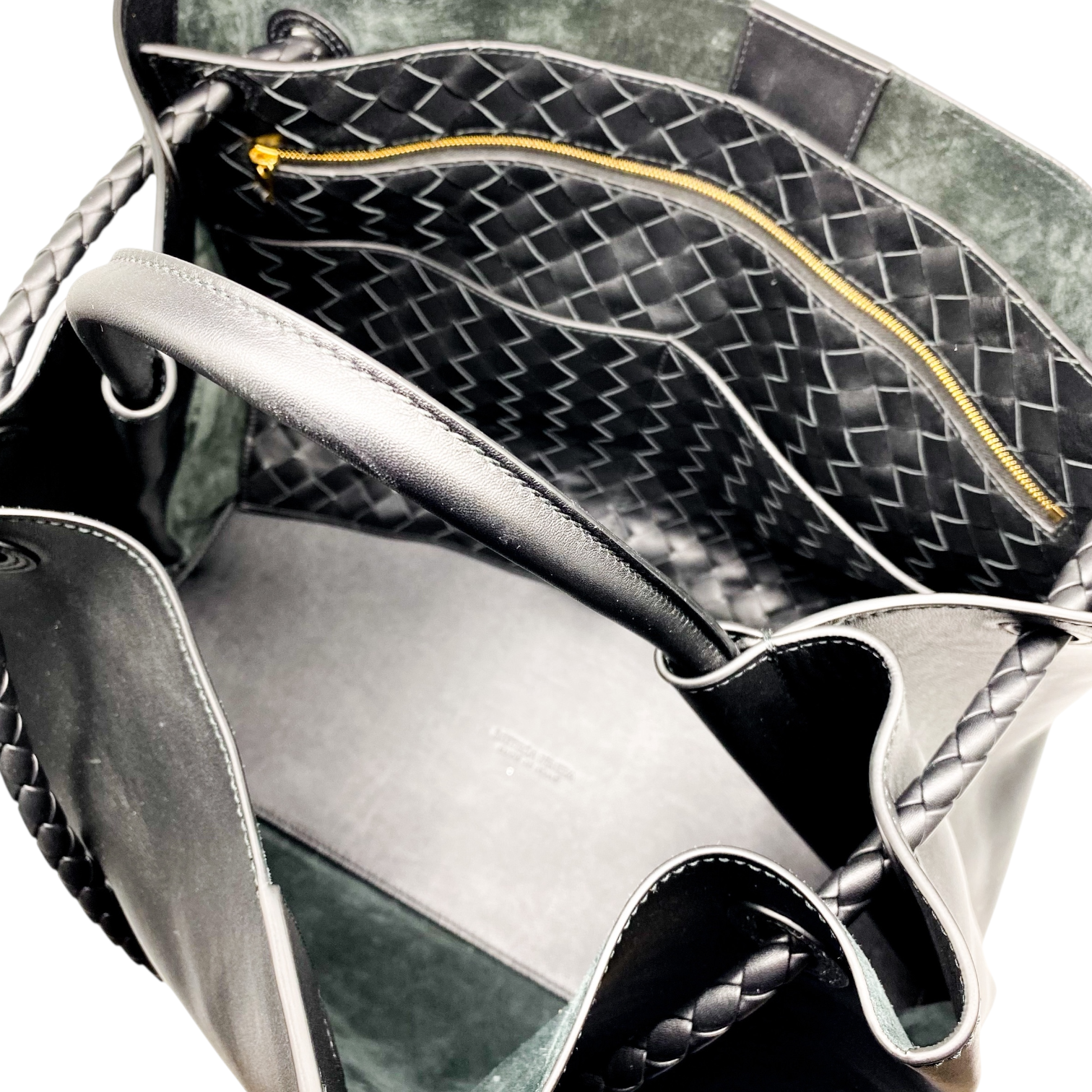 This is a large Bottega Veneta Black Andiamo Tote in calfskin leather. This bag features a magnetic closure which opens to a suede lining with two patch pockets and a zip pocket for secure storage. This is a great work and travel bag!