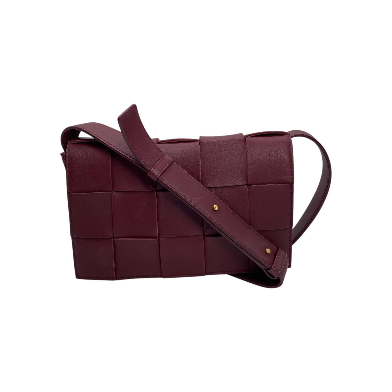 This is a Bottega Veneta Cassette in Merlot nappa leather. This bag features the brand's signature Intreccio weave and opens with a magnetic snap fastening and has an adjustable shoulder strap, gold-tone hardware, and one internal compartment with a slip pocket. This bag can be carried cross body or on the shoulder and is a great addition to your collection!
