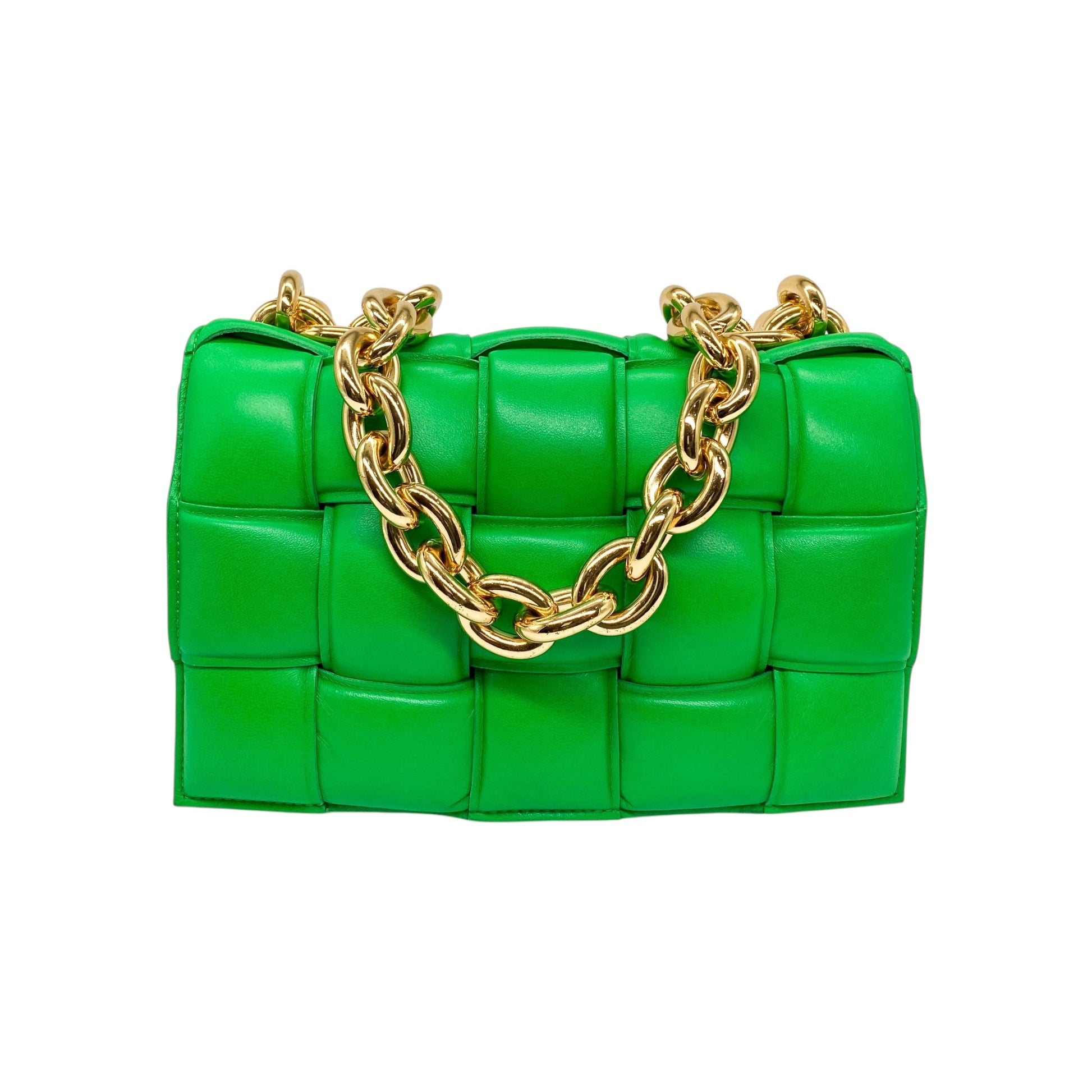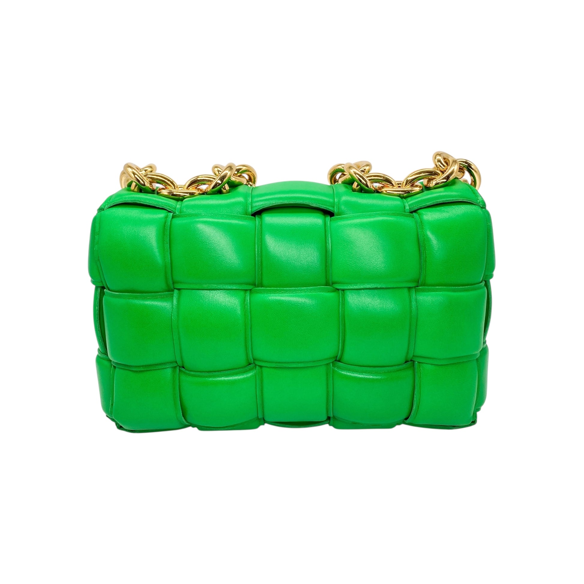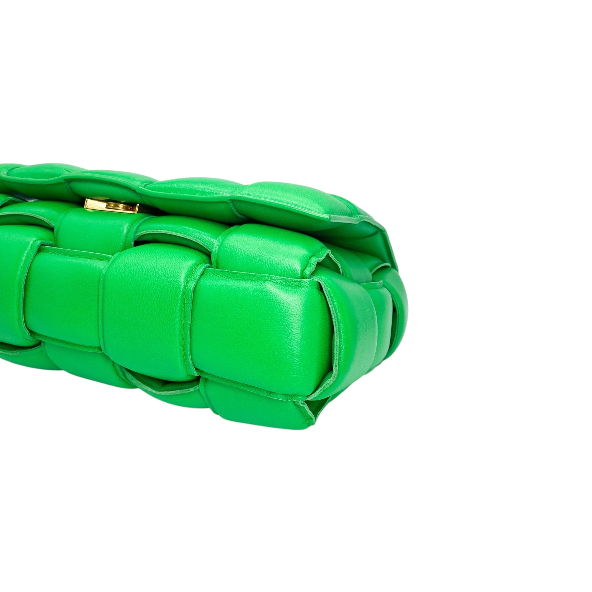This is a Bottega Veneta Parakeet Padded Cassette Bag in lambskin leather with gold hardware. This stylish cassette bag features a top handle, a strap, and a snap closure. The front flap opens to a Parakeet leather lined interior that features a zipper pocket. This is a wonderful everyday handbag for a pop of color!
