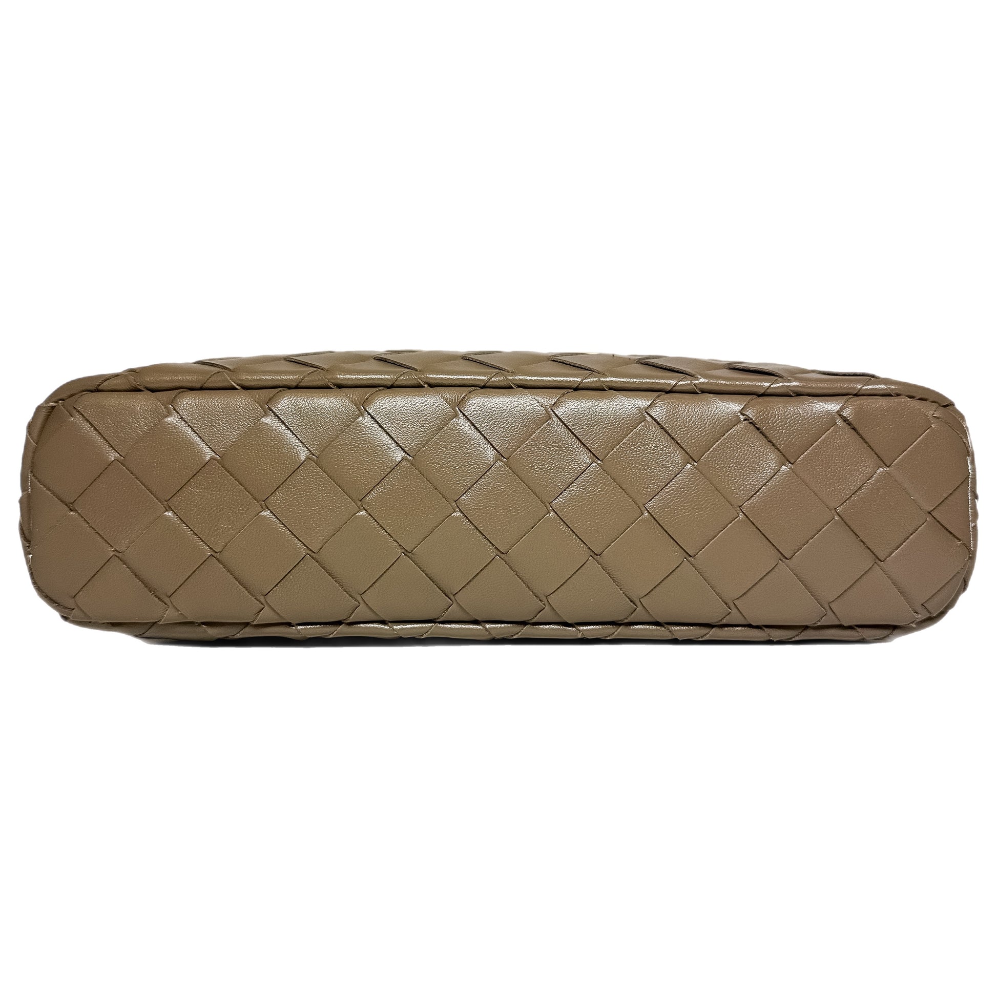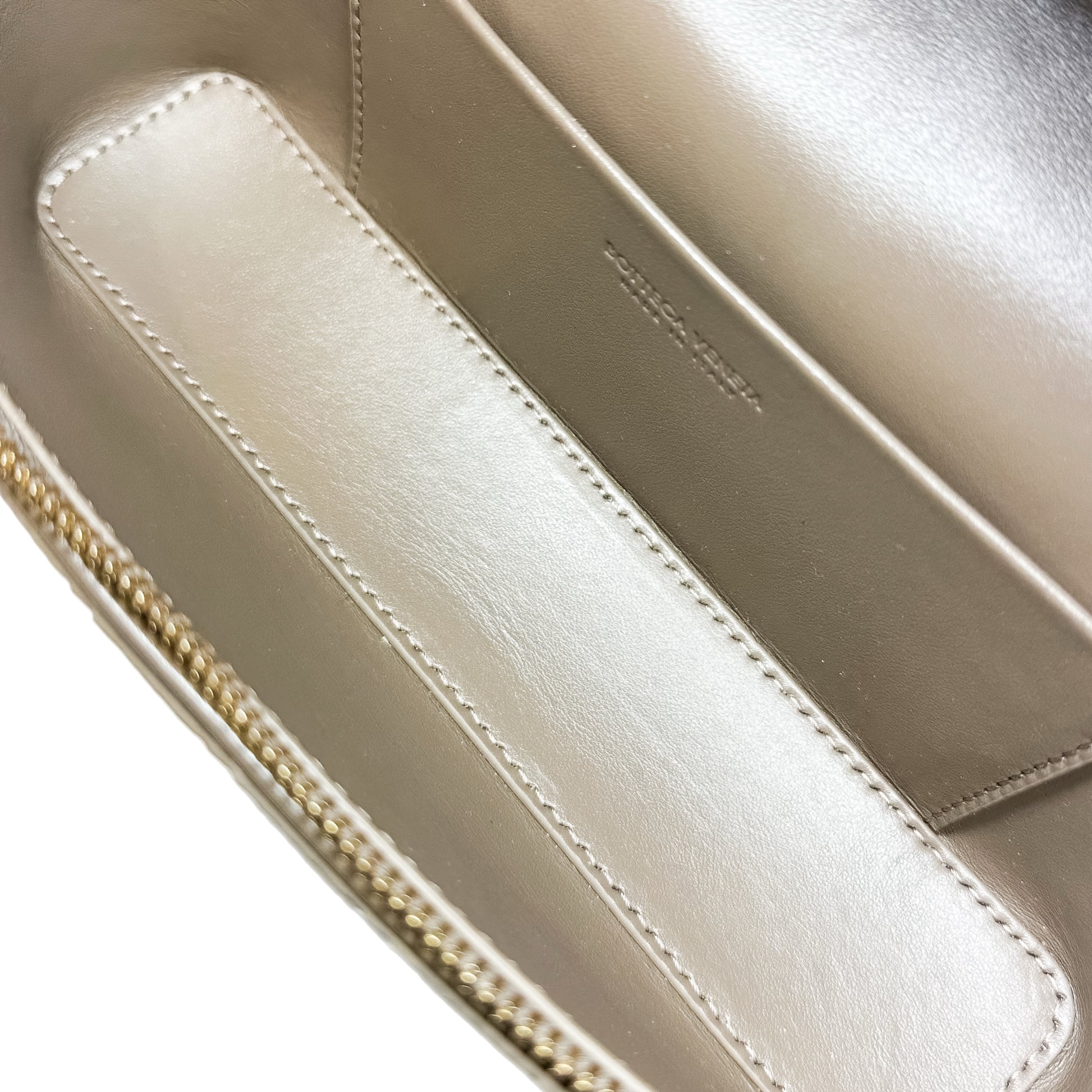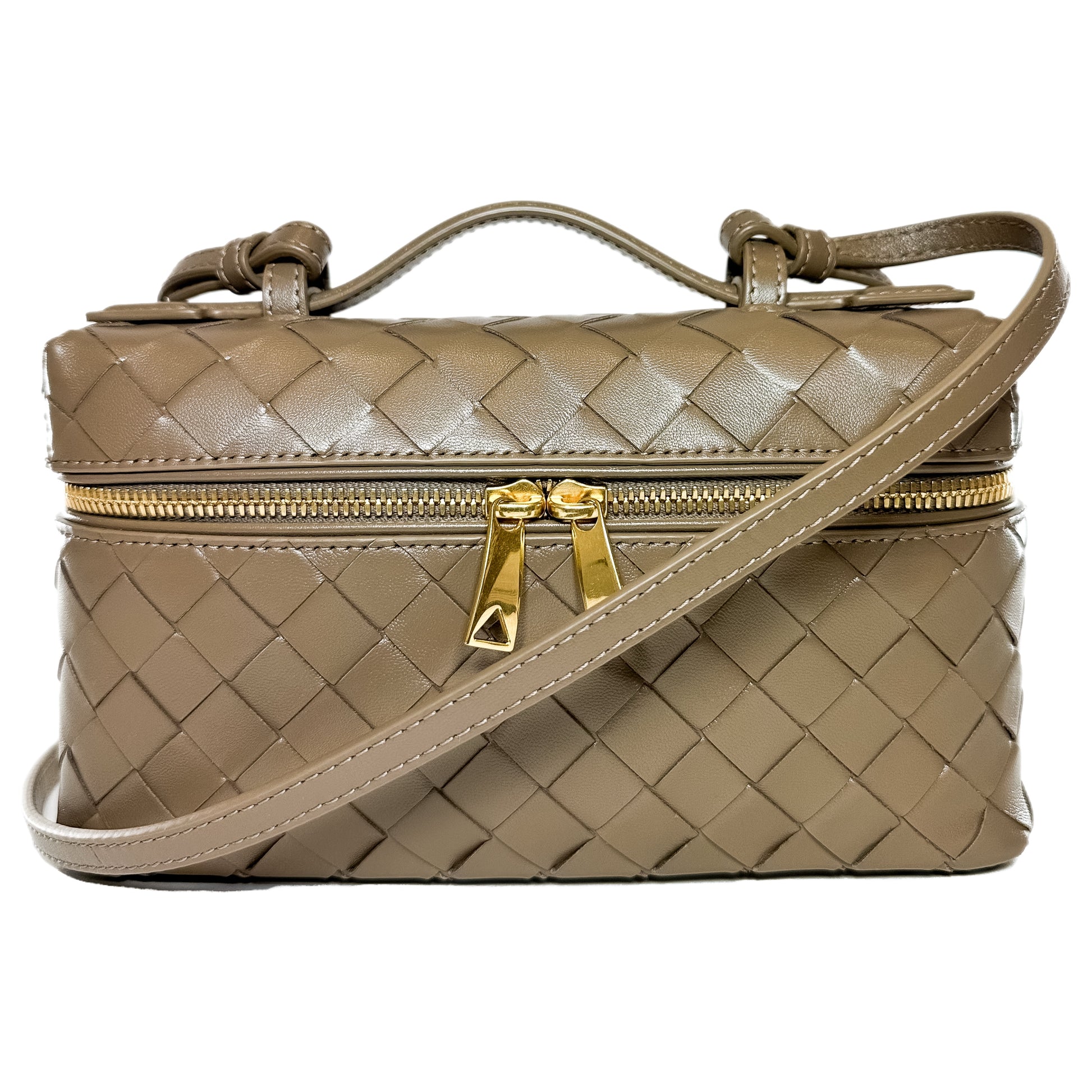 This is a Bottega Veneta Vanity Pinecone Intrecciato Bang Bang Vanity Case in calfskin leather with gold hardware. This stylish handbag features a 1.5-inch handle, a 20-inch adjustable and detachable strap, and a wrap around zipper. The interior is lined in Pinecone leather and features a patch pocket. This is a wonderful everyday handbag!