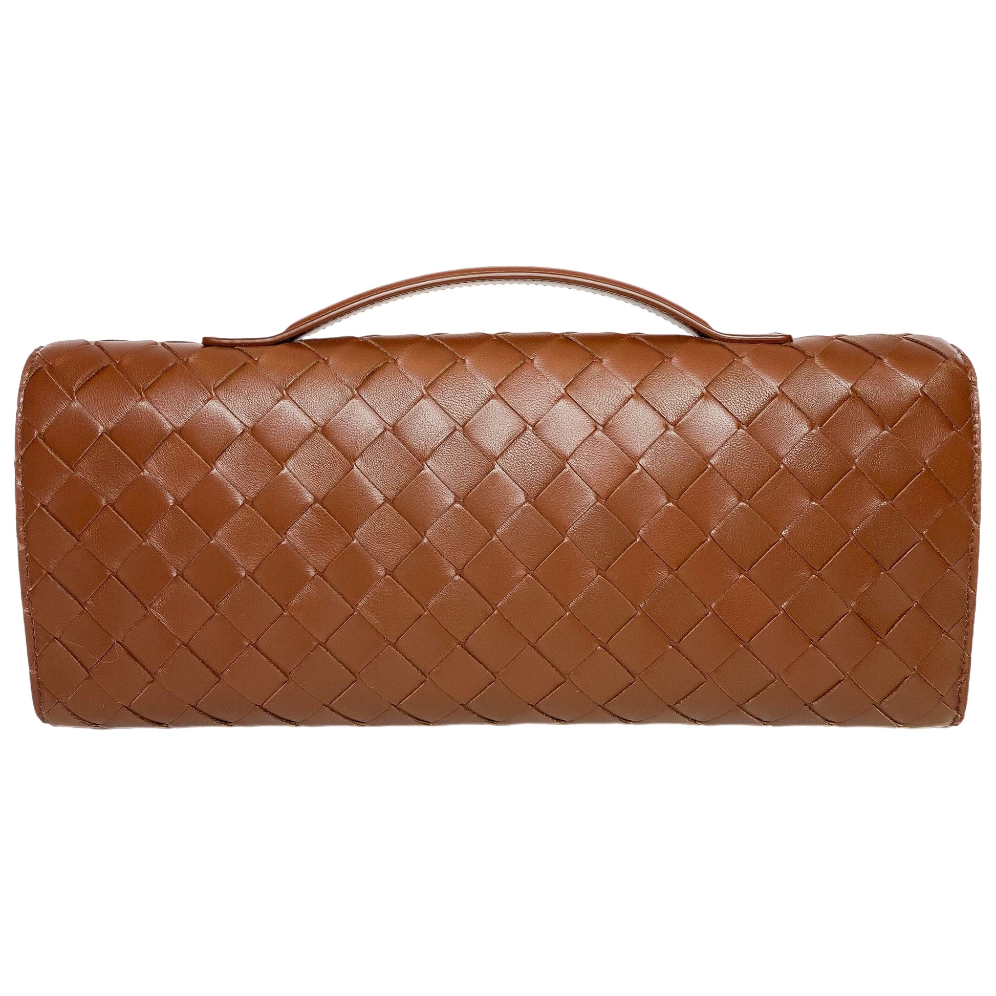 This is a Bottega Veneta Sapele Andiamo Clutch in lambskin leather with gold hardware. This stylish clutch features a 1-inch handle and a knot detail closure. The front flap opens to a Sapele leather lined interior that features a patch pocket and card slots. This is a wonderful clutch for any occasion!