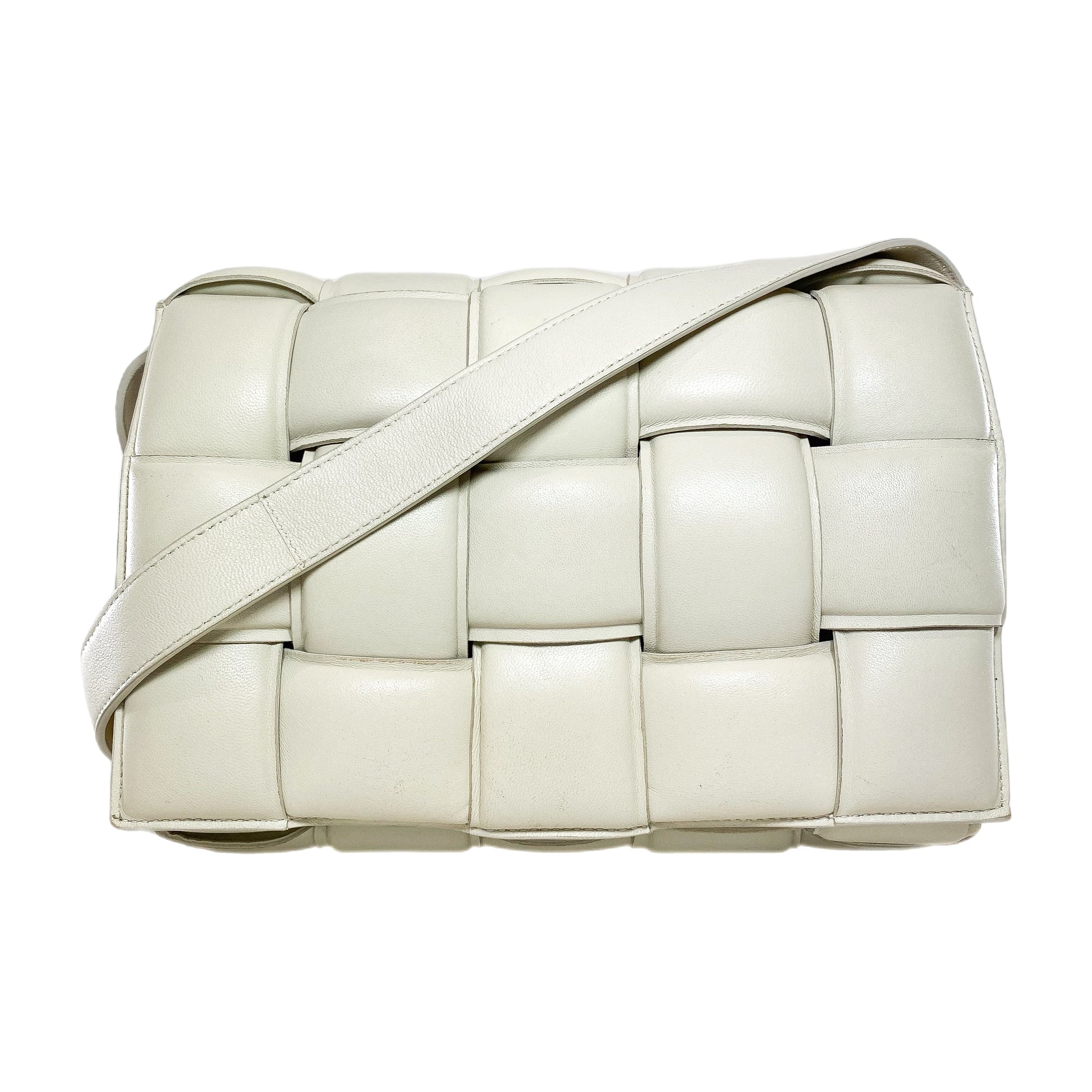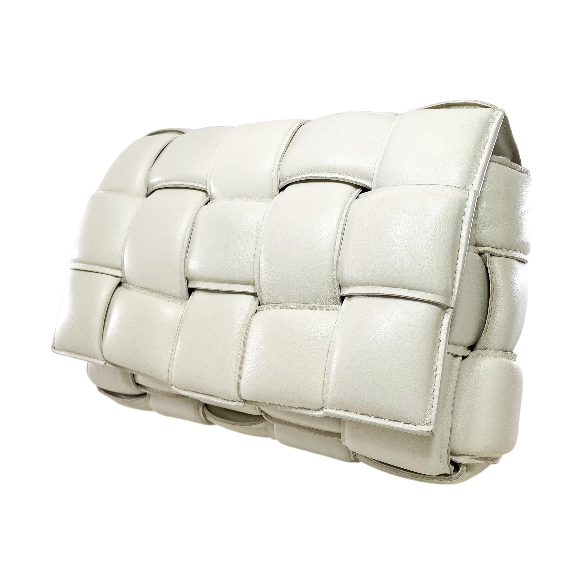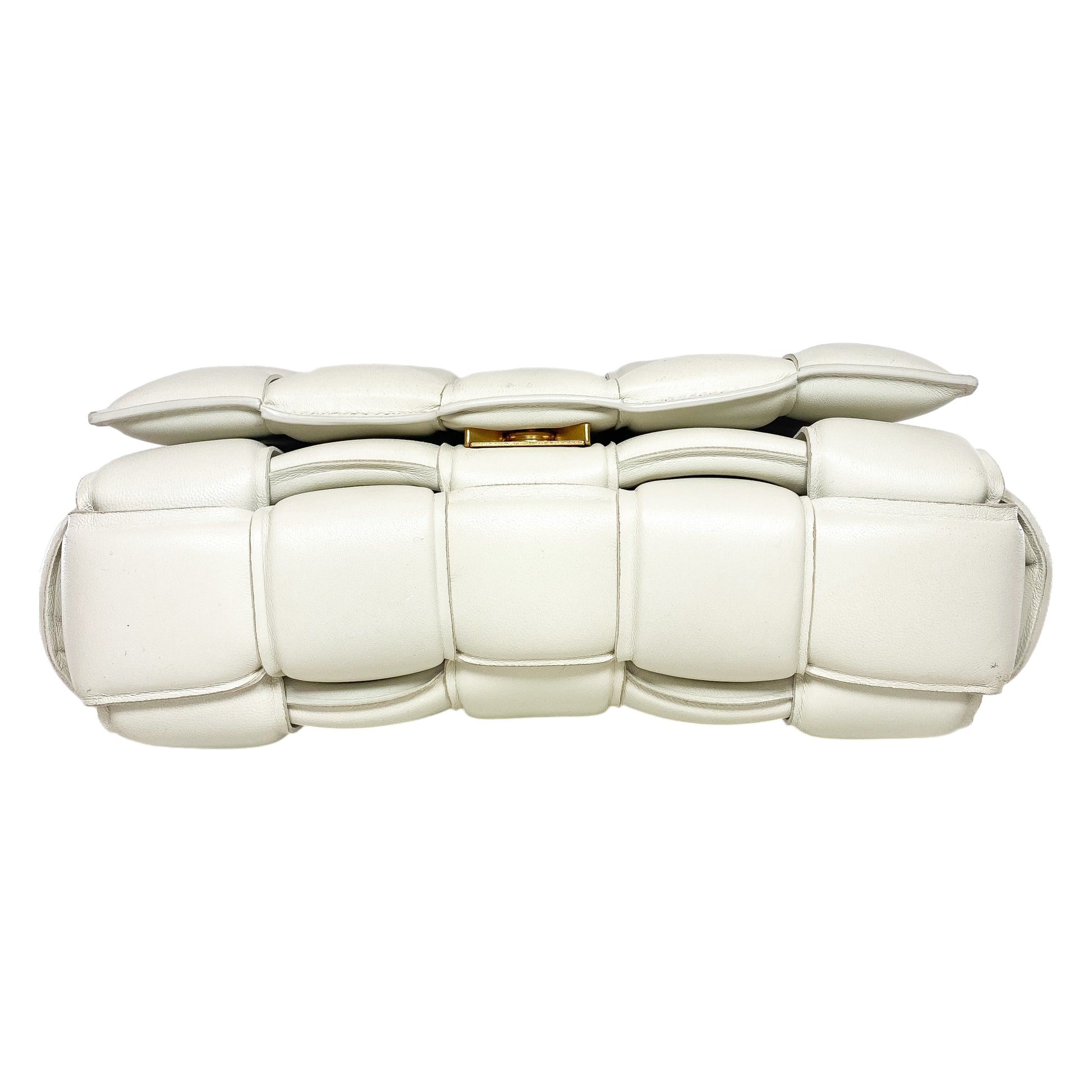 This is a Bottega Veneta White Padded Cassette Bag in lambskin leather with gold hardware. This chic cassette bag features an adjustable 17-inch white leather strap and a snap closure. The front flap opens the bag to a white leather lined interior that features a zipper pocket. This is a stylish everyday bag!