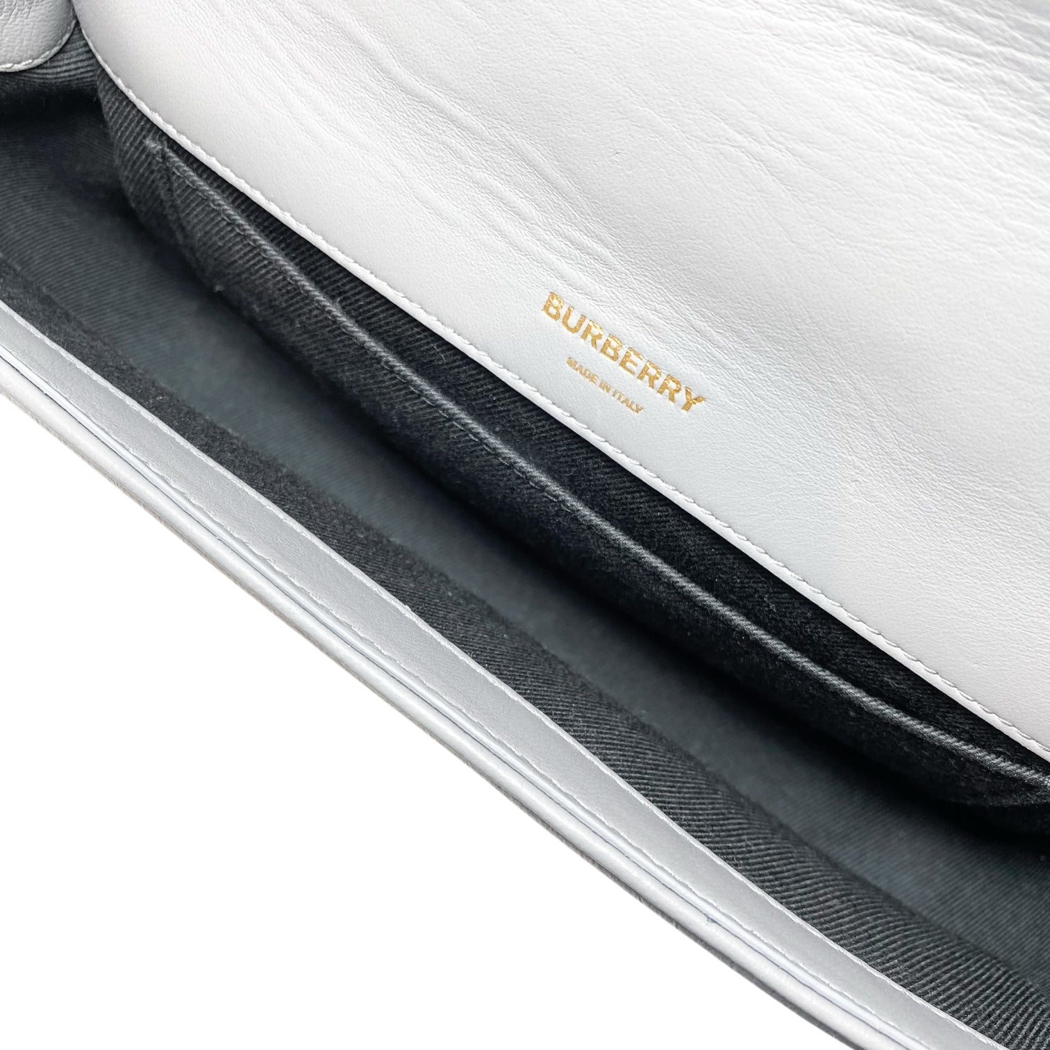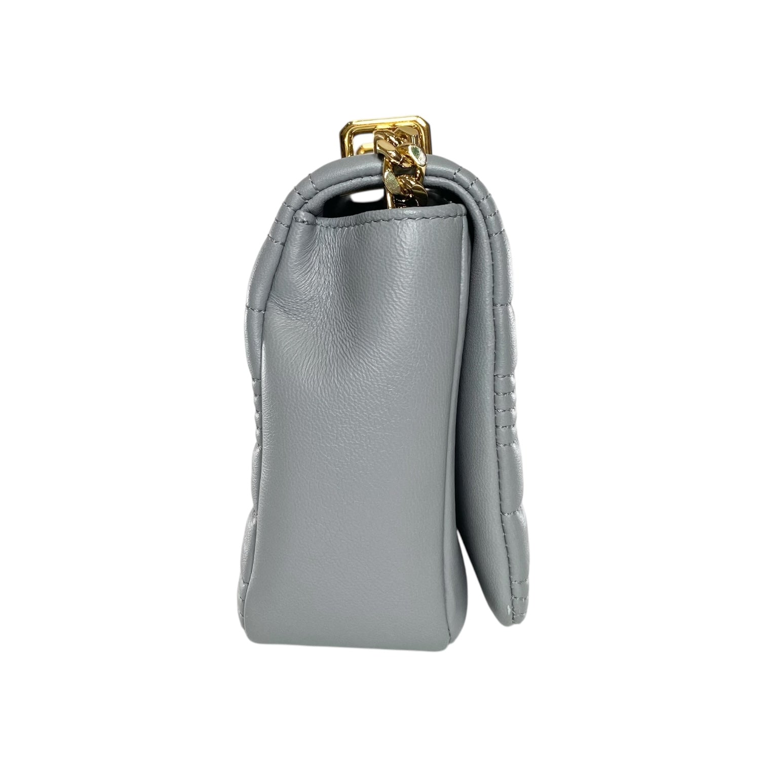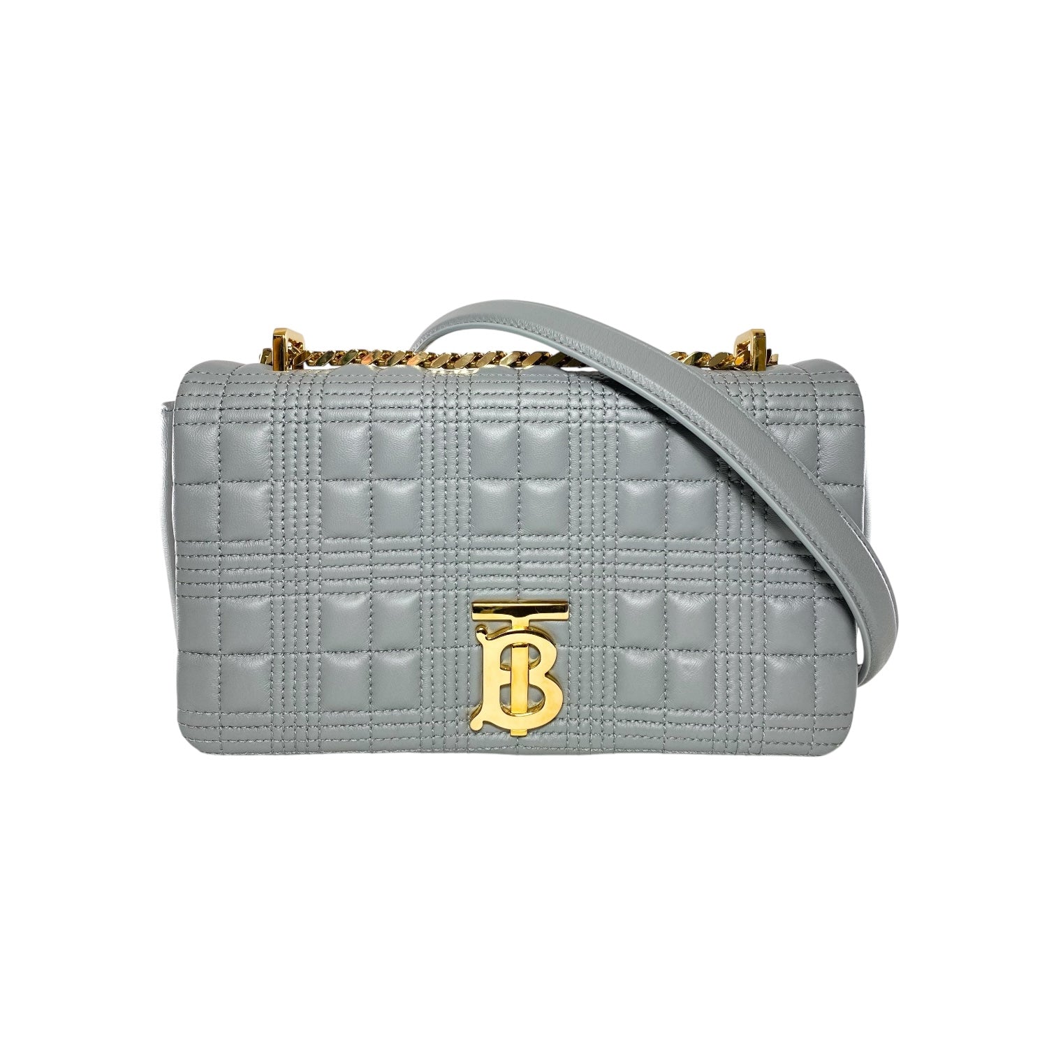 This is a Burberry Grey Quilted TB Logo Lola Flap Bag in leather with gold hardware. This stylish handbag features a 20-inch strap and the Burberry logo on the front. The interior is lined in black fabric and features a patch pocket. This is a wonderful handbag for many occasions!