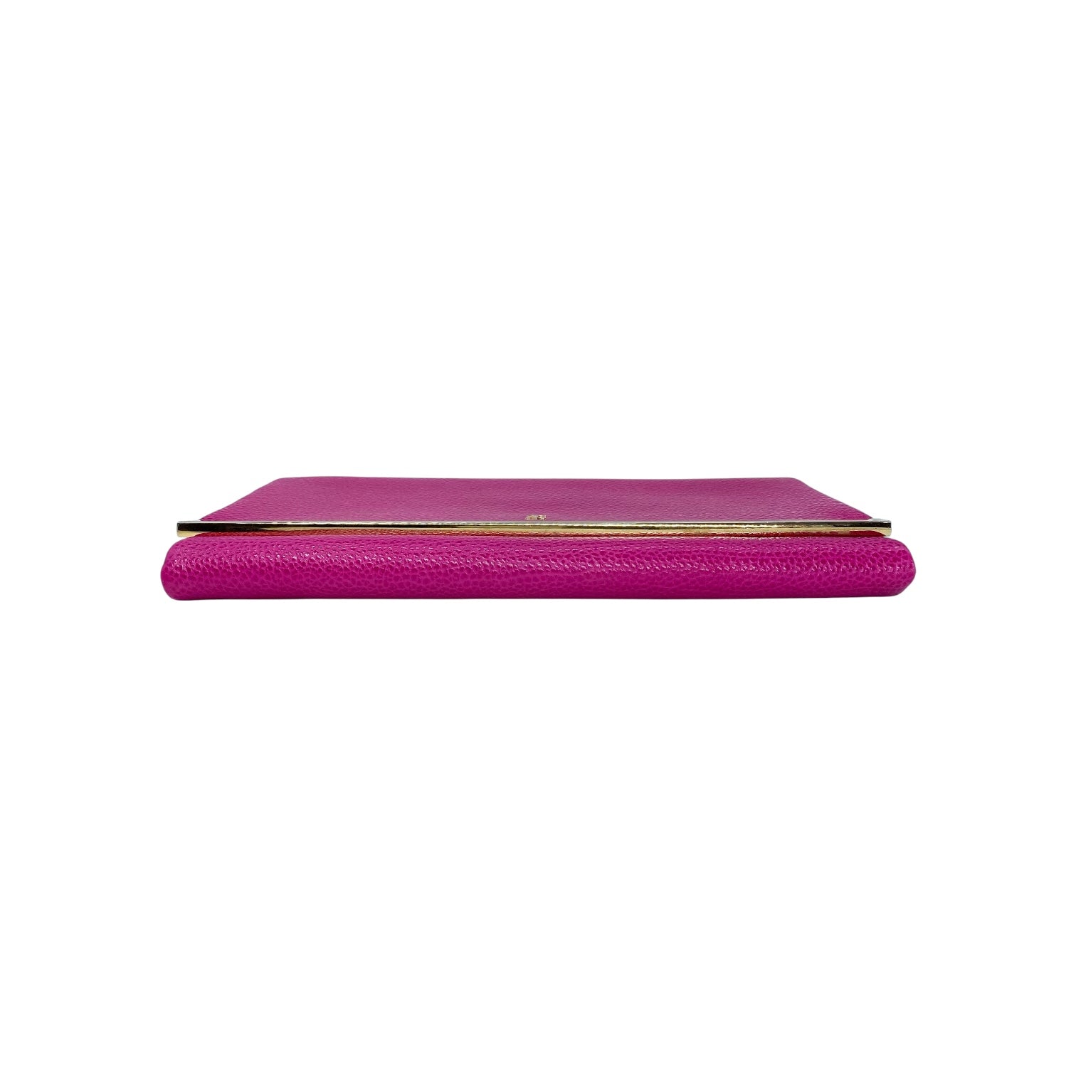 This is a Carolina Herrera Pink Clutch in pebbled leather with gold hardware. This amazing clutch features a strap and a snap closure. The interior is lined in black fabric. This is a wonderful evening accessory!