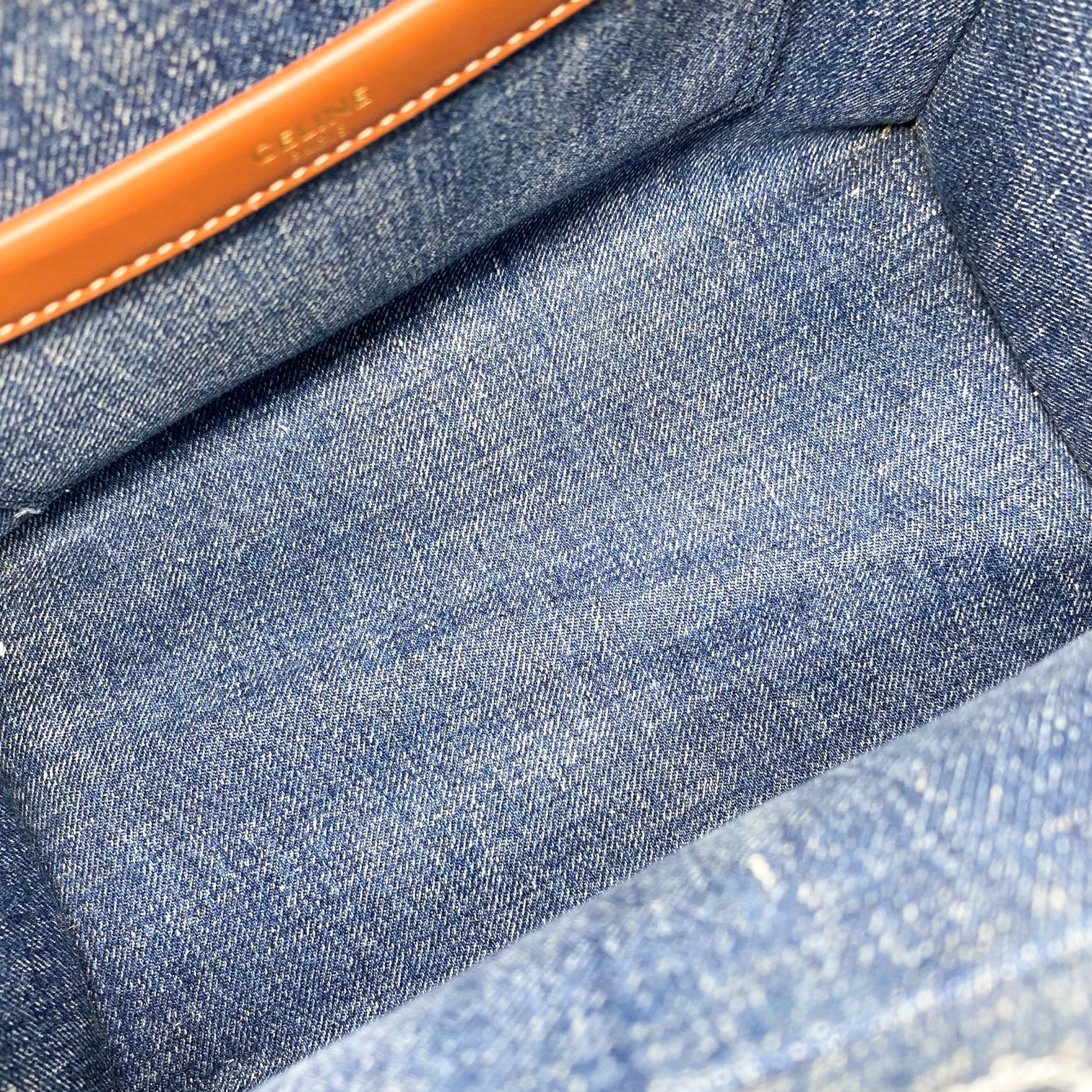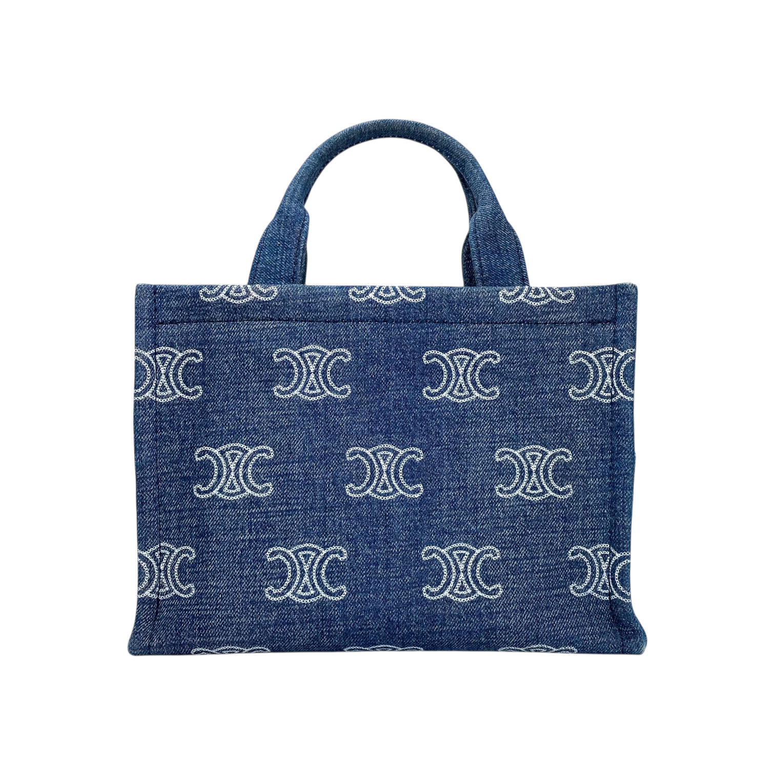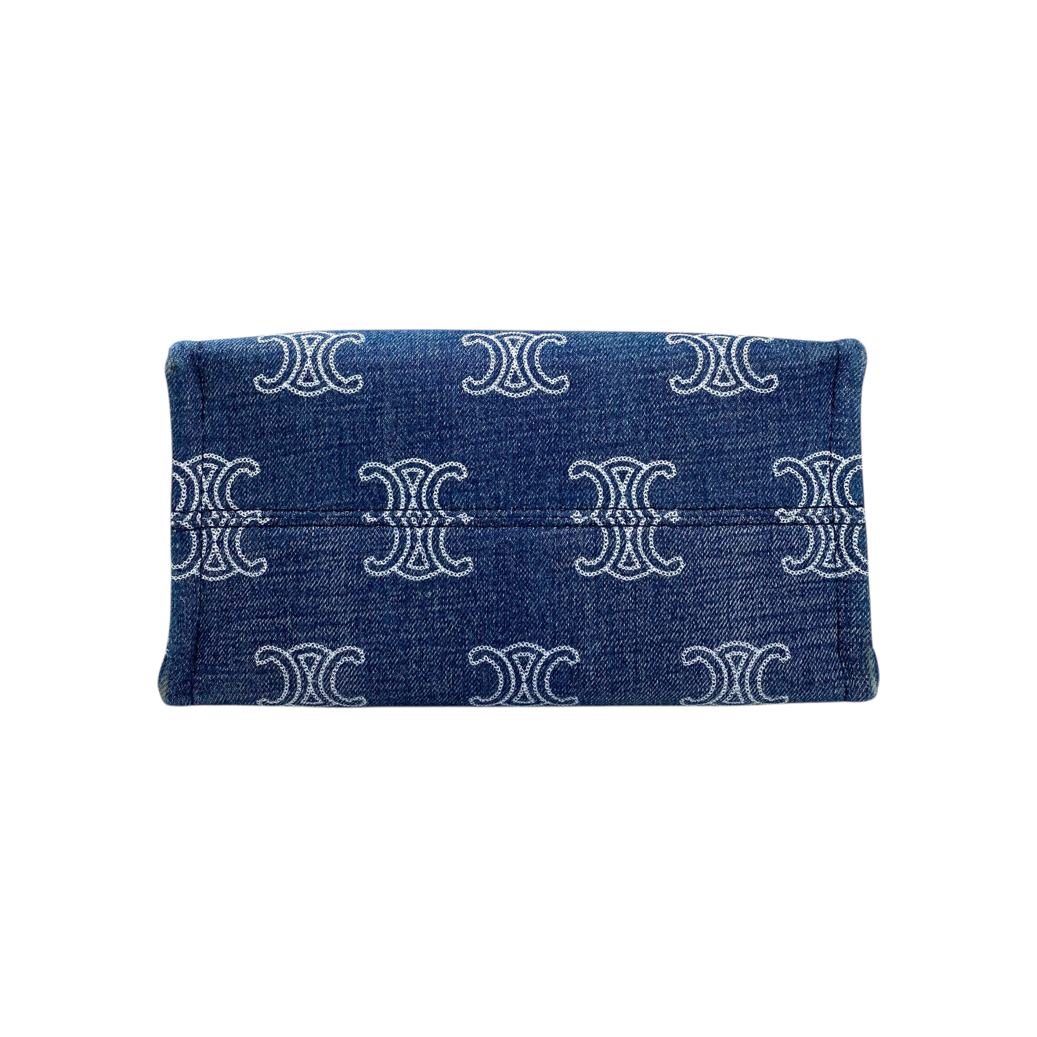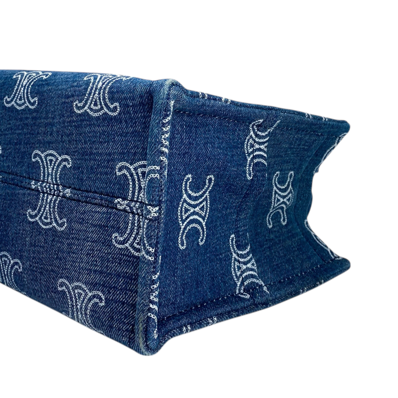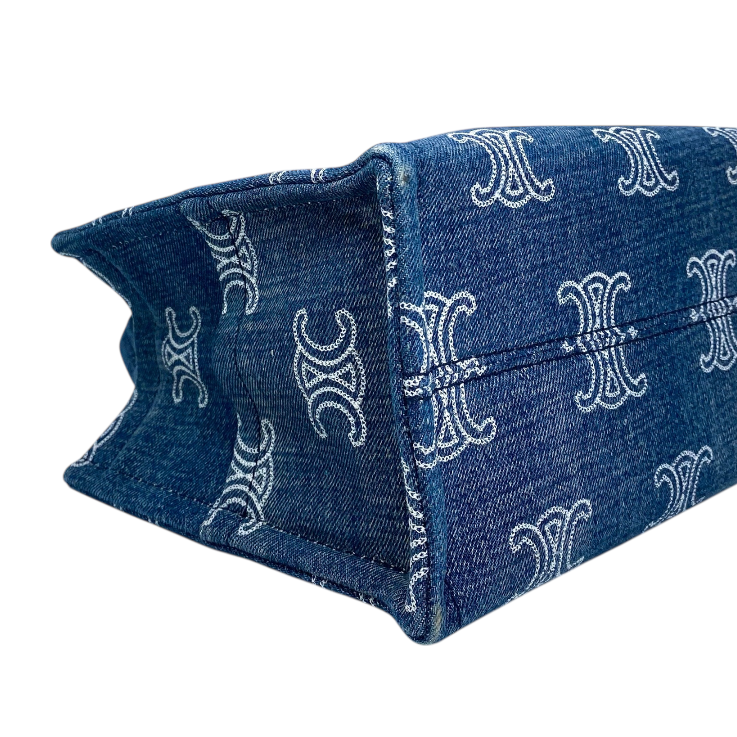 This is a small Celine Triomphe Cabas in denim with a detachable leather crossbody strap. This handbag can be worn crossbody or as a top handle, and has a spacious interior with a back patch pocket. This is an amazing bag for many occasions!