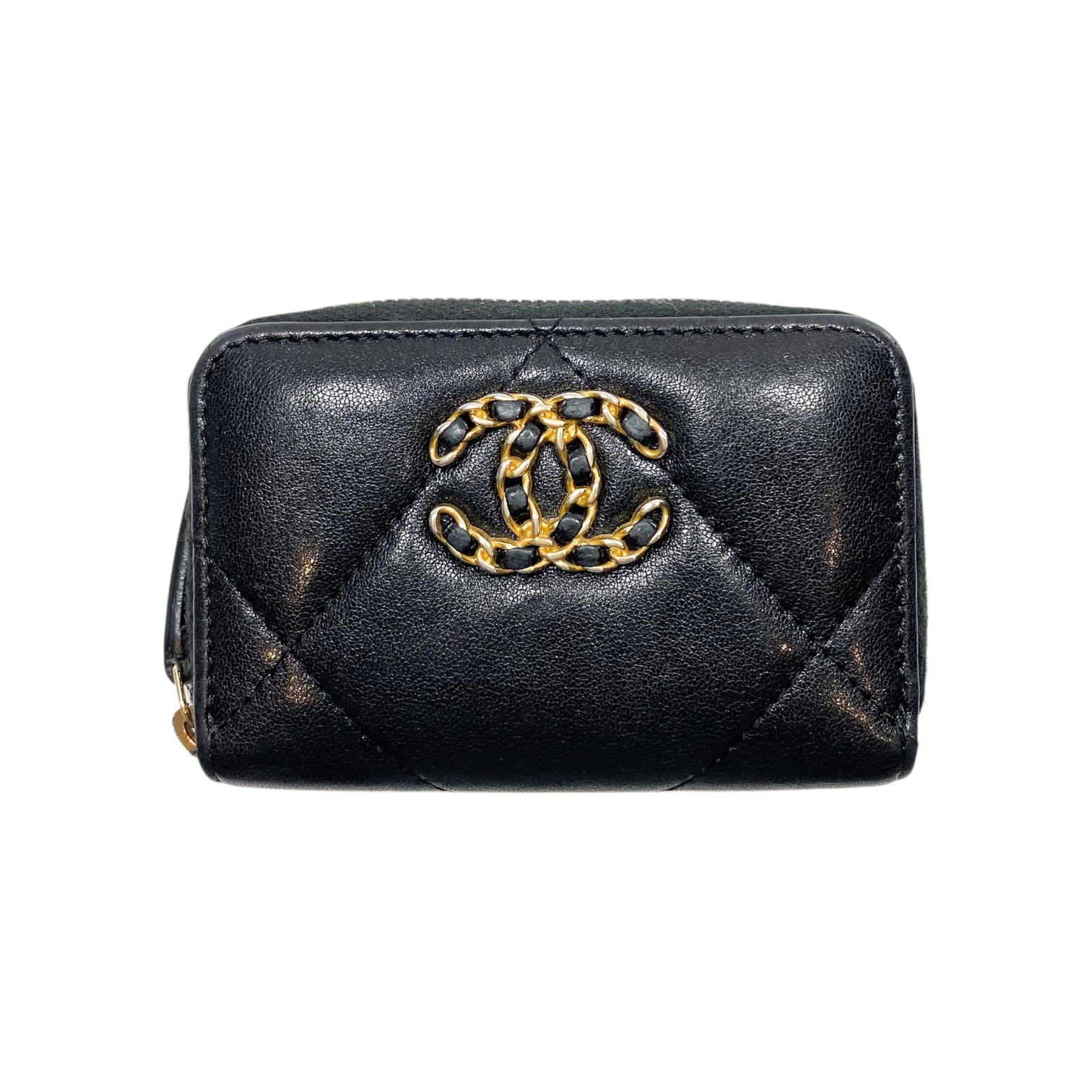 This is a Chanel 19 Black Zip Around Card Holder in lambskin leather with gold hardware. This amazing card holder features a “CC” on the front and a wrap around zip closure. The interior is lined in burgundy fabric. This is a perfect card holder for everyday use!